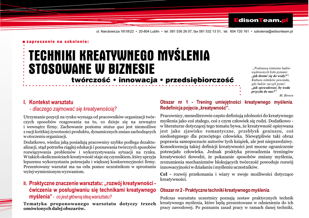 EdisonTeam.pl ul. Narutowicza 16\18\22 • 20-804 Lublin • tel. 081 536 26 07, fax 081 532 13 51, tel. 604 720 161 • [email protected] zaproszenie na szkolenie: TECHNIKI KREATYWNEGO MYŒLENIA STOSOWANE W BIZNESIE twórczoœæ • innowacja • przedsiêbiorczoœæ „Podstaw¹ istnienia ludów wêdrownych by³o pytanie: „jak dostaæ siê do wody?”. Kultura rolników powsta³a, gdy ludzie zaczêli pytaæ: „jak spowodowaæ, by woda przysz³a do nas?” M. Brown I. Kontekst warsztatu - dlaczego zajmowaæ siê kreatywnoœci¹? Obszar nr 1 - Trening umiejêtnoœci kreatywnego myœlenia. Redefinicja pojêcia „kreatywnoœæ”. Utrzymanie pozycji na rynku wymaga od pracowników organizacji twórczych sposobów reagowania na to, co dzieje siê na zewn¹trz i wewn¹trz firmy. Zachowanie poziomu status quo jest niemo¿liwe z racji krótkiej ¿ywotnoœci produktu, dynamicznych zmian zachodz¹cych w otoczeniu organizacji. Dodatkowo, wiedza jak¹ posiadaj¹ pracownicy szybko podlega dezaktualizacji, st¹d potrzeba ci¹g³ej edukacji i poznawania twórczych sposobów rozwi¹zywania problemów i wykorzystywania sytuacji na rynku. W takich okolicznoœciach kreatywnoœæ staje siê czynnikiem, który sprzyja lepszemu wykorzystaniu potencja³u i wiêkszej konkurencyjnoœci firmy. Prezentowany warsztat ma na celu pomoc uczestnikom w sprostaniu wy¿ej wymienionym wyzwaniom. Pracownicy, mened¿erowie czêsto definiuj¹ zdolnoœci do kreatywnego myœlenia jako coœ sta³ego, coœ z czym cz³owiek siê rodzi. Dodatkowo w literaturze dotycz¹cej tego tematu bywa, ¿e kreatywnoœæ opisywana jest jako zjawisko romantyczne, przeb³ysk geniuszu, coœ niedostêpnego dla przeciêtego cz³owieka. Niew¹tpliwie taki obraz poprawia samopoczucie autorów tych ksi¹¿ek, ale jest nieprawdziwy. Konsekwencj¹ takiej definicji kreatywnoœci jest mocne ograniczenie potencja³u cz³owieka. Jednak praktyka prowadzenia treningów kreatywnoœci dowodzi, ¿e pokazanie sposobów zmiany myœlenia, zrozumienia mechanizmów blokuj¹cych twórczoœæ powoduje rozwój innowacyjnoœci w dzia³aniu i myœleniu uczestników. II. Praktyczne znaczenie warsztatu: „rozwój kreatywnoœci - Cel - rozwój przekonania i wiary w swoje mo¿liwoœci dotycz¹ce kreatywnoœci. æwiczenia w pos³ugiwaniu siê technikami kreatywnego Obszar nr 2 - Praktyczne techniki kreatywnego myœlenia. myœlenia” - co jest g³ówn¹ ide¹ warsztatu? Podczas warsztatu uczestnicy poznaj¹ zestaw praktycznych technik kreatywnego myœlenia, które bêd¹ prezentowane w odniesieniu do ich Tematyka proponowanego warsztatu dotyczy trzech pracy zawodowej. Po poznaniu zasad pracy w ramach danej techniki, omówionych dalej obszarów. EdisonTeam.pl tel. 081 536 26 07, fax 081 532 13 51, tel. 604 720 161 • [email protected] uczestnicy (indywidualnie lub w zespo³ach) bêd¹ wykorzystywaæ poznan¹ strategiê do rozwi¹zania w³asnych problemów. Przedstawione techniki i metody znajduj¹ zastosowanie w nastêpuj¹cych obszarach funkcjonowania pracownika w firmie: · Praca indywidualna - zwiêkszenie pomys³owoœci, odkrycie w³asnych schematów myœlowych, poznanie technik u³atwiaj¹cych poszukiwanie rozwi¹zañ w pracy zawodowej. · Praca zespo³owa - zwiêkszenie efektywnoœci pracy zespo³ów zadaniowych\dzia³ów poprzez poznanie zasad pracy grupowego poszukiwania rozwi¹zañ, identyfikacja w³asnych sposobów prowadzenia spotkañ, udoskonalenie warsztatu w w/w zagadnieniu. · Zarz¹dzanie - zwiêkszanie: produktywnoœci, efektywnoœci pracy zespo³u, jakoœci pracy mened¿era, zarz¹dzania czasem pracy, zarz¹dzania zmian¹. · Obs³uga klienta i usprawnienia w dzia³aniu - dokonywanie zmian w us³ugach, produktach, tworzenie przewag konkurencyjnych, metody stymuluj¹ce patrzenie nie problem z perspektyw potrzeb i oczekiwañ klienta. · Sprzeda¿ - poszukiwanie nowych sposobów kontaktu z klientem, rozwój technik i umiejêtnoœci sprzeda¿y i prowadzenia rozmów. · Organizacja - podejmowanie dzia³añ dotycz¹cych zmiany, usprawnienie pracy. · Dzia³ania mened¿era - diagnozowanie i opis obecnej sytuacji zespo³u, poszukiwanie i formu³owanie rozwi¹zañ, prezentacja problemu i jego rozwi¹zania, stymulowanie zespo³u w zakresie myœlenia innowacyjnego. Cel wyposa¿enie w praktyczne techniki kreatywnego myœlenia. III. Zawartoœæ tematyczna warsztatu - jakie zagadnienia bêd¹ poruszane? 1. Techniki kreatywnego myœlenia - jakie techniki stosowane s¹ w biznesie? · · · · · · Obszar nr 3 - badanie kwestionariuszowe „Organizacja a kreatywnoœæ” Podczas szkolenia przeprowadzone jest badanie opinii uczestników dotycz¹ce ich organizacji w aspekcie kreatywnoœci. Ka¿dy z uczestników · uzupe³ni arkusz „Organizacja a kreatywnoœæ”. Wyniki wykorzystane s¹ w czêœci szkolenia - organizacyjne uwarunkowania kreatywnoœci. Analiza wyników jest dostarczona Zleceniodawcy w raporcie po szkoleniu. 2 Cel - zdefiniowanie mocnych i s³abych stron œrodowiska pracy uczestników szkolenia. Analiza - synteza. Technika oparta na podziale problemu b¹dŸ zadania i z³o¿eniu go w nowy sposób. Przyk³adowe zastosowanie techniki- analiza cyklu obs³ugi klienta, analiza pracy w zespole, praca indywidualna nad nowymi pomys³ami. Analiza pola si³y (K. Lewin). Technika oparta na poszukiwaniu rozwi¹zania w oparciu o przewidywanie si³ hamuj¹cych i stymuluj¹cych nasze dzia³anie. Przyk³adowe zastosowanie techniki - przygotowanie do: trudnych rozmów, negocjacji, prezentacji, zebrania. Techniki wizualnego rozwi¹zywania problemu. Techniki oparte na zobrazowaniu problemu za pomoc¹ symboli i poszukiwaniu rozwi¹zañ. Przyk³adowe zastosowanie technik - grupowana dyskusja w zespole roboczym. Scenariusz rozwoju organizacji\zespo³u. Metoda oparta na budowaniu cyklu rozwoju z przewidywaniem faz i kryzysów. Przyk³adowe zastosowanie techniki - zarz¹dzanie zmian¹ w organizacji\zespole. Mapa myœli. Technika oparta o zasadê mapowania myœli i uruchomienia ci