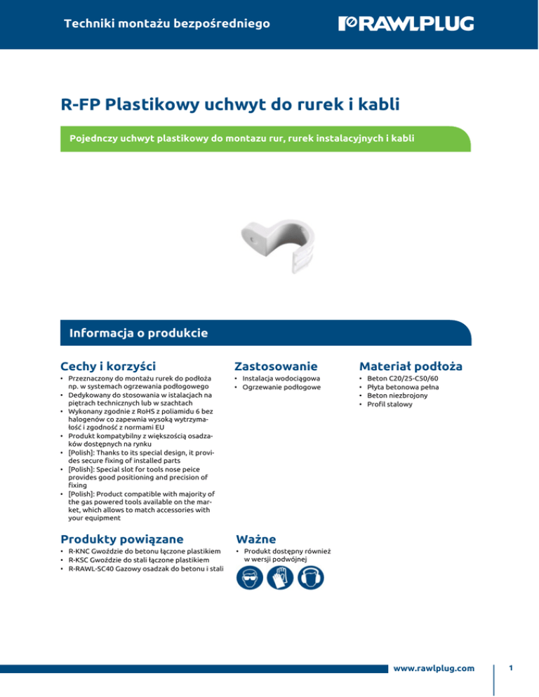 Techniki montażu bezpośredniego R-FP Plastikowy uchwyt do rurek i kabli Pojednczy uchwyt plastikowy do montazu rur, rurek instalacyjnych i kabli Informacja o produkcie Cechy i korzyści Zastosowanie Materiał podłoża • Przeznaczony do montażu rurek do podłoża np. w systemach ogrzewania podłogowego • Dedykowany do stosowania w istalacjach na piętrach technicznych lub w szachtach • Wykonany zgodnie z RoHS z poliamidu 6 bez halogenów co zapewnia wysoką wytrzyma łość i zgodność z normami EU • Produkt kompatybilny z większością osadza ków dostępnych na rynku • [Polish]: Thanks to its special design, it provi des secure fixing of installed parts • [Polish]: Special slot for tools nose peice provides good positioning and precision of fixing • [Polish]: Product compatible with majority of the gas powered tools available on the mar ket, which allows to match accessories with your equipment • Instalacja wodociągowa • Ogrzewanie podłogowe • • • • Produkty powiązane Ważne • R-KNC Gwoździe do betonu łączone plastikiem • R-KSC Gwoździe do stali łączone plastikiem • R-RAWL-SC40 Gazowy osadzak do betonu i stali • Produkt dostępny również w wersji podwójnej Beton C20/25-C50/60 Płyta betonowa pełna Beton niezbrojony Profil stalowy www.rawlplug.com 1 Techniki montażu bezpośredniego Dane Techniczne Średnica wewnętrzna Ilość w opakowaniu Waga opakowania jed nostkowego Waga opakowania zbior czego [mm] [szt] kg kg R-FP-16 16 100 0.02 0.35 5906675222967 R-FP-18 18 100 0.04 0.40 5906675222974 R-FP-20 20 100 0.05 0.45 5906675223247 R-FP-22 22 100 0.06 0.55 5906675223513 R-FP-25 25 100 0.07 0.65 5906675223551 R-FP-28 28 100 0.08 0.75 5906675223599 R-FP-32 32 50 0.04 0.85 5906675223605 Indeks EAN www.rawlplug.com 2