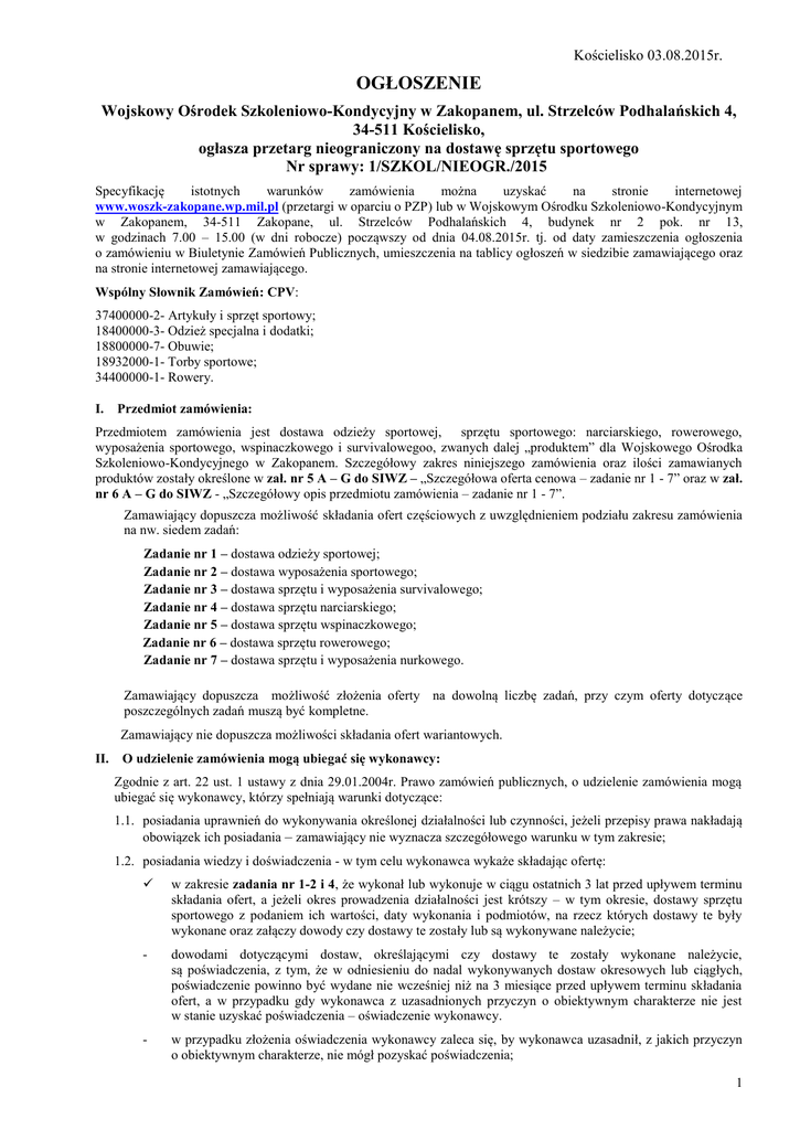 Kościelisko 03.08.2015r. OGŁOSZENIE Wojskowy Ośrodek Szkoleniowo-Kondycyjny w Zakopanem, ul. Strzelców Podhalańskich 4, 34-511 Kościelisko, ogłasza przetarg nieograniczony na dostawę sprzętu sportowego Nr sprawy: 1/SZKOL/NIEOGR./2015 Specyfikację istotnych warunków zamówienia można uzyskać na stronie internetowej www.woszk-zakopane.wp.mil.pl (przetargi w oparciu o PZP) lub w Wojskowym Ośrodku Szkoleniowo-Kondycyjnym w Zakopanem, 34-511 Zakopane, ul. Strzelców Podhalańskich 4, budynek nr 2 pok. nr 13, w godzinach 7.00 – 15.00 (w dni robocze) począwszy od dnia 04.08.2015r. tj. od daty zamieszczenia ogłoszenia o zamówieniu w Biuletynie Zamówień Publicznych, umieszczenia na tablicy ogłoszeń w siedzibie zamawiającego oraz na stronie internetowej zamawiającego. Wspólny Słownik Zamówień: CPV: 37400000-2- Artykuły i sprzęt sportowy; 18400000-3- Odzież specjalna i dodatki; 18800000-7- Obuwie; 18932000-1- Torby sportowe; 34400000-1- Rowery. I. Przedmiot zamówienia: Przedmiotem zamówienia jest dostawa odzieży sportowej, sprzętu sportowego: narciarskiego, rowerowego, wyposażenia sportowego, wspinaczkowego i survivalowegoo, zwanych dalej „produktem” dla Wojskowego Ośrodka Szkoleniowo-Kondycyjnego w Zakopanem. Szczegółowy zakres niniejszego zamówienia oraz ilości zamawianych produktów zostały określone w zał. nr 5 A – G do SIWZ – „Szczegółowa oferta cenowa – zadanie nr 1 - 7” oraz w zał. nr 6 A – G do SIWZ - „Szczegółowy opis przedmiotu zamówienia – zadanie nr 1 - 7”. Zamawiający dopuszcza możliwość składania ofert częściowych z uwzględnieniem podziału zakresu zamówienia na nw. siedem zadań: Zadanie nr 1 – dostawa odzieży sportowej; Zadanie nr 2 – dostawa wyposażenia sportowego; Zadanie nr 3 – dostawa sprzętu i wyposażenia survivalowego; Zadanie nr 4 – dostawa sprzętu narciarskiego; Zadanie nr 5 – dostawa sprzętu wspinaczkowego; Zadanie nr 6 – dostawa sprzętu rowerowego; Zadanie nr 7 – dostawa sprzętu i wyposażenia nurkowego. Zamawiający dopuszcza możliwość złożenia oferty na dowolną liczbę zadań, przy czym oferty dotyczące poszczególnych zadań muszą być kompletne. Zamawiający nie dopuszcza możliwości składania ofert wariantowych. II. O udzielenie zamówienia mogą ubiegać się wykonawcy: Zgodnie z art. 22 ust. 1 ustawy z dnia 29.01.2004r. Prawo zamówień publicznych, o udzielenie zamówienia mogą ubiegać się wykonawcy, którzy spełniają warunki dotyczące: 1.1. posiadania uprawnień do wykonywania określonej działalności lub czynności, jeżeli przepisy prawa nakładają obowiązek ich posiadania – zamawiający nie wyznacza szczegółowego warunku w tym zakresie; 1.2. posiadania wiedzy i doświadczenia - w tym celu wykonawca wykaże składając ofertę: w zakresie zadania nr 1-2 i 4, że wykonał lub wykonuje w ciągu ostatnich 3 lat przed upływem terminu składania ofert, a jeżeli okres prowadzenia działalności jest krótszy – w tym okresie, dostawy sprzętu sportowego z podaniem ich wartości, daty wykonania i podmiotów, na rzecz których dostawy te były wykonane oraz załączy dowody czy dostawy te zostały lub są wykonywane należycie; - dowodami dotyczącymi dostaw, określającymi czy dostawy te zostały wykonane należycie, są poświadczenia, z tym, że w odniesieniu do nadal wykonywanych dostaw okresowych lub ciągłych, poświadczenie powinno być wydane nie wcześniej niż na 3 miesiące przed upływem terminu składania ofert, a w przypadku gdy wykonawca z uzasadnionych przyczyn o obiektywnym charakterze nie jest w stanie uzyskać poświadczenia – oświadczenie wykonawcy. - w przypadku złożenia oświadczenia wykonawcy zaleca się, by wykonawca uzasadnił, z jakich przyczyn o obiektywnym charakterze, nie mógł pozyskać poświadczenia; 1 - w celu oceny spełniania w/w warunku zamawiający żąda przedstawienia dokumentu wskazanego w pkt VI. A ppkt. 2 SIWZ. 1.3. dysponowania odpowiednim potencjałem technicznym oraz osobami zdolnymi do wykonania zamówienia – zamawiający nie wyznacza szczegółowego warunku w tym zakresie; 1.4. sytuacji ekonomicznej i finansowej – zamawiający nie wyznacza szczegółowego warunku w tym zakresie. III. Opis sposobu dokonywania oceny spełnienia warunku udziału w postępowaniu: 1. Ocena spełniania warunków udziału w postępowaniu zostanie dokonana zgodnie z formułą „spełnia - nie spełnia", w oparciu o oświadczenia i dokumenty określone w pkt. VI.A i VI.B SIWZ, które wykonawca jest zobowiązany złożyć wraz z ofertą (z zastrzeżeniem art. 26 ust. 3 Ustawy) . 2. W zakresie zadania nr 1, zadania nr 2, zadania nr 4, spełnieniem przez wykonawcę warunku udziału w postępowaniu w zakresie posiadania wiedzy i doświadczenia będzie wykazanie przez wykonawcę w zał. nr 8 do SIWZ co najmniej dwóch należycie wykonanych dostaw sprzętu sportowego o wartości nie mniejszej niż 50.000,00 zł brutto każda wraz z dowodami określającymi czy dostawy te zostały wykonane należycie – w zakresie zadań, na które wykonawca składa ofertę. - przez jedną dostawę sprzętu sportowego zamawiający rozumie sumę dostaw w ramach jednej umowy o wartości nie mniejszej niż 50.000,00 zł. Jako sprzęt sportowy zamawiający rozumie – odzież sportowa, buty sportowe, wyposażenie sportowe, sprzęt wspinaczkowy lub sprzęt narciarski) W przypadku składania ofert na więcej niż jedno zadanie (w zakresie zadań 1 – 3), zamawiający dopuszcza wykazanie łącznie jedynie dwóch dostaw przy zachowaniu warunku, że wartość każdej z dwóch wykazanych dostaw nie może być mniejsza niż 50.000,00 zł brutto. IV. Oświadczenia i dokumenty jakie wykonawcy mają dostarczyć wraz z ofertą: A . Oświadczenia i dokumenty potwierdzające spełnienie warunków udziału w postępowaniu: 1. Oświadczenie wykonawcy o spełnianiu warunków udziału w postępowaniu – zgodnie z art. 22 ust. 1 Ustawy, stanowiące z