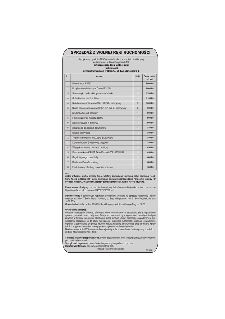 SPRZEDA¯ Z WOLNEJ RÊKI RUCHOMOŒCI Syndyk masy upad³oœci TEXON Marta Skrobich w upad³oœci likwidacyjnej we Wroc³awiu, ul. Braci Gierymskich 160 og³asza sprzeda¿ z wolnej rêki ruchomoœci przechowywanych w Brzegu, ul. Kusociñskiego 1 L.p. Nazwa Iloœæ Cena netto za 1 szt. 1. Ploter Canon iPF750 1 5.000,00 2. Urz¹dzenie wielofunkcyjne Canon IR3225N 1 3.000,00 3. Sekretarzyk - biurko eklektyczne z nadstawk¹ 1 1.200,00 4. Sofa skórzana naro¿na, bia³a 1 1.100,00 5. Stó³ drewniany rozsuwany (100x180-240), ciemny br¹z 2 1.000,00 6. Biurko nowoczesne naro¿ne 92,0x1,0+1,0x0,6), ciemny br¹z 2 900,00 7. Kredens ArtDeco 5-drzwiowy 1 900,00 8. Fotel skórzany do masa¿u, czarny 1 900,00 9. kredens ArtDeco 4-drzwiowy 1 900,00 Maszyna do bindowania dokumentów 1 850,00 10. 11. Bie¿nia elektryczna 1 800,00 12. Telefon komórkowy Sony Xperia Z1, u¿ywany 1 800,00 13. Komplet biurowy 2-miejscowy z rega³em 1 700,00 14. Wieszak ubraniowy z lustrem, rzeŸbiony 1 650,00 15. Ekspres do kawy KRUPS EA8050 model FDB14501111M 1 650,00 16. Rega³ 18-przegrodowy, du¿y 1 600,00 17. Kredens ArtDeco 2-drzwiowy 1 600,00 18. Fotel skórzany obrotowy z wysokim oparciem 1 500,00 oraz: meble antyczne, biurka, krzes³a, fotele, telefony komórkowe Samsung Solid, Samsung Trend, Sony Xperia S, Nokia 301.1 nowe i u¿ywane, telefony bezprzewodowe Panasonic, laptopy HP Probook model 4720s u¿ywane, laptopy Samsung model NP.-RV510-A03PL u¿ywane. Pe³en wykaz dostêpny na stronie internetowej http://www.ardobiejewska.pl/ oraz na stronie https://www.facebook.com/events/1455079708090141/ Pisemne oferty w zamkniêtych kopertach z dopiskiem: „Przetarg na sprzeda¿ ruchomoœci” nale¿y dorêczyæ na adres TEXON Marta Skrobich, ul. Braci Gierymskich 160, 51-640 Wroc³aw, do dnia 10.09.2014 r. Otwarcie ofert nast¹pi w dniu 12.09.2014 r. w Brzegu przy ul. Kusociñskiego 1 o godz. 16.00. Oferta winna zawieraæ: dok³adne oznaczenie oferenta, oferowan¹ cenê, oœwiadczenie o zapoznaniu siê z regulaminem sprzeda¿y, oœwiadczenie o zwi¹zaniu ofert¹ przez czas okreœlony w regulaminie i zobowi¹zaniu siê do zawarcia w terminie i w miejscu okreœlonym przez syndyka umowy sprzeda¿y, oœwiadczenie o niewnoszeniu zastrze¿eñ co do stanu faktycznego i prawnego ruchomoœci upad³ego, oœwiadczenie oferenta, i¿ zobowi¹zuje siê pokryæ wszelkie koszty zwi¹zane ze sprzeda¿¹, oraz ¿e dokona wp³aty ca³oœci ceny przed zawarciem umowy sprzeda¿y, potwierdzenie wp³aty wadium. Wadium w wysokoœci 10% ceny wywo³awczej nale¿y wp³aciæ na rachunek bankowy masy upad³oœci nr 30 1090 2167 0000 0001 1931 4440. Sprzeda¿ zostanie przeprowadzona zgodnie z regulaminem, który syndyk przeœle zainteresowanym, po podaniu adresu email. Syndyk zastrzega sobie prawo odwo³ania sprzeda¿y bez podania przyczyny. Dodatkowe informacje pod numerem tel. 603 132 365. Przetargi www.ardobiejewska.pl OR140411