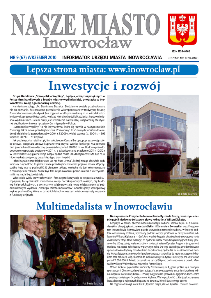 ISSN 1734-0462 NR 9 (67) WRZESIEŃ 2010 INFORMATOR URZĘDU MIASTA INOWROCŁAWIA (EGZEMPLARZ BEZPŁATNY) Lepsza strona miasta: www.inowroclaw.pl Inwestycje i rozwój Grupa Handlowa „Staropolskie Wędliny”, będąca jedną z największych w Polsce firm handlowych z branży mięsno-wędliniarskiej, otworzyła w Inowrocławiu swoją ogólnopolską siedzibę. Kamienica u zbiegu ulic: Stanisława Staszica i Studziennej została przebudowana nie do poznania. Zastosowano przeszklenia wkomponowane w tradycyjną fasadę. Powstał nowoczesny budynek (na zdjęciu), w którym mieści się m.in. ośrodek szkoleniowy dla pracowników spółki, w skład której wchodzi kilkadziesiąt hurtowni mięsno-wędliniarskich. Celem firmy jest stworzenie największej i najbardziej efektywnej sieci hurtowni mięsa i przetworów mięsnych w Polsce. „Staropolskie Wędliny” to nie jedyna firma, która się rozwija w naszym mieście. Powstają także nowe przedsiębiorstwa. Porównując ilość nowych wpisów do ewidencji działalności gospodarczej w 2004 r. i 2009 r. widać wzrost (tj. 2004 r. – 699 wpisów, 2009 r. – 753 wpisy). Jak podaje portal retailnet.pl, firma Acteeum Central Europe, poprzez swoją spółkę celową, podpisała umowę kupna terenu przy ul. Wojska Polskiego. Ma powstać tam galeria handlowa o łącznej powierzchni ponad 30.000 m kw. Budowa prawdopodobnie rozpoczęta zostanie w 2011 r., a zakończona na przełomie 2011 r. i 2012 r. W inowrocławskiej galerii swoje sklepy będzie miało 60-70 najemców. Ma być m.in. hipermarket spożywczy oraz sklep typu dom i ogród I choć są takie przedsiębiorstwa jak np. huta „Irena”, której zarząd złożył do sądu wniosek o upadłość, to jednak wiele przedsiębiorstw coraz prężniej działa. W przypadku huty warto podkreślić, iż złożenie takiego wniosku nie jest równoznaczne z zamknięciem zakładu. Może być tak, że po zawarciu porozumienia z wierzycielami firma nadal będzie istniała. Właściciele wielu inowrocławskich firm często korzystają ze wsparcia z Unii Europejskiej. To są dziesiątki milionów euro np. na zakup nowych maszyn, czy budowę hal produkcyjnych, a co się z tym wiąże powstają nowe miejsca pracy. W październikowym wydaniu „Naszego Miasta Inowrocław” opublikujemy szczegółowy wykaz podmiotów, które w ostatnich latach w naszym mieście uzyskały wsparcie z funduszy unijnych. Fot. Beata Zarzycka Multimedalista w Inowrocławiu Fot. Beata Zarzycka Na zaproszenie Prezydenta Inowrocławia Ryszarda Brejzy, w naszym mieście gościł niedawno światowej sławy lekkoatleta Wilson Kipketer. Kenijczyk, w pobliżu obecnie modernizowanego stadionu, spotkał się m. in. z inowrocławskimi olimpijczykami: Janem Jaskólskim i Edmundem Borowskim oraz Prezydentem Inowrocławia. Rozmawiano przede wszystkim o remoncie stadionu, w którego podłoże wmurowany zostanie, wykonany podczas wizyty sportowca w naszym mieście, odlew stóp Wilsona Kipketera. – Gościłem w wielu krajach, ale nigdzie nie poproszono mnie o odciśnięcie stóp. Mam nadzieję, że będzie to dobry znak dla rywalizujących tutaj sportowców, którzy pobiją wiele rekordów – stwierdził Wilson Kipketer. Przypomnijmy, remont stadionu ma zostać zakończony w przyszłym roku. Do tego czasu będą zmodernizowane i przebudowane trybuny. Poza boiskiem do piłki nożnej będzie też m. in. ośmiotorowa bieżnia lekkoatletyczna z nawierzchnią poliuretanową, stanowiska do rzutu oszczepem i dyskiem oraz pchnięcia kulą, skocznia do skoków wzwyż i o tyczce. Inwestycja ma kosztować ponad 11.000.000 zł. Miasto pozyskało na ten cel 30 proc. dofinansowania z Urzędu Marszałkowskiego Województwa Kujawsko-Pomorskiego. Wilson Kipketer pojechał też do Szkoły Podstawowej nr 4, gdzie spotkał się z młodymi sportowcami. Chętnie rozdawał tam autografy, a nawet wspólnie z uczniami przebiegł jedno okrążenie na szkolnej bieżni. – Wielką przyjemność sprawia mi oglądanie dzieci, które z pasją uprawiają sport – podsumował Kipketer. Warto podkreślić, iż Kenijczyk uznawany jest za jednego z najlepszych biegaczy na 800 m w historii światowego sportu. Na zdjęciu (od lewej) Jan Jaskólski, Ryszard Brejza, Wilson Kipketer i Edmund Borowski. 2 nr 9 (67) Nieruchomości Prezydent Inowrocławia ogłasza: - drugi przetarg pisemny nieograniczony na sprzedaż zabudowanej nieruchomości położonej przy ul. Rąbińskiej 1, o łącznej powierzchni 0,3735 ha. Cena – 653.000 zł. Zgodnie z miejscowym planem zagospodarowania przestrzennego jest to teren przeznaczony pod usługi związane z działalnością uzdrowiska, kultury, rozrywki oraz usług handlowych wskazanych w statucie uzdrowiska, gastronomicznych, obiektów pensjonatowo - sanatoryjnych i administracyjnych. W przypadku niezagospodarowania nieruchomości w terminie do 31 grudnia 2014 r. w sposób określony w ofercie, kupujący będzie zobowiązany do zapłacenia na rzecz miasta kary umownej w wysokości 653.000 zł, - przetarg ustny nieograniczony na sprzedaż nieruchomości położonej przy ul. Bolesława Chrobrego, o łącznej powierzchni 0,0318 ha. Cena – 11.000 zł. Zgodnie z miejscowym planem zagospodarowania przestrzennego jest to teren przeznaczony pod budownictwo mieszkaniowe jednorodzinne, - przetarg ustny nieograniczony na sprzedaż nieruchomości położonej przy ul. Św. Ducha, o powierzchni 0,0253 ha. Cena – 64.000 zł. Zgodnie z miejscowym planem zagospodarowania przestrzennego jest to teren przeznaczony pod mieszkalnictwo i usługi nieuciążliwe, - przetarg ustny nieograniczony na sprzedaż nieruchomości położonych przy ul. Górniczej, o łącznej powierzchni 0,0336 ha. Cena – 100.000 zł. Zgodnie z miejscowym planem zagospodarowania przestrzennego jest to teren przeznaczony pod usługi komercyjne. UWAGA: Bliższych informacji na temat przetargów można uzyskać w Wydziale Gospodarki Przestrzennej i Nieruchomości UMI, ul. Prezydenta Franklina Rooseve