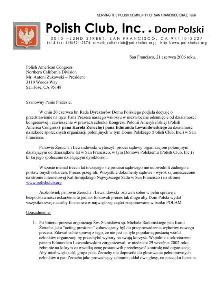 SERVING THE POLISH COMMUNITY OF SAN FRANCISCO SINCE 1926 Polish Club, Inc. Dom Polski 3040 –22ND STREET, SAN FRANCISCO, CA 94110-3227 tel & fax: 415/821-2574; e-mail; [email protected]; http://www.polishclub.org San Francisco, 21 czerwca 2006 roku. Polish American Congress Northern California Division Mr. Antoni Zukowski – President 3110 Woods Way San Jose, CA 95148 Szanowny Panie Prezesie, W dniu 20 czerwca br. Rada Dyrektorów Domu Polskiego podjeła decyzję o przedstawienie na ręce Pana Prezesa naszego wniosku w niezwłoczne odsunięcie od działalności kongresowej i zawieszenie w prawach członka Kongresu Polonii Amerykańskiej (Polish America Congress) pana Karola Żeruchę i pana Edmunda Lewandowskiego za działalność na szkodę społecznych organizacji polonijnych w tym Domu Polskiego (Polish Club, Inc.) w San Francisco. Panowie Żerucha i Lewandowski wytoczyli proces sądowy organizacjom polonijnym dzialającym od dziesiątków lat w San Francisco, w tym Domowi Polskiemu (Polish Club, Inc.) i kilku jego społecznie działającym dyrektorom. W czasie niemal trzech lat toczącego się procesu sądowego nie udowodnili żadnego z postawionych oskarżeń. Proces przegrali. Wszystkie dokumenty sądowe i wyrok są umieszczone na stronie internetowej Kalifornijskiego Najwyższego Sadu w San Francisco i na stronie www.polishclub.org Aczkolwiek panowie Zerucha i Lewandowski zdawali sobie w pełni sprawę z bezpodstawności oskarżenia to jednak forsowali proces tak dlugo aby Dom Polski wydał wszystkie swoje zasoby finansowe w największej części zdeponowane w banku POLAM. Uzasadnienie: 1. Po śmierci prezesa organizacji Św. Stanisława sp. Michała Radomskiego pan Karol Żerucha jako “acting president” zobowiązany był do przeprowadzenia wyborów nowego prezesa. Zdawał sobie sprawę z tego, że nie jest na tyle popularną postacią wśród członków organizacji by przechylić wybory na swoją korzyść. Wspólnie z sekretarzem panem Edmundem Lewandowskim zorganizowali w niedziele 29 września 2002 roku zebranie na którym za wszelką cenę postanowili przechwycić kontrolę nad organizacją. Aby mieć większość, grupa pana Żeruchy nie dopusciła do głosowania pełnoprawnych członków a pan Zerucha jako prowadzący zebranie oddał dwa głosy, na początku liczenia Page 2 of 2 jeden i na zakończenie oddał swój drugi głos, łamiąc w ten sposób remis. Fałszując wynik głosowania doprowadził do rozbicia w organizacji. Sędzia wytknął nieprawidłowe głosowanie i nakazał głosowanie powtórzyć, które grupa pana Żeruchy przegrała.. 2. Sędzia w wyroku nakazał zwrócić nielegalnie przejęte przez organizację panów Żeruchy i Lewandowskiego pieniądze do prawowitej organizacji. 3. 27 listopada 2002 roku pan Edmund Leandowski napisał donos do “Public Inquiry Unit” Stanu California w Sacramento w którym oskażył Radę Dyrektorów Domu Polskiego o defraudację na około $2,000,000.00. 4. 23 lutego 2003 roku podczas zebrania Rady Dyrektorów Domu Polskiego goniec szeryfa dostarczył akt oskarżenia podpisany przez panow Karola Zeruche i Edmunda Lewandowskiego bez upoważnienia organizacji. 5. Rada Dyrektorów upoważniła do rozmów pojednawczych pana Franciszka Jasińskiego Wiceprezesa Domu Polskiego. Mimo dobrej woli z naszej strony i propozycji kompromisu do porozumienia nie doszlo. W spotkaniu udział wzięli ks. prof. Andrzej Wożnicki, ks. Dr. Czesław Rybacki i pan Karol Żerucha. 6. W marcu 2004 roku odbyło się specjalne zebranie Oddziału Kongresu Polonii Amerykańskiej na Północną Kalifornię mające na celu doprowadzenie do porozumienia. Dom Polski wyraził chęć przystąpienia do rozmów natychmiast po wycofaniu z Sądu aktu oskarżenia. Pani prof. Jean M. Novak reprezentująca stronę oskarżającą stwierdziła, że aby sprawę wycofać musi porozumieć się z panem Wallace Ożogiem z Chicago. Zaś pan inż. Zdzisław Zakrzewski sugerował rozmowy stron bez wycofania aktu oskarżenia. 7. Pan Edmund Lewandowski, w przeszłości przez dwie kadencje pełnił funkcję prezesa Kongresu Polonii Amerykańskiej Oddziału na Północną Kalifornię; a w czasie podpisywania oskarżenia był wiceprezesem w/w Oddzialu Kongresu. W świetle przytoczonych powyżej faktów, Rada Dyrektorów Domu Polskiego w San Francisco wnioskuje o zawieszenie członkostwa w Kongresie Polonii Amerykańskiej panów Karola Żeruchy i Edmunda Lewandowskiego do czasu zwrotu organizacjom kosztów jakie poniosły z tytułu nieuzasadnionych oskarżeń. Rada Dyrektorów stoi na stanowisku, że nie można pobłażać osóbom, które swoimi bezpodstawnymi oskarżeniami doprowadziły do podziałów w polonijnym środowisku i do wielkiego uszczerbku finansowego w społecznych organizacjach. W imieniu Rady Dyrektorów Domu Polskiego Waldemar Glodek – Prezes Cc.: - Mr. Frank J. Spula – National President of the Polish American Congress; - Mrs. Krystyna Chciuk – President of the Polish Society of California Lodge 7 Polish National Alliance; - Mrs. Zofia Szicker – President of the Polish Literary and Dramatic Circle, Inc.; - Mr. Maciej Glodek – President of the St. Stanislaus Benevolent Society, Inc. POLISH CLUB, INC. 3040 –22ND STREET, SAN FRANCISCO, CA 94110-3227 Tel/Fax.: 415/821-2574; e-mail; [email protected]; http://www.polishclub.org