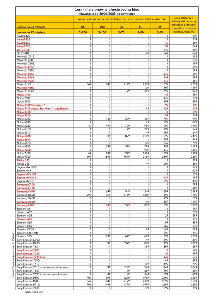 Cennik telefonów w ofercie Jedna Idea obowiązuje od 20/06/2005 do odwołania Cennik Telefonów Jedna Idea_T_200605_1 kwota deklarowana w ofercie Jedna Idea z rachunkiem i Jedna Idea mix umowa na 24 miesiące 200 100 75 umowa na 12 miesięcy 2x200 2x100 2x75 Alcatel 320 Alcatel 332 Alcatel 556 Alcatel 735 LG C1100 LG C3310 Motorola C115 Motorola C200 Motorola C205 Motorola C350 Motorola C385 Motorola C550 Motorola E365 Motorola V220 Motorola V3 Motorola V500 Motorola V547 Nokia 1100 Nokia 2600 Nokia 3100 Nokia 3100 Star Wars ™ Nokia 3100 zestaw Star Wars ™ z gadżetami Nokia 3410 Nokia 3510i Nokia 6020 Nokia 6100 Nokia 6230 Nokia 6310i Nokia 6510 Nokia 6600 Nokia 6610 Nokia 6610i Nokia 6820 Nokia 7250i Nokia 7650 Nokia 9300 Philips 162 Philips 355 Sagem MW 3026 Sagem MYX-1 Sagem MYX 5M Sagem MYX 5-2 Sagem MYX-7 Samsung C100 Samsung C110 Samsung D410 Samsung D500 Samsung X450 Samsung X600 Samsung E700 Siemens A51 Siemens A52 Siemens A55 Siemens A65 Siemens C60 Siemens C65 Siemens CX65 Siemens S55+foto Siemens S65 Sony-Ericsson K300i Sony-Ericsson K700i Sony-Ericsson T68i Sony-Ericsson T105 Sony-Ericsson T230 Sony-Ericsson T230+foto Sony-Ericsson T290i Sony-Ericsson T610 Sony-Ericsson T610 + zestaw samochodowy Sony-Ericsson T630 Sony-Ericsson T630+ zestaw samochodowy Sony-Ericsson P800 Sony-Ericsson P900 Sony-Ericsson P910i Sony-Ericsson Z200 Ceny w zł z VAT 1 1 1 1 1 1 1 1 1 1 1 1 1 1 349 1 1 1 1 1 1 1 1 1 1 1 49 1 1 1 1 1 1 1 49 1199 1 1 1 1 1 1 1 1 1 1 299 1 1 1 1 1 1 1 1 1 1 1 1 1 1 1 1 1 1 1 1 1 1 1 799 1349 999 1 1 1 1 1 1 1 1 1 1 1 1 1 1 1 849 1 1 1 1 1 1 1 1 1 149 1 499 1 1 99 1 1 299 1 749 1699 1 1 1 1 1 1 1 1 1 699 799 1 1 149 1 1 1 1 1 1 1 1 199 1 99 1 1 1 1 1 1 99 1 49 999 1849 1499 1 1 1 1 1 1 1 1 1 1 1 1 1 1 1 1149 1 199 1 1 1 1 1 1 1 299 1 799 99 1 899 1 1 599 1 999 1999 1 1 1 1 1 1 1 1 1 949 1149 1 1 299 1 1 1 1 1 1 1 1 499 1 599 1 1 1 1 1 1 249 99 149 1299 2199 1799 1 50 25 2x50 2x25 1 1 1 1 1 49 1 1 1 1 1 1 1 1 1399 99 399 1 1 1 1 19 1 1 499 49 999 299 49 1199 1 149 799 999 1499 2199 1 49 1 1 1 1 1 1 1 1 249 1399 1 49 999 1 1 1 1 1 1 99 1 699 49 899 199 1 1 1 1 199 549 299 349 1999 2399 1999 199 1 1 49 99 149 349 1 1 1 1 1 149 149 149 1599 599 699 49 179 199 99 129 1 99 799 399 1299 499 199 1599 399 549 999 1149 1699 2399 1 299 1 1 1 149 299 1 1 1399 1599 299 859 1299 1 1 29 1 99 369 549 299 899 399 1199 399 1 49 149 49 499 749 499 599 2199 2599 2199 399 cena telefonu w Jednej Idei na kartę oraz poza promocją, również przy kwocie deklarowanej 10 199 359 599 849 599 649 159 239 199 399 599 699 899 859 1799 1199 949 299 399 399 399 429 299 369 999 699 1999 849 649 2499 949 799 1499 1499 1999 2599 299 599 279 239 399 499 499 599 599 2399 1799 599 1199 1999 199 299 299 349 399 649 699 849 1299 599 1299 599 329 399 579 399 799 1049 599 699 3299 3599 2399 799