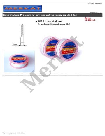 Informacje o produkcie Utworzono 02-03-2017 Linka stalowa Premium (w powłoce polimerowej, szpula 50m) M er ka t Cena : 25,0000 zł Wygenerowano w programie www.oscGold.com