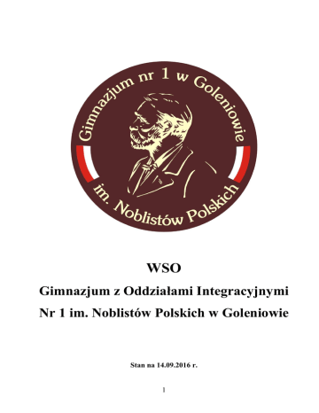 WSO Gimnazjum z Oddziałami Integracyjnymi Nr 1 im. Noblistów Polskich w Goleniowie Stan na 14.09.2016 r. 1 Załącznik nr 2 Wewnątrzszkolny System Oceniania (WSO) Gimnazjum z Oddziałami Integracyjnymi Nr 1 im. Noblistów Polskich w Goleniowie Podstawa prawna: Rozdział 3a Ustawy z dnia 7 września 1991 r. o systemie oświaty ( Dz. U. z 2015 r., poz. 2156) Rozporządzenie Ministra Edukacji Narodowej z dnia 10 czerwca 2015 r. w sprawie szczegółowych warunków i sposobu oceniania, klasyfikowania i promowania uczniów i słuchaczy w szkołach publicznych ( Dz. U. z 2015 r. ,poz. 843) ze zmianami §1 1. WSO reguluje zasady oceniania, klasyfikowania i promowania uczniów oraz przeprowadzania egzaminów i sprawdzianów w Gimnazjum Nr 1. 2. Zasady z religii (etyki) regulują odrębne przepisy. §2 1. Ocenianie wewnątrzszkolne jest to nieodłączna część procesu uczenia się i nauczania, służąca wspieraniu rozwoju uczniów i ich motywowaniu. To także proces diagnozowania, gromadzenia informacji, ich wartościowania i interpretowania. 2. Ocenianie wewnątrzszkolne ma na celu: 1) sprawdzenie i ocenianie wiadomości i umiejętności ucznia, 2) ujednolicenie zasad i kryteriów oceniania przez poszczególnych nauczycieli, 3) informowanie ucznia o poziomie jego osiągnięć edukacyjnych i jego zachowaniu oraz postępach w tym zakresie, 4) motywowanie ucznia do dalszych postępów w nauce i zachowaniu i udzielanie wskazówek do samodzielnego planowania własnego rozwoju, 5) doskonalenie procesu nauczania i metod pracy dydaktyczno-wychowawczej nauczycieli, 6) uchylony, 7) udzielanie uczniowi pomocy w nauce poprzez przekazanie mu informacji o tym, co zrobił dobrze i jak powinien się uczyć, 8) dostarczanie rodzicom i nauczycielom informacji o postępach i trudnościach w nauce i zachowaniu ucznia oraz o szczególnych uzdolnieniach ucznia. 3. Metody oceniania WSO: 1) ogólnoszkolna debata, 2) ankiety kierowane do nauczycieli, uczniów, rodziców, 3) praca w zespołach przedmiotowych w celu usuwania niedociągnięć WSO. 2 §3 1. Elementami wewnątrzszkolnego systemu oceniania są: 1) wymagania edukacyjne oraz informowanie o nich uczniów i rodziców (prawnych opiekunów), 2) bieżące ocenianie, klasyfikowanie śródroczne zajęć edukacyjnych, śródroczne zachowanie, 3) klasyfikowanie roczne zajęć edukacyjnych, roczne zachowanie, 4) sposoby sprawdzania postępów uczniów, 5) kryteria ocen zachowania, 6) przeprowadzanie egzaminów klasyfikacyjnych, 7) warunki i tryb uzyskania wyższych niż przewidywane rocznych ocen klasyfikacyjnych z obowiązkowych i dodatkowych zajęć edukacyjnych oraz rocznej oceny klasyfikacyjnej zachowania, 8) warunki i sposób przekazywania rodzicom (prawnym opiekunom) informacji o postępach i trudnościach w nauce i zachowaniu ucznia oraz o szczególnych uzdolnieniach ucznia. §4 Wymagania edukacyjne na poszczególne oceny 1. Wymagania edukacyjne należy rozumieć jako oczekiwane osiągnięcia uczniów, polegające na skutecznym działaniu w określonych sytuacjach. Obowiązująca skala stopni obejmuje pięć pozytywnych wartości. 2. Wymagania odpowiadać będą poszczególnym stopniom: 1) dopuszczający, 2) dostateczny, 3) dobry, 4) bardzo dobry, 5) celujący. 3. Wymagania konieczne (K) na ocenę dopuszczający obejmują elementy treści nauczania: 1) niezbędne w uczeniu danego przedmiotu, 2) potrzebne w życiu, 3) wskazują one na braki w opanowaniu wiadomości i umiejętności określonych w podstawach programowych, a także na opanowaniu w znacznym stopniu wiadomości podstawowych. 4. Wymagania podstawowe (P) na stopień dostateczny obejmują elementy treści: 1) najważniejsze w uczeniu danego przedmiotu, 2) łatwe dla ucznia nawet mało zdolnego, 3) o niewielkim stopniu złożoności, a więc przystępne, 4) często powtarzające się w programie nauczania, 5) dające się wykorzystać w szkolnych sytuacjach i pozaszkolnych, 6) określone programem nauczania na poziomie nie przekraczającym wymagań zawartych w podstawach programowych, 7) proste i uniwersalne umiejętności, w mniejszym zakresie wiadomości. 5. Wymagania rozszerzające (R) na stopień dobry obejmują następujące treści: 1) istotne w strukturze przedmiotu, 2) bardziej złożone niż treści zaliczone do wymagań podstawowych, 3) przydatne ale nie niezbędne w opanowaniu treści z danego przedmiotu i innych przedmiotów szkolnych, 4) użyteczne w szkolnej i pozaszkolnej działalności, 3 5) o zakresie przekraczającym wymagania zawarte w podstawach programowych, 6) wymagające umiejętności stosowania wiadomości w sytuacjach typowych, według wzorów (przykładów) znanych z lekcji i podręczników. 6. Wymagania dopełniające (D) na stopień bardzo dobry obejmują pełny zakres treści określonych programem nauczania. Są to więc treści: 1) złożone, trudne, ważne do opanowania, 2) wymagające korzystania z różnych źródeł, 3) umożliwiające rozwiązywanie problemów, 4) pośrednio użyteczne w życiu pozaszkolnym, 5) jest to pełne opanowanie programu. 7. Wymagania wykraczające (W) na stopień celujący obejmują treści: 1) znacznie wykraczające poza program nauczania, 2) stanowiące efekt samodzielnej pracy ucznia, 3) wynikające z indywidualnych zainteresowań, 4) zapewniające pełne wykorzystanie wiadomości dodatkowych. 8. Wymagania edukacyjne określono na podstawie standardów osiągnięć ustalonych centralnie, programów nauczania i kryteriów występujących w literaturze. 9. Załącznikiem nr 1 WSO są wymagania programowe na poszczególne oceny z przedmiotów nauczania. §5 Szczegółowe zasady oceniania Wewnątrzszkolnego Systemu Oceniania (WSO) w Gimnazjum Nr1. 1. Podział roku szkolnego. Rok szkolny dzielimy na dwa semestry: - pierwszy semestr kończy się 15 stycznia; - drugi semestr rozpoczyna się 16 stycznia. 2. Formy sprawdzania wiedzy i umiejętności. 2.1 Formy pisemne a) prace klasowe – jęz. polski, jęz. angielski, jęz. niemiecki, biologia,