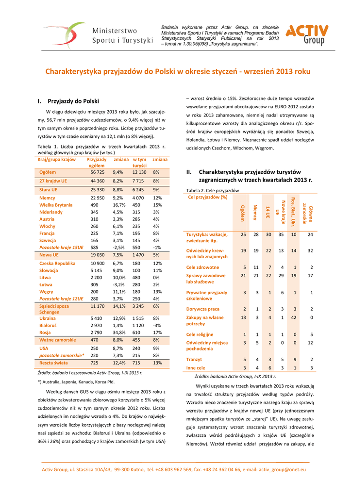 Badania wykonane przez Activ Group. na zlecenie Ministerstwa Sportu i Turystyki w ramach Programu Badań Statystycznych Statystyki Publicznej na rok 2013 – temat nr 1.30.05(098) „Turystyka zagraniczna”. Charakterystyka przyjazdów do Polski w okresie styczeń - wrzesień 2013 roku I. – wzrost średnio o 15%. Zeszłoroczne duże tempo wzrostów Przyjazdy do Polski W ciągu dziewięciu miesięcy 2013 roku było, jak szacuje- my, 56,7 mln przyjazdów cudzoziemców, o 9,4% więcej niż w tym samym okresie poprzedniego roku. Liczbę przyjazdów turystów w tym czasie oceniamy na 12,1 mln (o 8% więcej). Tabela 1. Liczba przyjazdów w trzech kwartałach 2013 r. według głównych grup krajów (w tys.) Kraj/grupa krajów Przyjazdy zmiana w tym zmiana ogółem turyści Ogółem 56 725 9,4% 12 130 8% 25 330 8,8% 6 245 9% Niemcy Wielka Brytania Niderlandy Austria Włochy Francja Szwecja Pozostałe kraje 15UE Nowa UE 22 950 490 345 310 260 225 165 585 19 030 9,2% 16,7% 4,5% 3,3% 6,1% 7,1% 3,1% -2,5% 7,5% 4 070 450 315 285 235 195 145 550 1 470 12% 15% 3% 4% 4% 8% 4% -1% 5% Czeska Republika Słowacja Litwa Łotwa Węgry Pozostałe kraje 12UE Sąsiedzi spoza Schengen Ukraina Białoruś Rosja Ważne zamorskie 10 900 5 145 2 200 305 200 280 11 170 6,7% 9,0% 10,0% -3,2% 11,1% 3,7% 14,1% 180 100 480 280 180 250 3 245 12% 11% 0% 2% 13% 4% 6% 5 410 2 970 2 790 470 12,9% 1,4% 34,8% 8,0% 1 515 1 120 610 455 8% -3% 17% 8% USA pozostałe zamorskie* Reszta świata 250 220 725 8,7% 7,3% 12,4% 240 215 715 9% 8% 13% Źródło: badania i oszacowania Activ Group, I-IX 2013 r. *) Australia, Japonia, Kanada, Korea Płd. II. Charakterystyka przyjazdów turystów zagranicznych w trzech kwartałach 2013 r. Tabela 2. Cele przyjazdów Cel przyjazdów (%) Główne zamorskie Stara UE udzielonych Czechom, Włochom, Węgrom. Ros, Biał., Ukr. 8% Holandia, Łotwa i Niemcy. Nieznacznie spadł udział noclegów Nowe kraje UE 7 715 śród krajów europejskich wyróżniają się ponadto: Szwecja, 14 UE 8,2% kilkuprocentowe wzrosty dla analogicznego okresu r/r. Spo- Niemcy 44 360 w roku 2013 zahamowane, niemniej nadal utrzymywane są Ogółem 27 krajów UE wywołane przyjazdami obcokrajowców na EURO 2012 zostało Turystyka: wakacje, zwiedzanie itp. 25 28 30 35 10 24 Odwiedziny krewnych lub znajomych 19 19 22 13 14 32 5 11 7 4 1 2 Sprawy zawodowe lub służbowe 21 21 22 29 19 17 Prywatne przyjazdy szkoleniowe 3 3 1 6 1 1 Dorywcza praca 2 1 2 3 3 2 13 3 4 1 42 0 Cele religijne 1 1 1 1 0 5 Odwiedziny miejsca pochodzenia 3 5 2 0 0 12 Tranzyt 5 4 3 5 9 2 Inne cele 3 4 6 3 1 3 Cele zdrowotne Zakupy na własne potrzeby Źródło: badania Activ Group, I-IX 2013 r. Wyniki uzyskane w trzech kwartałach 2013 roku wskazują Według danych GUS w ciągu ośmiu miesięcy 2013 roku z na trwałość struktury przyjazdów według typów podróży. obiektów zakwaterowania zbiorowego korzystało o 5% więcej Wzrosło nieco znaczenie turystyczne naszego kraju za sprawą cudzoziemców niż w tym samym okresie 2012 roku. Liczba wzrostu przyjazdów z krajów nowej UE (przy jednoczesnym udzielonych im noclegów wzrosła o 4%. Do krajów o najwięk- mniejszym spadku turystów ze „starej” UE). Na uwagę zasłu- szym wzroście liczby korzystających z bazy noclegowej należą guje systematyczny wzrost znaczenia turystyki zdrowotnej, nasi sąsiedzi ze wschodu: Białoruś i Ukraina (odpowiednio o zwłaszcza wśród podróżujących z krajów UE (szczególnie 36% i 26%) oraz pochodzący z krajów zamorskich (w tym USA) Niemców). Wzrósł również udział przyjazdów na zakupy, ale Activ Group, ul. Staszica 10A/43, 99-300 Kutno, tel. +48 603 962 569, fax. +48 24 362 04 66, e-mail: [email protected] jedynie za sprawą znaczącego jego skoku w grupie wschodnich imieniu firmy) oraz związane z obsługą transportu (chodzi tu sąsiadów (głównie Rosji). Udział przyjazdów biznesowych zma- głównie o przewóz towarów). Ich udział wyniósł odpowiednio lał kolejny rok z rzędu, spadł również odsetek przejazdów 35% i 26%. Wielkość segmentu kongresowo-konferencyjno- tranzytowych oraz „innych celów”. targowego nie zmieniła się (ok. 13%). Więcej zmian widzimy w przypadku poszczególnych kra- Tabela 3. Długość pobytu jów lub grup krajów. Dla krajów „starej Unii” (poza Niemcami) pochodzenia. Spadek udziału „innych celów” wśród Niemców i Źródło: badania Activ Group, I-IX 2013 r wzrósł, natomiast zmalał odsetek przyjazdów biznesowych oraz tranzytowych. Niemcy nieco ograniczyli przyjazdy w odwiedziny oraz w „innych celach”, natomiast częściej przyjeż- 54 29 16 1 47 36 16 1 5,0 4,9 37 43 19 1 5,7 Główne zamorskie dżali w celach zdrowotnych oraz odwiedzali miejsca swojego 1 do 3 nocl. 4 do 7 nocl. 8 do 28 Ponad 4 tyg. Średnia liczba noclegów gdzie udział przyjazdów typowo turystycznych znacznie Ro., Biał., Ukr. i tranzytowych. Odwrotnie jest w grupie krajów „nowej Unii”, Nowe kraje UE 14 UE Niemcy Liczba noclegów (%) lach zdrowotnych oraz spadek – turystyczno-wypoczynkowych Ogółem widzimy wzrost udziału przyjazdów w odwiedziny oraz w ce- 70 21 9 0 84 12 3 1 16 28 46 10 3,4 2,4 12,8 odwiedzających z pozostałych krajów „starej Unii” należy wią- W badanym okresie 2013 roku średnia długość pobytu tu- zać z ich nietypowo wysoką liczbą w roku ubiegłym, związaną z rystów w Polsce wyniosła ok. 5 noclegów (więcej niż w 2012 uczestnictwem rezydentów tych krajów w mistrzostwach r.- 3,8). Średnią długość pobytu zwiększyli wszystkich obcokra- EURO 2012. Jeśli idzie o kraje naszych wschodnich sąsiadów jowcy, za wyjątkiem przybyszów z krajów zamorskich. Reguła, (Rosja, Białoruś, Ukraina), widzimy znaczny wzrost udziału że przyjazdy drogą lotniczą wiążą się z dłuższym pobytem w przyjazdów w celu zakupów na własne potrzeby, mniejszy – Polsce potwierdziła się i tym razem (6,4 noclegu – wobec 3,4 typowo turystycznych i w odwiedziny, a spadek – przyja