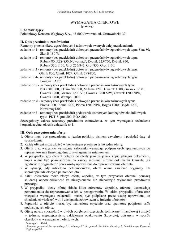 Południowy Koncern Węglowy S.A. w Jaworznie WYMAGANIA OFERTOWE (przetarg) I. Zamawiający: Południowy Koncern Węglowy S.A., 43-600 Jaworzno, ul. Grunwaldzka 37 II. Opis przedmiotu zamówienia: Remonty przenośników zgrzebłowych i taśmowych zwanych dalej urządzeniami: zadanie nr 1 - remonty (bez przekładni) dołowych przenośników zgrzebłowych typu: Skat 80; Skat E 180 W. zadanie nr 2 - remonty (bez przekładni) dołowych przenośników zgrzebłowych typu: Rybnik 80, PZS-850„Nowomag”, Rybnik 225/750, Rybnik 950, Rybnik 330/1100, Grot 255/842, Grot 850, Grot 1100. zadanie nr 3 - remonty (bez przekładni) dołowych przenośników zgrzebłowych typu: Glinik 800, Glinik 1024, Glinik 298/800. zadanie nr 4- remonty (bez przekładni) dołowych przenośników zgrzebłowych typu: Longwall AFC. zadanie nr 5 - remonty (bez przekładni) dołowych przenośników taśmowych typu: PTG 50/1000, PTGm 50/1000, Mifama 1200, Gwarek 1000, Gwarek 1200J, Gwarek 1200, Gwarek 1200 VP, Gwarek 1200 MW, Gwarek 1200 NPD, Gwarek 1400, Wampol 1000. zadanie nr 6 - remonty (bez przekładni) dołowych przenośników taśmowych typu: Pioma1000, Pioma 1200, Pioma 1200 NPD, Bogda 1000; Bogda 1200, Nowomag1200. zadanie nr 7 - remonty (bez przekładni) podawarek taśmowych kombajnów chodnikowych typu: PDT-Sigma 800, BOA 800. Szczegółowy zakres rzeczowy przedmiotu zamówienia, w tym wymagania techniczne i organizacyjne, określa załącznik nr 1. III. Opis przygotowania oferty: 1. Oferta musi być sporządzona w języku polskim, pismem czytelnym i posiadać datę jej sporządzenia. 2. KaŜdy oferent moŜe złoŜyć w konkretnym przetargu tylko jedną ofertę. 3. Oferta oraz wszystkie wymagane załączniki wymagają podpisu osób uprawnionych do reprezentowania firmy, zgodnie z wymaganiami ustawowymi. 4. W przypadku, gdy oferent dołącza do oferty jako załącznik kopię jakiegoś dokumentu, kopia winna być poświadczona na kaŜdej zapisanej stronie dokumentu klauzulą „za zgodność z oryginałem” przez osoby uprawnione do reprezentowania oferenta. 5. W sytuacji, gdy udzielono pełnomocnictw, oferta winna zawierać oryginały lub kserokopie udzielonych pełnomocnictw. 6. Kilku oferentów moŜe złoŜyć ofertę wspólną, w tym przypadku oferenci ponoszą solidarną odpowiedzialność za niewykonanie lub nienaleŜyte wykonanie przedmiotu przetargu. 7. W przypadku, kiedy ofertę składa kilku oferentów wspólnie, oferenci ustanawiają pełnomocnika do reprezentowania ich w postępowaniu. W takim przypadku oferta oraz wszystkie wymagane załączniki muszą być podpisane przez osobę uprawnioną do składania oświadczeń woli i zaciągania zobowiązań w imieniu oferentów. 8. Poprawki w ofercie muszą być naniesione czytelnie oraz opatrzone podpisem osób podpisujących ofertę. 9. Ofertę naleŜy sporządzić w dwóch odrębnych częściach: technicznej i handlowej i złoŜyć w jednym, nieprzejrzystym, zaklejonym opakowaniu (kopercie), opisanym w sposób określony w wymaganiach ofertowych. Przetarg nr 92/10 1 „Remonty przenośników zgrzebłowych i taśmowych” dla potrzeb Zakładów Górniczych Południowego Koncernu Węglowego S.A. Południowy Koncern Węglowy S.A. w Jaworznie 10. KaŜda z części oferty wraz z odpowiednimi dla niej załącznikami ułoŜona w kolejności zgodnie z wzorem odpowiedniego formularza oferty powinna być trwale spięta lub zszyta w sposób uniemoŜliwiający dekompletację zawartości danej części oferty. 11. KaŜda z części oferty musi zawierać spis treści. 12. Wszystkie strony kaŜdej z części oferty, zawierające jakiekolwiek teksty, znaki czy rysunki, muszą być oddzielnie ponumerowane kolejnymi numerami stron. 13. Część techniczna oferty (wg załącznika nr 2 wymagań ofertowych) musi zawierać: a) nazwę i siedzibę oferenta; b) datę sporządzenia oferty; c) przedmiot oferty; d) termin realizacji poszczególnego zlecenia, rozpoczęcia naprawy gwarancyjnej: - remont maksymalnie do 21 dni od daty dostarczenia zlecenia przez Zamawiającego (faks lub odbiór osobisty); - do … godzin rozpoczęcie wykonania naprawy gwarancyjnej od momentu telefonicznego powiadomienia przez Zamawiającego, potwierdzonego za pomocą faksu (do 24 godzin); e) warunki transportu - transport własny oferenta - franco na wyznaczone przez Zamawiającego miejsce; f) warunki i okres gwarancji: na wyremontowane urządzenia Wykonawca udziela Zamawiającemu gwarancji na okres minimum 12 miesięcy, licząc od daty podpisania protokołu zdawczo-odbiorczego, (świadectwo jakości przeprowadzonego remontu zgodnie ze wzorem przedstawionym w załączniku nr 1a wymagań ofertowych), g) oświadczenie oferenta, Ŝe usługa jest wolna od wad prawnych; h) w przypadku, gdy oferent jest Producentem urządzeń wymienionych w ofercie, przedstawi oświadczenie zgodnie z wzorem wg załącznika nr 2a wymagań ofertowych; i) w przypadku, gdy oferent nie jest Producentem urządzeń wymienionych w ofercie, przedstawi oświadczenie zgodnie z wzorem przedstawionym w załączniku nr 2b wymagań ofertowych, oraz dołączy kserokopię dokumentu (w zał.) potwierdzającego ocenę zdolności zakładu remontowego do wykonywania usług remontowych urządzeń wymienionych w ofercie, wydanego przez jednostkę notyfikowaną; j) deklarację oferenta, stwierdzające Ŝe przeprowadzony remont będzie wykonany w sposób gwarantujący bezpieczną eksploatację wyremontowanego urządzenia, oraz nie spowoduje naruszenia warunków i zapisów DTR/instrukcji uŜytkowania na jakich urządzenie zostało przekazane uŜytkownikowi, a tym samym Ŝe nie ma obowiązku ponownego wprowadzania go do obrotu. Deklaracja ta powinna być sporządzona zgodnie ze wzorem przedstawionym w załączniku nr 2c (dla oferenta będącego producentem urządzeń wymienionych w ofercie) lub 2d (dla oferenta nie będącego producentem urządzeń wymienionych w ofercie) wymagań ofertowych; k) oświadczenie oferenta zgodnie z wzorem przedstawionym w z