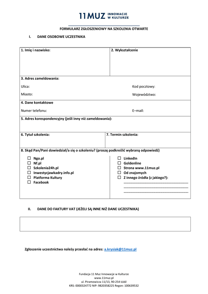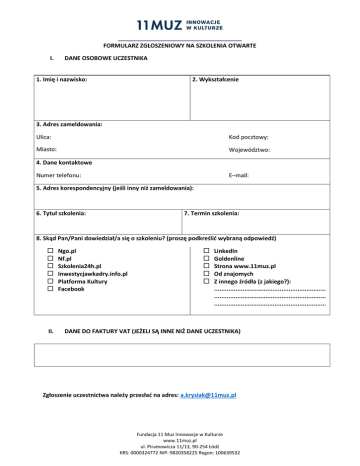 FORMULARZ ZGŁOSZENIOWY NA SZKOLENIA OTWARTE I. DANE OSOBOWE UCZESTNIKA 1. Imię i nazwisko: 2. Wykształcenie 3. Adres zameldowania: Ulica: Kod pocztowy: Miasto: Województwo: 4. Dane kontaktowe Numer telefonu: E–mail: 5. Adres korespondencyjny (jeśli inny niż zameldowania): 6. Tytuł szkolenia: 7. Termin szkolenia: 8. Skąd Pan/Pani dowiedział/a się o szkoleniu? (proszę podkreślić wybraną odpowiedź) II. Ngo.pl Nf.pl Szkolenia24h.pl Inwestycjawkadry.info.pl Platforma Kultury Facebook LinkedIn Goldenline Strona www.11muz.pl Od znajomych Z innego źródła (z jakiego?): ............................................................... ............................................................... ............................................................... DANE DO FAKTURY VAT (JEŻELI SĄ INNE NIŻ DANE UCZESTNIKA) Zgłoszenie uczestnictwa należy przesłać na adres: [email protected] Fundacja 11 Muz Innowacje w Kulturze www.11muz.pl ul. Piramowicza 11/13, 90-254 Łódź KRS: 0000324772 NIP: 9820358225 Regon: 100639532 III. WARUNKI UCZESTNICTWA 1. POTWIERDZENIE UCZESTNICTWA: Oświadczam, że zapoznałem/am się z treścią Regulaminu Uczestnictwa w szkoleniach otwartych organizacji 11 Muz Innowacje w Kulturze. Elektroniczne przesłanie i złożenie „Zgłoszenia uczestnictwa w szkoleniu otwartym” jest równoznaczne z akceptacją Regulaminu Uczestnictwa. Akceptuję warunki (wymagane) 2. REZYGNACJA Z UCZESTNICTWA – a) W przypadku pisemnej rezygnacji z uczestnictwa przez Uczestnika w terminie ponad 7 dni przed rozpoczęciem szkolenia: o Uczestnik może wziąć udział w innym terminie danego szkolenia w ciągu 6 miesięcy. Jeśli nie będzie innego terminu szkolenia w tym okresie, termin uczestnictwa będzie ustalany indywidualnie pomiędzy uczestnikiem a realizatorem. o Uczestnik może zrezygnować z udziału w szkoleniu, Realizator zwraca wpłaconą przez uczestnika odpłatność, pomniejszoną o opłatę rejestracyjną w wysokości 40% kosztów szkolenia zaokrąglone do pełnej kwoty. b) w przypadku braku pisemnej rezygnacji lub rezygnacji późniejszej niż 7 dni przed rozpoczęciem szkolenia i niewzięcia udziału w szkoleniu Uczestnik jest zobowiązany do wpłacenia pełnej odpłatności za uczestnictwo w szkoleniu. Rezygnację należy przesłać na adres e-mail: [email protected] b) ODWOŁANIE LUB ZMIANA TERMINU SZKOLENIA: Realizator zastrzega sobie prawo do odwołania szkolenia z przyczyn niezależnych. W przypadku odwołania szkolenia przez Realizatora, uczestnik w zależności od swojej decyzji: o Może odbyć szkolenia w innym terminie. o Może zażądać zwrotu odpłatności za odwołane szkolenie. Realizator musi zwrócić Uczestnikowi wpłaconą odpłatność w całości. Akceptuję warunki (wymagane) IV. PRZETWARZANIE DANYCH UCZESTNIKA Wyrażam zgodę na gromadzenie, przetwarzanie oraz wykorzystanie moich danych osobowych przez Fundację 11 Muz Innowacje w Kulturze. w celu przygotowania i przeprowadzenia powyższego programu szkoleniowego zgodnie z ustawą o ochronie danych osobowych z dn. 29.08.1997r. (Dz.U. nr 133 z 1997r.). Akceptuję warunki (wymagane) Fundacja 11 Muz Innowacje w Kulturze www.11muz.pl ul. Piramowicza 11/13, 90-254 Łódź KRS: 0000324772 NIP: 9820358225 Regon: 100639532