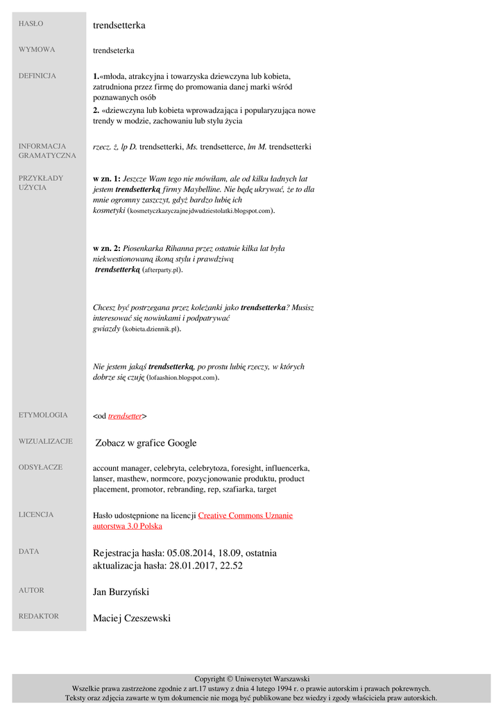 HASŁO trendsetterka WYMOWA trendseterka DEFINICJA 1.«młoda, atrakcyjna i towarzyska dziewczyna lub kobieta, zatrudniona przez firmę do promowania danej marki wśród poznawanych osób» 2. «dziewczyna lub kobieta wprowadzająca i popularyzująca nowe trendy w modzie, zachowaniu lub stylu życia» INFORMACJA GRAMATYCZNA rzecz. ż, lp D. trendsetterki, Ms. trendsetterce, lm M. trendsetterki PRZYKŁADY UŻYCIA w zn. 1: Jeszcze Wam tego nie mówiłam, ale od kilku ładnych lat jestem trendsetterką firmy Maybelline. Nie będę ukrywać, że to dla mnie ogromny zaszczyt, gdyż bardzo lubię ich kosmetyki (kosmetyczkazyczajnejdwudziestolatki.blogspot.com). w zn. 2: Piosenkarka Rihanna przez ostatnie kilka lat była niekwestionowaną ikoną stylu i prawdziwą trendsetterką (afterparty.pl). Chcesz być postrzegana przez koleżanki jako trendsetterka? Musisz interesować się nowinkami i podpatrywać gwiazdy (kobieta.dziennik.pl). Nie jestem jakąś trendsetterką, po prostu lubię rzeczy, w których dobrze się czuję (lofaashion.blogspot.com). ETYMOLOGIA WIZUALIZACJE <od trendsetter> Zobacz w grafice Google ODSYŁACZE account manager, celebryta, celebrytoza, foresight, influencerka, lanser, masthew, normcore, pozycjonowanie produktu, product placement, promotor, rebranding, rep, szafiarka, target LICENCJA Hasło udostępnione na licencji Creative Commons Uznanie autorstwa 3.0 Polska DATA Rejestracja hasła: 05.08.2014, 18.09, ostatnia aktualizacja hasła: 28.01.2017, 22.52 AUTOR Jan Burzyński REDAKTOR Maciej Czeszewski Copyright © Uniwersytet Warszawski Wszelkie prawa zastrzeżone zgodnie z art.17 ustawy z dnia 4 lutego 1994 r. o prawie autorskim i prawach pokrewnych. Teksty oraz zdjęcia zawarte w tym dokumencie nie mogą być publikowane bez wiedzy i zgody właściciela praw autorskich. Powered by TCPDF (www.tcpdf.org)
