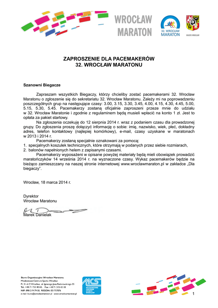 ZAPROSZENIE DLA PACEMAKERÓW 32. WROCŁAW MARATONU Szanowni Biegacze Zapraszam wszystkich Biegaczy, którzy chcieliby zostać pacemakerami 32. Wrocław Maratonu o zgłoszenie się do sekretariatu 32. Wrocław Maratonu. Zależy mi na poprowadzeniu poszczególnych grup na następujące czasy: 3.00, 3.15, 3.30, 3.45, 4.00, 4.15, 4.30, 4.45, 5.00, 5.15, 5.30, 5.45. Pacemakerzy zostaną oficjalnie zaproszeni przeze mnie do udziału w 32. Wrocław Maratonie i zgodnie z regulaminem będą musieli wpłacić na konto 1 zł. Jest to opłata za pakiet startowy. Na zgłoszenia oczekuję do 12 sierpnia 2014 r. wraz z podaniem czasu dla prowadzonej grupy. Do zgłoszenia proszę dołączyć informację o sobie: imię, nazwisko, wiek, płeć, dokładny adres, telefon kontaktowy (najlepiej komórkowy), e-mail, czasy uzyskane w maratonach w 2013 i 2014 r. Pacemakerzy zostaną specjalnie oznakowani za pomocą: 1. specjalnych koszulek technicznych, które otrzymają w podanych przez siebie rozmiarach, 2. balonów napełnionych helem z zapisanymi czasami. Pacemakerzy wyposażeni w opisane powyżej materiały będą mieli obowiązek prowadzić maratończyków 14 września 2014 r. na wyznaczone czasy. Wykaz pacemakerów będzie na bieżąco zamieszczany na naszej stronie internetowej www.wroclawmaraton.pl w zakładce „Dla biegaczy”. Wrocław, 18 marca 2014 r. Dyrektor Wrocław Maratonu Marek Danielak 1