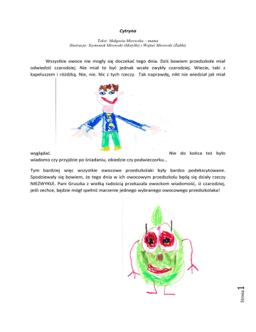 Cytryna Tekst: Małgosia Mirowska – mama Ilustracje: Szymonek Mirowski (Motylki) i Wojtuś Mirowski (Żabki) Wszystkie owoce nie mogły się doczekać tego dnia. Dziś bowiem przedszkole miał odwiedzić czarodziej. Nie miał to być jednak wcale zwykły czarodziej. Wiecie, taki z kapeluszem i różdżką. Nie, nie. Nic z tych rzeczy. Tak naprawdę, nikt nie wiedział jak miał wyglądać. Nie do końca też było wiadomo czy przyjdzie po śniadaniu, obiedzie czy podwieczorku… Strona 1 Tym bardziej więc wszystkie owocowe przedszkolaki były bardzo podekscytowane. Spodziewały się bowiem, że tego dnia w ich owocowym przedszkolu będą się działy rzeczy NIEZWYKŁE. Pani Gruszka z wielką radością przekazała owockom wiadomość, iż czarodziej, jeśli zechce, będzie mógł spełnić marzenie jednego wybranego owocowego przedszkolaka! Cóż to była za wiadomość! Wyobrażacie sobie? Nie ma nic wspanialszego niż spełnienie swojego największego marzenia! - Ekstra! Czadowo! Superowo! - cieszyły się owocki! Energiczne Granaty marzyły o locie w kosmos! Strona 2 Przebojowy Ananas chciał zostać piosenkarzem, a bliźniaczki Wisienki chciałyby zanurkować w oceanie! Nieśmiałe Jagódki wreszcie chciałyby dostać super jagodo-lalki, a smaczne Mandarynki odnaleźć prehistoryczne pestki prastarych owocozaurów! Strona Choć w przedszkolu jest mnóstwo owocków, ona nie ma żadnej koleżanki. Ani nawet kolegi. Prawie się nie odzywa… No może tylko wtedy, kiedy Pani Gruszka o coś ja zapyta. Cytrynka zazwyczaj siedzi w kąciku i przegląda książeczki. Owocki przyzwyczaiły się już do Cytrynki i właściwie przestały ją zauważać. Przestały o niej myśleć i nie zapraszają jej do wspólnych zabaw. Wydaje się im DZIWNA. Któż chciałby się bawić z kimś, kto jest dziwny, prawda? 3 Tylko Cytrynka była jakaś bardziej smutna. Bo wiecie, Cytrynka to prawie zawsze jest smutna. Za to wszyscy chcieliby się bawić z Ananasem. Jest rozrywkowy, zna mnóstwo dowcipów. Z nim jest zawsze baaaaaaaaaaaardzo fajnie! Myślicie, że Cytrynka dobrze się czuła w owocowym przedszkolu? Lubiła tam chodzić? (chwila ciszy) Tak. Cytrynka cierpiała. Szkoda tylko, ze owocki tego nie zauważały. Były tak zajęte wymyślaniem swoich marzeń do spełnienia, że nie zauważyły nawet, że cytrynka w pewnym momencie gdzieś ZNIKNĘŁA… Po drugim śniadaniu owocki usłyszały zza okien piękną melodię. Jakby ktoś grał na harfie, a potem… na flecie… Nagle, drzwi do sali lekko się uchyliły skrzypiąc troszeczkę… Owocki poczuły też piękny zapach… Jakby lekko kwiatowy… Może to frezje? Nie, nie, chyba raczej fiołki… Pani Gruszka zaprosiła przybysza do środka. - Zapraszamy, wejdź – powiedziała - Nasze owocki są już gotowe. Nie mogły się Ciebie doczekać, Czarodzieju! Wszystkie owocki zaczęły się rozglądać, ale nikogo nie widziały. To było dziwne. - Gdzie on jest? Kim jest? Dlaczego go nie możemy zobaczyć? - pytały podekscytowane. Miały przecież do spełnienia tyyyyyyyle marzeń! Wtedy, poczuły w swoich pestkowych serduszkach przyjemne łaskotanie. I zrobiło im się baaaardzo miło, jakby przytulały się do swojej mamy, albo do taty. Albo jeszcze lepiej! Do mamy i taty jednocześnie! Ta chwila mogłaby trwać wiecznie! Strona 4 Pierwszy odezwał się Bananek: - Ten czarodziej jest naprawdę niezwykły! Za chwile, na pewno spełni moje marzenie! – powiedział. I Moje! – krzykną Ananas. A zaraz potem dodał: Hmmmm, Jakoś dziwnie się czuję… Podobnie Granat i Wisienki, i Jagódki, i Truskaweczki i Ananas, i wszystkie owocki! Nawet Pani Gruszka! I wtedy, niemal równocześnie, wszystkie owocki spostrzegły brak Cytrynki! - Ojej! Nie ma Cytrynki! Gdzie ona jest? Nie może jej zabraknąć? Przecież Czarodziej nie pozna jaj marzenia! To niemożliwe! No właśnie! A jakie było marzenie Cytrynki? Czy ktoś z nią rozmawiał? Czy ktoś był ciekaw jakie marzenie ma cytrynka? Czy ktoś wie o czym marzyła? – owocki pytały siebie nawzajem… No właśnie… Nikt nie znał odpowiedzi… Przez chwilę owocki zapomniały o sobie i swoich marzeniach. Zaczęły wołać Cytrynkę. Zaczęły jej szukać po całym owocowym przedszkolu. Cytrynka mogłaby być mistrzem zabawy w chowanego! Niestety nie udało się jej znaleźć! - Co za pech! - powiedział Ananas - Wracajmy do sali. Czeka na nas czarodziej. – powiedział Bananek. I wtedy Śliweczka zauważyła pod stolikiem, zaraz obok książeczki…, tej którą zazwyczaj czytała Cytrynka, coś bardzo malutkiego, żółtego, jak Cytrynka, ale nieco bardziej ciemnego i bardzo twardego. Śliweczka podeszła bliżej i gdy tylko się lekko schyliła, krzyknęła: Mam, znalazłam ją, znalazłam Cytrynkę! Owocki natychmiast podbiegły! Tak, to była Cytrynka! Tylko jakaś mała, ciemna i sucha. - Cytrynko, zapytała Malinka - dlaczego się chowasz? - Nie chowam się. Bez waszej miłości i waszego zainteresowania……… usycham. Robię się coraz mniejsza i mniejsza… Któżby się przejmował taką dziwną Cytrynką jak ja? Wszystkie jesteście słodkie… A ja? Jestem taaaaka kwaśna. To dlatego mnie nie lubicie i nie chcecie się ze mną bawić… Owocki spojrzały na siebie. Zrobiło im się smutno i przykro. Zrozumiały swoją winę i to, że traktowały Cytrynkę niesprawiedliwie. - Byliśmy tak zajęci własnymi marzeniami, że nawet nie zauważyliśmy, jak bardzo ją krzywdziliśmy. Nie interesowaliśmy się nią, nie zapraszaliśmy do zabawy – powiedziała Truskaweczka. Uważaliśmy, ze jest dziwna, bo jest kwaśna. Inna niż my. Owocki wzięły się za owocowe rączki, otoczyły Cytrynkę i mocno, ale to baaaardzo mocno ją przytuliły. Tak mocno, ze Cytrynka poczuła, jak znowu zaczyna tętnić w niej życie, jak soki wracają, a pestki stają się jędrne i życiodajne. No właśnie, a co się stało z czarodziejem? Gdzie się podział? I co z marzeniami owocków? Wiecie co? Czarodziej