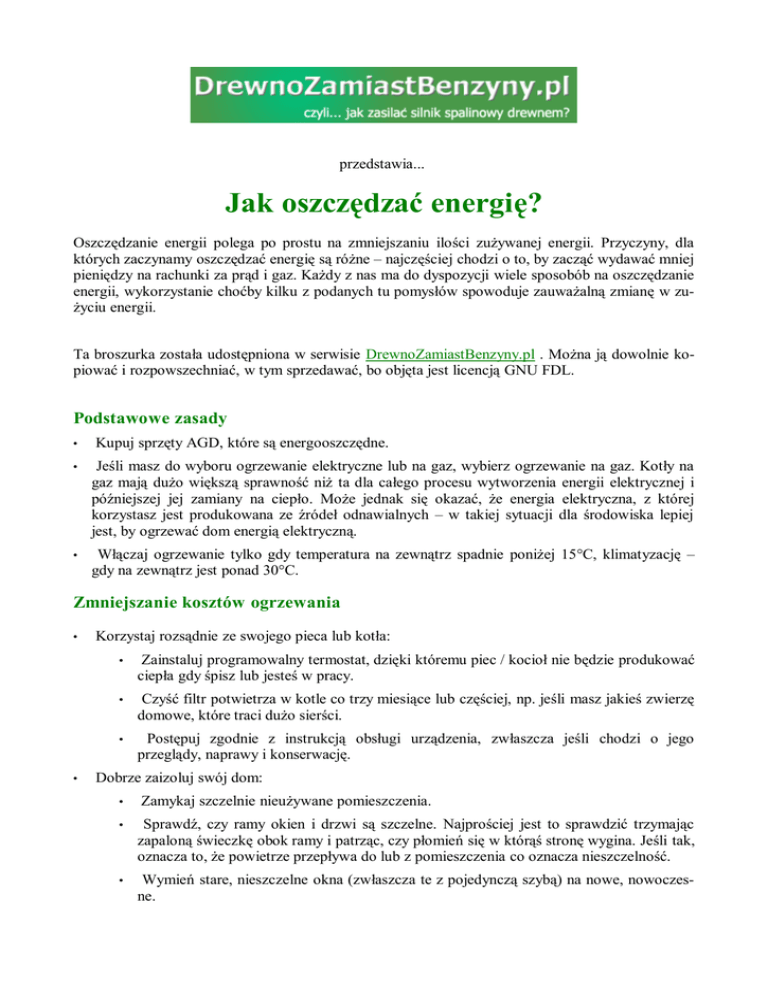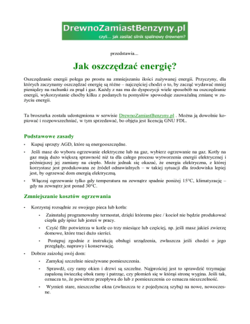 przedstawia... Jak oszczędzać energię? Oszczędzanie energii polega po prostu na zmniejszaniu ilości zużywanej energii. Przyczyny, dla których zaczynamy oszczędzać energię są różne – najczęściej chodzi o to, by zacząć wydawać mniej pieniędzy na rachunki za prąd i gaz. Każdy z nas ma do dyspozycji wiele sposobób na oszczędzanie energii, wykorzystanie choćby kilku z podanych tu pomysłów spowoduje zauważalną zmianę w zużyciu energii. Ta broszurka została udostępniona w serwisie DrewnoZamiastBenzyny.pl . Można ją dowolnie kopiować i rozpowszechniać, w tym sprzedawać, bo objęta jest licencją GNU FDL. Podstawowe zasady • Kupuj sprzęty AGD, które są energooszczędne. • Jeśli masz do wyboru ogrzewanie elektryczne lub na gaz, wybierz ogrzewanie na gaz. Kotły na gaz mają dużo większą sprawność niż ta dla całego procesu wytworzenia energii elektrycznej i późniejszej jej zamiany na ciepło. Może jednak się okazać, że energia elektryczna, z której korzystasz jest produkowana ze źródeł odnawialnych – w takiej sytuacji dla środowiska lepiej jest, by ogrzewać dom energią elektryczną. • Włączaj ogrzewanie tylko gdy temperatura na zewnątrz spadnie poniżej 15°C, klimatyzację – gdy na zewnątrz jest ponad 30°C. Zmniejszanie kosztów ogrzewania • • Korzystaj rozsądnie ze swojego pieca lub kotła: • Zainstaluj programowalny termostat, dzięki któremu piec / kocioł nie będzie produkować ciepła gdy śpisz lub jesteś w pracy. • Czyść filtr potwietrza w kotle co trzy miesiące lub częściej, np. jeśli masz jakieś zwierzę domowe, które traci dużo sierści. • Postępuj zgodnie z instrukcją obsługi urządzenia, zwłaszcza jeśli chodzi o jego przeglądy, naprawy i konserwację. Dobrze zaizoluj swój dom: • Zamykaj szczelnie nieużywane pomieszczenia. • Sprawdź, czy ramy okien i drzwi są szczelne. Najprościej jest to sprawdzić trzymając zapaloną świeczkę obok ramy i patrząc, czy płomień się w którąś stronę wygina. Jeśli tak, oznacza to, że powietrze przepływa do lub z pomieszczenia co oznacza nieszczelność. • Wymień stare, nieszczelne okna (zwłaszcza te z pojedynczą szybą) na nowe, nowoczesne. • • W oknach powieś ciężkie firany. Zasłaniaj je w nocy, odsłaniaj w dzień, by słońce mogło ogrzać wnętrze pomieszczenia. • Jeżeli nigdy nie otwierasz okien w piwnicy, rozważ zastąpienie ich szybą wprawioną na stałe, która zatrzyma więcej ciepła niż okno. Nie usuwaj wszystkich okien, przynajmniej dwa mogą być potrzebne gdy pojawi się konieczność wywietrzenia piwnicy. Wykorzystuj “ponownie” ciepło: • • • • • • • • Nie opróżniaj od razu wanny i garnków z gorącej wody – niech najpierw odda ciepło do otoczenia. Szkoda marnować ciepło wlewając gorącą wodę do ścieku. Przykrywaj się grubym kocem lub korzystaj z koca elektrycznego aby móc obniżyć na noc potrzebną temperaturę w mieszkaniu. Nastaw termostat w bojlerze na niższą temperaturę. Rozważ zastąpienie bojlera podgrzewaczem przepływowym, który ogrzewa wodę gdy jest ona potrzebna i nie przechowuje rozgrzanej wody, co zawsze powoduje straty. Ubieraj się ciepło. Jeżeli mieszkasz sam lub w dużym domu, bardziej opłacalne może być ogrzewanie domu do niższej temperatury (15-18°C) i dogrzewanie miejsc, w których często przebywasz grzejnikiem elektrycznym. Wykorzystaj żywopłot lub inne podobne zasłony by chronić dom przed zimnym wiatrem. Mieszkanie w bloku czy kamienicy łatwiej ogrzać niż wolnostojący dom, co wynika z mniejszej powierzchni oddawania ciepła do otoczenia. Jeśli możesz, staraj się wybierać mieszkanie, które ma możliwie mało ścian zewnętrznych. Zmniejszanie wydatków na klimatyzację • • Wiele z pomysłów opisanych w sekcji dotyczącej zmniejszania kosztów ogrzewania, takie jak ocieplanie ścian czy uszczelnianie okien, przyczyni się również do oszczędności w wydatkach na klimatyzację. Korzystaj z wentylatorów i dmuchaw zamiast klimatyzatora. • Wyłączaj wentylatory gdy nikt nie przebywa w miejscu bezpośredniego nadmuchu. Urządzenia te nie obniżają temperatury a tylko ułatwiają odparowanie potu ze skóry, co przyczynia się do zmniejszenia temperatury ciała. • Większe klimatyzatory mają zazwyczaj mniejsze zużycie energii od dwóch mniejszych urządzeń o tej samej mocy chłodzącej. Z tego względu może okazać się uzasadniona wymiana dwóch małych urządzeń na jedno większe. • Jeżeli używasz przenośnego klimatyzatora, upewnij się, że ciepło oddaje on poza pomieszczenie, na dwór. W przeciwnym wypadku tylko podnosisz temperaturę panującą wewnątrz. • Jeśli temperatura w nocy na dworzu spada poniżej 21°C, otwieraj na noc okna by wywietrzyć ciepłe powietrze ze środka i zastąpić je zimnym. Pomocne mogą być w tym wentylatory. Najlepszym pomysłem jest otworzenie okien w dwóch końcach mieszkania aby przez jedno zasysać chłodne powietrze z dworu a drugim wydmuchiwać ciepłe powietrze na zewnątrz. • Aby zmniejszyć ilość światła słonecznego ogrzewającego dom, załóż na okna zasłony albo żaluzje. Jeszcze skuteczniejsze jest wydłużenie dachu, by dawał on odpowiedni cień, ale nie zawsze łatwo jest to zrobić. • Posadź drzewa dookoła domu. Jeśli planujesz jego budowę, wybierz miejsce, które popołudniu jest zacienione. Drzewa, które nie dają bezpośrednio cienia na dom i tak przyczyniają się do obniżenia temperatury w swoim otoczeniu. • Pij dużo aby utrzymywać temperaturę ciała na właściwym poziomie. • Zamykaj drzwi do szaf i garderoby. To może obniżyć o 5% koszty ogrzewania i wentylacji. Obniżanie wydatków na oświetlenie • Kiedy tylko możesz, korzystaj ze światła słonecznego i nie włączaj świateł w ciągu dnia. Jeśli masz taką możliwość, dopasuj swój rytm dnia do wschodu i zachodu słońca, by jak najdłużej korzysta