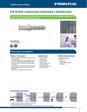 Zamocowania lekkie FIX Kołek rozporowy nylonowy z kołnierzem Łatwy w montażu nylonowy kołek rozporowy z kołnierzem uzyskujący wyjątkowo wy sokie parametry w podłożach pełnych Aprobaty • AT-15-8093/2015 Informacja o produkcie Cechy i korzyści Aplikacje Materiał podłoża • Kołnierz zapewnia zlicowane dopasowanie się do powierzchni • Skrzydełka antyrotacyjne zapobiegają obraca niu się koszulki podczas dokręcania wkręta • Specjalne wypustki stabilizują montaż kołka w otworze • Dwukierunkowy mechanizm rozporu koszulki gwarantuje pewne zamocowanie w pełnych podłożach. • Możliwość mocowania blisko krawędzi • • • • • • • • Certyfikowane do: Obrazy i zdjęcia Oświetlenie Listwy/Poręcze Półki ścienne Kanały instalacyjny Koryta kablowe Instalacje elektryczne Skrzynki na listy • • • • Beton Cegła pełna Cegła silikatowa pełna Gazobeton Instrukcja montażu 1.Wywiercić otwór wiertłem o zalecanej średnicy. 2.Umieścić kołek FIX w otworze i docisnąć. 3.Przez element mocowany włożyć wkręt o zalecanej średnicy do otworu w kołku. www.rawlplug.com 1 Zamocowania lekkie Informacja o produkcie Wymiary produktu Parametry montażu Kołek Rozmiar Wkręt Element mocowany Średnica Długość Średnica Średnica otworu d l D df Produkt [mm] Ø6 R-FIX-NF-06 6 30 3,5 - 4,0 4,0 - 5,0 Ø8 R-FIX-NF-08 8 40 4,5 - 5,0 5,0 - 6,0 Ø10 R-FIX-NF-10 10 50 5,0 - 6,0 6,0 - 7,0 Ø12 R-FIX-NF-12 12 60 6,0 - 8,0 7,0 - 9,0 Ø14 R-FIX-NF-14-070 14 70 10,0 11,0 Zalecenia montażowe Installation data Rozmiar Ø6 Ø8 Ø10 Ø12 Ø14 Średnica łącznika d [mm] 6 8 10 12 14 Średnica otworu w podłożu d0 [mm] 6 8 10 12 14 Min. głębokość otworu w podłożu h0 [mm] 40 50 60 70 80 Całkowita głębokość osadzenia łącznika hnom [mm] 30 40 50 60 70 Min. grubość podłoża hmin [mm] 60 70 80 90 100 Min. rozstaw (łeb stożkowy) smin [mm] 30 40 30 30 - Min. rozstaw (łeb szcześciokątny) smin [mm] - - 50 60 70 Min. odległość od krawędzi (łeb stożkowy) cmin [mm] 30 40 40 40 - Min. odległość od krawędzi (łeb sześciokątny) cmin [mm] - - 50 60 70 Dane uproszczone dla pojedynczego zakotwienia Dane dla pojedynczego zamocowania bez wpływu krawędzi i łączników sąsiadujących Podłoże Beton C20/25 - C50/60 Cegła pełna min. 20MPa Cegła silikatowa pełna Gazobeton 6MPa ŚREDNIE OBCIĄŻENIE NISZCZĄCE FRu,m Ø6, Głębokość kotwienia 30mm [kN] 0.24 1.11 0.65 0.76 Ø8, Głębokość kotwienia 40mm [kN] 1.02 2.92 1.65 1.17 Ø10, Głębokość zakotwienia 50mm [kN] 0.78 1.86 1.62 1.64 Ø12, Głębokość zakotwienia 60mm [kN] 1.82 5.80 4.06 2.99 Ø14, Głębokość zakotwienia 70mm [kN] 2.29 3.73 2.37 1.80 Ø6, Głębokość kotwienia 30mm [kN] 0.15 0.40 0.30 0.40 Ø8, Głębokość kotwienia 40mm [kN] 0.50 2.00 1.20 0.75 Ø10, Głębokość zakotwienia 50mm [kN] 0.40 0.90 0.60 0.90 Ø12, Głębokość zakotwienia 60mm [kN] 1.20 4.00 3.00 2.00 Ø14, Głębokość zakotwienia 70mm [kN] 1.20 2.50 1.20 1.15 OBCIĄŻENIE CHARAKTERYSTYCZNE FRk www.rawlplug.com 2 Zamocowania lekkie Dane uproszczone dla pojedynczego zakotwienia Dane logistyczne 1) Kołek Roz miar Produkt Ø6 Ilość [szt] Waga [kg] Kody ean Średnica [mm] Opakowanie jednostkowe Opakowanie zbiorcze Paleta Opakowanie jednostkowe Opakowanie zbiorcze R-FIX-NF-061) 6 100 3200 76800 0.08 2.6 91.4 5906675168524 Ø8 R-FIX-NF-081) 8 100 2400 57600 0.19 4.7 141.6 5906675168548 Ø10 R-FIX-NF-101) 10 100 1200 28800 0.31 3.7 119.3 5906675168562 Ø12 R-FIX-NF-121) 12 50 600 14400 0.28 3.4 110.6 5906675134314 Ø14 R-FIX-NF-14-0701) 14 25 400 9600 0.18 2.9 99.1 5906675134321 Paleta AT-15-8093/2015 www.rawlplug.com 3