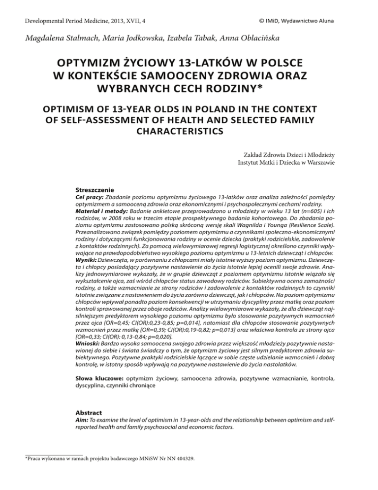 z kontaktów rodzinnych). Za pomocą wielowymiarowej regresji logistycznej określono czynniki wpływające na prawdopodobieństwo wysokiego poziomu optymizmu u 13-letnich dziewcząt i chłopców.