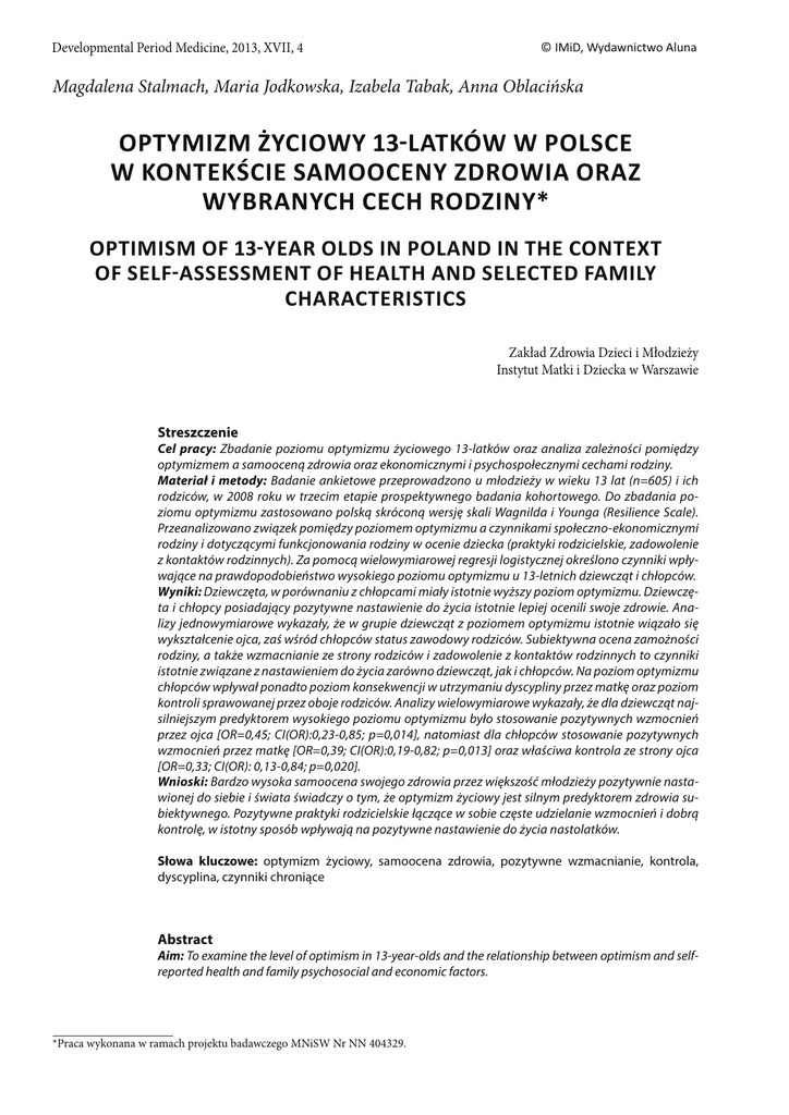 Optymizm życiowy 13-latków w Polsce w kontekście samooceny zdrowia oraz wybranych cech rodziny