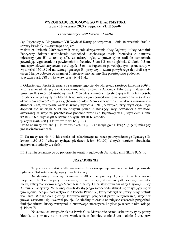 WYROK SĄDU REJONOWEGO W BIAŁYMSTOKU z dnia 10 września 2009 r. sygn. akt VII K 586/09 Przewodniczący: SSR Sławomir Cilulko Sąd Rejonowy w Białymstoku VII Wydział Karny po rozpoznaniu dnia 10 września 2009 r. sprawy Pawła G. oskarżonego o to, że: w dniu 26 kwietnia 2009 roku w B. w rejonie skrzyżowania ulicy Gajowej i ulicy Antoniuk Fabryczny dokonał uszkodzenia samochodu osobowego marki Mercedes o numerze rejestracyjnym BI w ten sposób, że uderzył ręką w prawe tylne nadkole samochodu powodując wgniecenie na powierzchni o średnicy 3 cm i 2 cm na głębokość około 0,5 cm oraz spowodował zarysowanie o długości 3 cm na bagażniku powodując tym łączne straty w wysokości 1501,89 zł na szkodę Ignacego B., przy czym czynu powyższego dopuścił się w ciągu 5 lat po odbyciu co najmniej 6 miesięcy kary za umyślne przestępstwo podobne, tj. o czyn z art. 288 § 1 kk w zw. z art. 64 § 1 kk. I. Oskarżonego Pawła G. uznaje za winnego tego, że: dwudziestego szóstego kwietnia 2009 r. w B. uszkodził stojący na skrzyżowaniu ulic Gajowej i Antoniuk Fabryczny, należący do Ignacego B. samochód osobowy marki Mercedes o numerze rejestracyjnym BI w ten sposób, że uderzał w prawy tylny błotnik tego auta, czym spowodował dwa wgniecenia o średnicy około 3 cm i około 2 cm, przy głębokości około 0,5 cm każdego z nich, a także zarysowanie o długości 3 cm, zaś łączna wartość szkody wyniosła 1.501,89 złotych, przy czym czynu tego dopuścił się w ciągu 5 lat po odbyciu ponad 6 miesięcy kary pozbawienia wolności orzeczonej za umyślne przestępstwo podobne przez Sąd Rejonowy w B., wyrokiem z dnia 09.10.2006 r., wydanym w sprawie o sygn. akt III K 3266/06, tj. czynu z art. 288 § 1 kk w zw. z art. 64 § 1 kk i za to na mocy art. 288 § 1 kk w zw. z art. 64 § 1 kk skazuje go na karę 5 (pięciu) miesięcy pozbawienia wolności. II. Na mocy art. 46 § 1 kk orzeka od oskarżonego na rzecz pokrzywdzonego Ignacego B. kwotę 1.501,89 (jednego tysiąca pięciuset jeden 89/100) złotych tytułem obowiązku naprawienia szkody w całości. III. Zwalnia oskarżonego od ponoszenia kosztów sądowych obciążając nimi Skarb Państwa. UZASADNIENIE Na podstawie całokształtu materiału dowodowego ujawnionego w toku przewodu sądowego Sąd ustalił następujący stan faktyczny: Dwudziestego szóstego kwietnia 2009 r. po północy Ignacy B. – taksówkarz korporacji „E. Taxi” – jadąc na zlecenie, z uwagi na sygnał czerwony dla swojego kierunku ruchu, zatrzymał kierowanego Mercedesa o nr rej. BI na skrzyżowaniu ulicy Gajowej i ulicy Antoniuk Fabryczny. W pewnej chwili do stojącego samochodu zbliżył się znajdujący się w tym rejonie, będący pod wpływem alkoholu Paweł G., który uderzył w prawy tylny błotnik ww. auta. Widząc co się dzieje kierowca ruszył, przejechał przez skrzyżowanie, skręcił w prawo, zatrzymał się i wezwał policję. Po niedługim czasie na miejsce zdarzenia przyjechali funkcjonariusze, którzy zatrzymali nietrzeźwego mężczyznę i będącego razem z nim kolegę, tj. Piotra W. Na skutek celowego działania Pawła G. w Mercedesie został uszkodzony tylny prawy błotnik, tj. powstały na nim dwa wgniecenia o średnicy około 3 cm i około 2 cm, przy głębokości około 0,5 cm każdego z nich, a także zarysowanie o długości 3 cm. Koszt ich naprawy to kwota 1501,89 złotych. Wyrokiem Sądu Rejonowego w B. z dnia 09.10.2006 r., wydanym w sprawie o sygn. akt III K 3266/06, oskarżony został skazany za przywłaszczenie mienia na karę jednego roku pozbawienia wolności z warunkowym zawieszeniem jej wykonania na okres próby w wymiarze 3 lat. Postanowieniem tegoż sądu z dnia 03.04.2008 r. zarządzono wykonanie ww. kary. Skazany odbywał ją w okresie od 12.06.2008 r. do 19.03.2009 r., w której to dacie został warunkowo przedterminowo zwolniony. Powyższy stan faktyczny sąd ustalił w oparciu o: zeznania świadków: Ignacego B. (k.3 – 5, 13, 96v - 97) i Piotra W. (k.11 – 12), protokół oględzin (k.8), zdjęcia (k.10), kalkulację naprawy Mercedesa (k.14 – 17), wyjaśnienia oskarżonego (k.31), dane z KRK (k.49), odpis prawomocnego wyroku Sądu Rejonowego w B. z dnia 9.10.2006 r. (k.53), obliczenie kary (k.86), zawiadomienie o zwolnieniu ze sprawy (k.75), odpis postanowienia Sądu Okręgowego w Ł. o warunkowym przedterminowym zwolnieniu (k.76), dokumentację fotograficzną na płycie CD (k.90) i oględziny zapisu na płycie CD (k.97). Oskarżony na etapie dochodzenia przyznał się do popełnienia zarzucanego mu czynu. Wyjaśnił, że postąpił lekkomyślnie i był wówczas pod wpływem alkoholu. Żałuje tego czynu i chciałby dobrowolnie poddać się karze. Chciałby naprawić szkodę, ale obecnie nie pracuje, nie posiada majątku i nie jest w stanie tego zrobić. W najbliższym czasie planuje się zatrudnić i chciałby zapłacić pokrzywdzonemu w ratach (k.31). Przesłuchany w dniu 25.06.2009 r. podał, iż w dacie zdarzenia został przez kogoś uderzony w głowę, w następstwie czego leciała mu krew. Z uwagi na tą sytuację, będąc pod wpływem alkoholu, targały nim emocje i bez zastanowienia uderzył pięścią w pokrywę bagażnika pojazdu, który stał obok. Nie chciał zrobić niczego złego i chciałby naprawić szkodę (k.57). Sąd zważył co następuje: Bezspornym jest, iż 26 kwietnia 2009 r. doszło do uszkodzenia stojącego na skrzyżowaniu Mercedesa o nr rej. BI, a sprawcą szkody był Paweł G. Pokrzywdzony jednoznacznie zidentyfikował mężczyznę, który uderzał w jego auto, a następnie wskazał go policjantom. Wersję właściciela pojazdu potwierdzają zeznania Piotra W., a także wyjaśnienia podsądnego. Wprawdzie Ignacy B. podczas pierwszego przesłuchania wskazał, iż skutkiem działań sprawcy było „widoczne wgniecenie” (k.4v), ale sformułowanie to należy traktować jako uproszczony opis efektów zachowania agresywnego mężczyzny. Z protokołu oględzin auta 