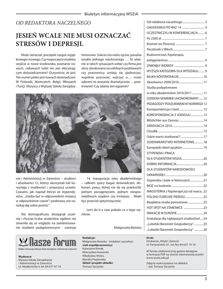 Biuletyn informacyjny WSZiA OD REDAKTORA NACZELNEGO Od redaktora naczelnego ................................ 3 GAUDEAMUS PO RAZ 14 ................................ 4 JESIEŃ WCALE NIE MUSI OZNACZAĆ STRESÓW I DEPRESJI. UCZESTNICZYLI W KONFERENCJACH.......... 6 Po 2300 zł .............................................................. 7 Businet we Florencji .......................................... 7 Pocztówki z Włoch ............................................. 7 Może oznaczać początek czegoś wyjątkowego i nowego. Czy rozpoczęcie studiów, wejście w nowe środowisko, poznanie nowych, ciekawych ludzi nie jest ekscytującym doświadczeniem? Oczywiście, że jest. Ten numer pełen jest nowych doświadczeń. W Finlandii, Niemczech, Belgii, Włoszech i Turcji. Wszyscy z Wyższej Szkoły Zarządza- minorowe. Sukces ma wielu ojców, porażka zwykle jednego niechcianego … To właśnie w takich sytuacjach widać czy firma jest silna, zbudowana na solidnych podstawach czy pracownicy umieją się zjednoczyć, wspólnie pracować, walczyć o…, może zabrzmi to strasznie dramatycznie, …przetrwanie? Czy zdamy ten egzamin? Budownictwo, fizjoterapia, pielęgniarstwo..................................................... 9 ZNIKNĘŁY INDEKSY ............................................ 9 WYŻSZA KATEGORIA DLA WYDZIAŁU......... 9 BAJKA KONTRATAKUJE ...................................10 Absolwenci 2009/2010 ...................................11 Studia podyplomowe w roku akademickim 2010/2011 ................11 DZIEKAN SKWAREK UHONOROWANY ......12 PEDAGODZY POSZUKIWANI W NORWEGII 12 Korespondencja z Geel...................................13 KORESPONDENCJA Z JOENSUU ..................13 Blitzlichter aus Zamosc...................................14 GRADUACJA 2010 ............................................14 Chodlik .................................................................15 Gdzie warto studiować?.................................17 DZIENNIKARSTWO INTERNETOWE.............18 Europejski dzień języków ..............................19 STYPENDIA I PRACA DLA STUDENTÓW WSZiA...............................20 DOBRA INFORMACJA ......................................20 DLA STUDENTÓW NARODOWOŚCI UKRAIŃSKIEJ ......................................................20 nia i Administracji w Zamościu – studenci i absolwenci. Ci, którzy skorzystali lub korzystają z możliwości i propozycji uczelni. Czasami, jak napisał któryś ze stypendystów, „trzeba być w odpowiednim miejscu w odpowiednim czasie” i podstawa „nie narzekaj daj sobie pomóc”. Niż demograficzny dosięgnął uczelnię i chociaż liczba studentów ogółem nie zmieniła się ze względu na zainteresowanie studiami podyplomowymi - nastroje Wydawca: Wyższa Szkoła Zarządzania i Administracji w Zamościu ul. Akademicka 4, tel. 84 677 67 16 14. inauguracja roku akademickiego – całkiem spory bagaż doświadczeń, dokonań, pracy, której nie da się przekreślić jednym pociągnięciem, jednym niesprawiedliwym osądem czy mniejsza… Miało być przecież optymistycznie. Let’s do it a czas pokaże co z tego wyniknie. Stypendia i staże w Niemczech ...................21 BIOZ na budowie ..............................................22 MAGISTERKA z fizjoterapii już od marca ..22 POLSKO-TURECKIE PIEROGI ..........................23 Bezpłatne studia pomostowe .....................23 HOT SPOT NA STARÓWCE ............................23 WAKACJE W EUROPIE ......................................24 Gratulacje dla najlepszych studentów! ....24 „Lubelski Barometr Gospodarczy”..............25 Małgorzata Bzówka Redakcja: Małgorzata Bzówka - (redaktor naczelny), stali współpracownicy: Katarzyna Kimak, Mieczysław Kowerski, Władysław Molas, Monika Popławska Skład i projekt okładki: Tomasz Szczyrba „Lubelski Barometr Gospodarczy” .............26 Druk: Drukarnia „Attyla”, Zamość ul. Partyzantów 61, tel./fax 84 627 19 16 W formie elektronicznej gazeta dostępna w formacie PDF na stronie internetowej uczelni www.wszia.edu.pl Zdjęcie wykorzystane na okładce – aut. Tomasz Szczyrba 3 Biuletyn informacyjny WSZiA Inauguracja roku akademickiego STUDENCI Z NAJWYŻSZĄ ŚREDNIĄ w roku akademickim 2009/2010 L.p. Średnia za studia Imię Nazwisko Kierunek studiów 1 4,93 Katarzyna Putkowska Pedagogika-FiP 2 4,80 Adam Topolski Fizjoterapia-Mgr PO RAZ 14 3 4,79 Barbara Mamona Ekonomia 4 4,76 Anna Subocz-Chachuła Administracja 5 4,76 Marta Masłyk Fizjoterapia-Mgr „Ustrój państwa w erze integracji europejskiej” - to tytuł wykładu zaplanowanego na XIV inaugurację roku akademickiego w Wyższej Szkole Zarządzania i Administracji, która odbędzie się 19 października br. 6 4,75 Bożena Kowalczuk Administracja 7 4,74 Joanna Skrzyńska-Kudełka Administracja 8 4,74 Olena Krasiuk Administracja 9 4,73 Katarzyna Jarosz Pedagogika-FiP 10 4,73 Katarzyna Flak Pedagogika-FiP 11 4,72 Anna Duma Fizjoterapia-Mgr 12 4,71 Małgorzata Fusiarz-Żołopa Administracja 13 4,71 Svitlana Kvachuk Administracja GAUDEAMUS Wykład inauguracyjny wygłosi dr Wojciech Orłowski, adiunkt w Katedrze Nauk Prawnych naszej uczelni . W programie inauguracji o godz. 10 Msza św. w Katedrze Zamojskiej celebrowana przez księdza biskupa dr Wacława Depo. O godz. 12 w Collegium Novum przy ul. Sienkiewicza 22 - immatrykulacja studentów pierwszego roku. Senat uczelni uhonorował najwyższym odznaczeniem uczelni – medalem Scholae Amicis ks. Wiesława Mokrzyckiego (za wieloletnią współpracę i promowanie uczelni w kraju i zagranicą) i Krzysztofa Grabczuka, Marszałka Województwa Lubelskiego (za wkład w rozwój systemu stypendialnego i wspieranie przedsięwzięć społeczno – kulturalnych uczelni). O osiągnięciach na polu naukowym w roku ubiegłym w swoim sprawozdaniu inauguracyjnym napisał prorektor dr Mieczysław Kowerski: 30 września 2010 roku Minister Nauki i Szkolnictwa Wyższego przyznał czwartą kategorię naukową – jedną