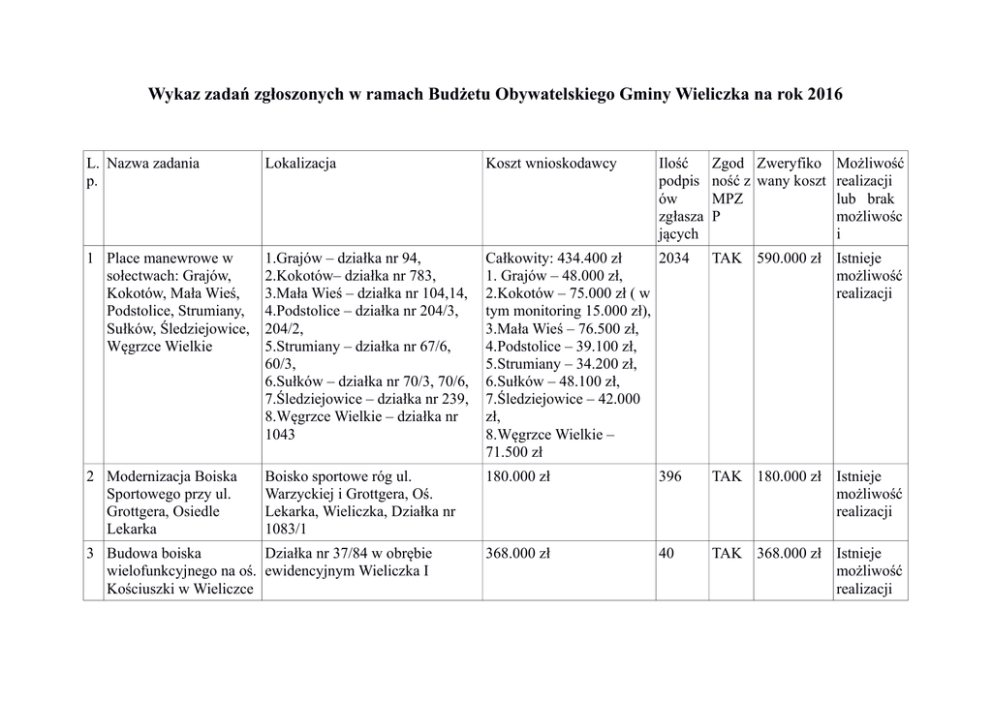 Wykaz zadań zgłoszonych w ramach Budżetu Obywatelskiego Gminy Wieliczka na rok 2016 L. Nazwa zadania p. Lokalizacja Koszt wnioskodawcy 1 Place manewrowe w sołectwach: Grajów, Kokotów, Mała Wieś, Podstolice, Strumiany, Sułków, Śledziejowice, Węgrzce Wielkie 1.Grajów – działka nr 94, 2.Kokotów– działka nr 783, 3.Mała Wieś – działka nr 104,14, 4.Podstolice – działka nr 204/3, 204/2, 5.Strumiany – działka nr 67/6, 60/3, 6.Sułków – działka nr 70/3, 70/6, 7.Śledziejowice – działka nr 239, 8.Węgrzce Wielkie – działka nr 1043 Całkowity: 434.400 zł 2034 1. Grajów – 48.000 zł, 2.Kokotów – 75.000 zł ( w tym monitoring 15.000 zł), 3.Mała Wieś – 76.500 zł, 4.Podstolice – 39.100 zł, 5.Strumiany – 34.200 zł, 6.Sułków – 48.100 zł, 7.Śledziejowice – 42.000 zł, 8.Węgrzce Wielkie – 71.500 zł TAK 590.000 zł Istnieje możliwość realizacji 2 Modernizacja Boiska Sportowego przy ul. Grottgera, Osiedle Lekarka Boisko sportowe róg ul. Warzyckiej i Grottgera, Oś. Lekarka, Wieliczka, Działka nr 1083/1 180.000 zł 396 TAK 180.000 zł Istnieje możliwość realizacji 368.000 zł 40 TAK 368.000 zł Istnieje możliwość realizacji 3 Budowa boiska Działka nr 37/84 w obrębie wielofunkcyjnego na oś. ewidencyjnym Wieliczka I Kościuszki w Wieliczce Ilość podpis ów zgłasza jących Zgod Zweryfiko Możliwość ność z wany koszt realizacji MPZ lub brak P możliwośc i 4 Modernizacja Boiska Towarzystwa Sportowego Wieliczanka oraz kompleksowe zagospodarowanie terenów przyległych do boiska Wieliczka, obręb 3, Działka nr 423, Boisko Sportowe Towarzystwa Sportowego Wieliczanka 5 Oznakowanie nazw przysiółków na terenie Gminy Wieliczka w miejscowościach: Brzegi, Byszyce, Czarnochowice, Chorągwica, Dobranowice, Grabie, Grabówki, Golkowice, Gorzków, Jankówka, Janowice, Koźmice Wielkie, Koźmice Małe, Mietniów, Pawlikowice, Rożnowa, Sygneczów, Siercza. 6 Przeprowadzenie regulacji i położenie krytego kanału tzw. przepustu ramowego o wym. min. 1500mm/1500mm na 217.000 zł 17 TAK 290.500 zł Istnieje możliwość realizacji Brzegi, Byszyce, Czarnochowice, 450.000 zł Chorągwica, Dobranowice, Grabie, Grabówki, Golkowice, Gorzków, Jankówka, Janowice, Koźmice Wielkie, Koźmice Małe, Mietniów, Pawlikowice, Rożnowa, Sygneczów, Siercza. 2092 — Śledziejowice dz. 405 10 TAK 250.000 zł Istnieje możliwość realizacji Brak wyceny 500.000 zł Istnieje możliwość realizacji działce 405 od dz. 409 do dz. 404 7 Ogrodzony wybieg dla psów Brak lokalizacji 24.800 zł 80 — 30.000 zł Brak możliwośc i realizacji 8 Utworzenie przejścia dla pieszych z rejonu Przychodni Zdrowia do ulicy J. Słowackiego Chodnik przy powstającym budynku Starostwa Powiatowego (ul. Słowackiego 29) od parkingu za Zakładem Lecznictwa Otwartego ul. Szpunara 20 3.000 zł 13 — — Brak możliwośc i realizacji. Brak własności działek 9 Utrzymanie trasy „Tymczasowej” autobusu 224 oraz powrót do starego rozkładu jazdy Dotyczy odcinka trasy autobusu 7.000 zł 224 od Kampusu W. Pola przez ul. Piłsudskiego i Goliana, Powstania Warszawskiego pozostały odcinek bez zmian 20 — 200.000 zł Brak możliwośc i realizacji. Zadanie nieinwesty cyjne 1 Utworzenie na terenie 0 Gminy Wieliczka miejsc rekreacji w miejscowościach Wieliczka-Zadory, Wieliczka-os. Krzyszkowice, Brzegi, Byszyce, Czarnochowice, Chorągwica, Grabie, Grajów, Wieliczka-Zadory Wieliczka-os. Krzyszkowice Brzegi Byszyce Czarnochowice Chorągwica Grabie Grajów Golkowice Gorzków Jankówka 2100 TAK 601.000 zł Istnieje możliwość realizacji 601.000 zł Golkowice, Gorzków, Jankówka, Janowice, Koźmice Wielkie, Koźmice Małe, Mietniów, Pawlikowice, Lednica Górna, Sułków, Sygneczów, Siercza, Węgrzce Wielkie, Zabawa Janowice Koźmice Wielkie Koźmice Małe Mietniów Pawlikowice Lednica Górna Sułków Sygneczów Siercza Węgrzce Wielkie Zabawa 1 Siłownia plenerowa 1 Wieliczka, Park A. Mickiewicza 140.000 zł 20 TAK 140.000 zł Istnieje możliwość realizacji 1 Wykonanie instalacji 2 monitoringu miejskiego dla drogi dojazdowej do budynków położonych na os. Szymanowskiego numery 4,5,6,7 w Wieliczce, okolicznych terenów ogólnodostępnych oraz wykonanie urządzeń zapewniających podgląd terenu osiedla przez Straż Miejską lub Policję Pas drogi gminnej nr 551148K 140.000 zł stanowiącej dojazd do nieruchomości Wspólnot Mieszkaniowych os. Szymanowskiego 4,5,6,7 oraz na sąsiednich terenach stanowiących własność Gminy w zakresie uzgodnionym przez wykonawcę projektu tej instalacji. Podgląd z kamer na okoliczne tereny. 75 — 140.000 zł Istnieje możliwość realizacji 1 Modernizacja drogi Wieliczka droga gminna 3 osiedlowej prowadzącej Nr 561148K do budynków położonych na osiedlu Szymanowskiego Nr 4,5, 6, 7 w Wieliczce wraz z wykonaniem dodatkowych miejsc postojowych i instalacji oświetleniowej tej drogi 390.000 zł 82 TAK 1.100.000 zł 1 Remont ulicy Małej na Wieliczka ul. Mała droga w gminna 4 Osiedlu Lekarka Wieliczce na długości Nr 560878K 180 mb 350.000 zł 160 TAK 350.000 zł Istnieje możliwość realizacji 10 TAK 100.000 zł Istnieje 1 Regulacja, remont , Śledziejowice droga wewnętrzna Brak wyceny W roku 2016 brak możliwośc i realizacji inwestycji z przyczyn techniczny ch (trwająca budowa osiedla i korzystani a z niej przez ciężkie pojazdy). W br. wykonano remont bieżący. Możliwość realizacji w 2017 5 położenie asfaltu na dz. Nr 403 działce drogowej Nr 403 w Śledziejowicach możliwość realizacji 1 Modernizacja 6 chodników na ulicy Grottgera – Osiedle Lekarka Wieliczka ul.Grottgera droga gminna Nr 560878K 537.501,60 zł 406 TAK 540.000 zł Istnieje możliwość realizacji 1 Przebudowa drogi Nr 7 gminnej 561109K w Lednicy Górnej oraz Nr 560221K w Wieliczce Lednica Górna droga gminna Nr 561109K 300.000 zł 344 TAK 500.000 zł Istnieje możliwość realizacji 1 Budowa oświetlenia 8 ulicznego przy drogach gminnych w miejscow