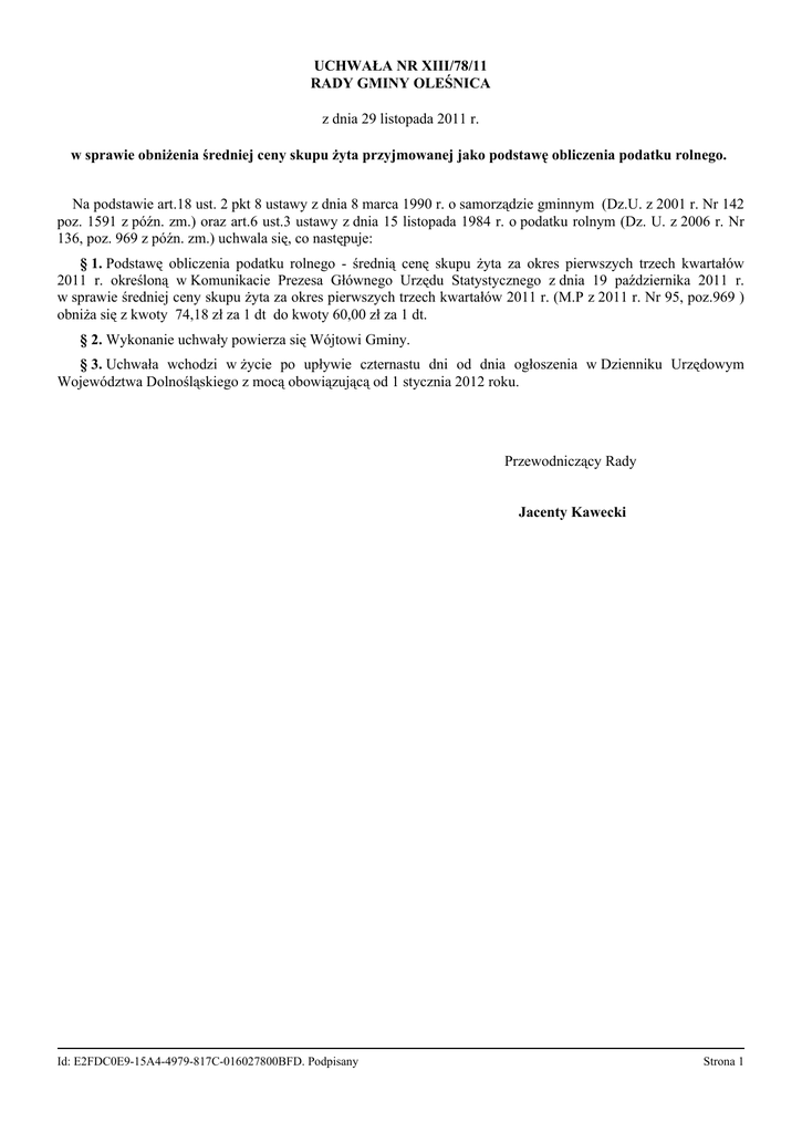 UCHWAŁA NR XIII/78/11 RADY GMINY OLEŚNICA z dnia 29 listopada 2011 r. w sprawie obniżenia średniej ceny skupu żyta przyjmowanej jako podstawę obliczenia podatku rolnego. Na podstawie art.18 ust. 2 pkt 8 ustawy z dnia 8 marca 1990 r. o samorządzie gminnym (Dz.U. z 2001 r. Nr 142 poz. 1591 z późn. zm.) oraz art.6 ust.3 ustawy z dnia 15 listopada 1984 r. o podatku rolnym (Dz. U. z 2006 r. Nr 136, poz. 969 z późn. zm.) uchwala się, co następuje: § 1. Podstawę obliczenia podatku rolnego średnią cenę skupu żyta za okres pierwszych trzech kwartałów 2011 r. określoną w Komunikacie Prezesa Głównego Urzędu Statystycznego z dnia 19 października 2011 r. w sprawie średniej ceny skupu żyta za okres pierwszych trzech kwartałów 2011 r. (M.P z 2011 r. Nr 95, poz.969 ) obniża się z kwoty 74,18 zł za 1 dt do kwoty 60,00 zł za 1 dt. § 2. Wykonanie uchwały powierza się Wójtowi Gminy. § 3. Uchwała wchodzi w życie po upływie czternastu dni od dnia ogłoszenia w Dzienniku Urzędowym Województwa Dolnośląskiego z mocą obowiązującą od 1 stycznia 2012 roku. Przewodniczący Rady Jacenty Kawecki Id: E2FDC0E915A44979817C016027800BFD. Podpisany Strona 1 Uzasadnienie Zgodnie z art. 6 ust 3 ustawy z dnia 15 listopada 1984 r. o podatku rolnym (Dz. U. z 2006 r. Nr 136, poz. 969, z późn. zm.) rada gminy jest uprawniona do obniżenia średniej ceny skupu przyjmowanej jako podstawa obliczania podatku rolnego na obszarze gminy. Średnią cenę skupu, ustala się na podstawie komunikatu Prezesa Głównego Urzędu Statystycznego, ogłaszanego w Dzienniku Urzędowym Rzeczypospolitej Polskiej "Monitor Polski" w terminie 20 dni po upływie trzeciego kwartału. Średnia cena skupu żyta za okres pierwszych trzech kwartałów 2011 r. wyniosła 74,18 zł za 1 dt. Przewiduje się, że w skutek obniżenia podstawy obliczenia podatku rolnego z 74,18 zł za 1 dt do 60,00 zł za 1 dt dochody budżetu gminy w 2012 roku z tytułu wpłat podatku rolnego przez podatników zostaną pomniejszone o około 490.000,00 zł. Należy wspomnieć, że podstawę opodatkowania podatkiem rolnym stanowi: 1) dla gruntów gospodarstw rolnych liczba hektarów przeliczeniowych ustalana na podstawie powierzchni, rodzajów i klas użytków rolnych wynikających z ewidencji gruntów i budynków oraz zaliczenia do okręgu podatkowego; 2) dla pozostałych gruntów liczba a podatek rolny za rok podatkowy wynosi: hektarów wynikająca z ewidencji gruntów i budynków, 1) od 1 ha przeliczeniowego gruntów gospodarstw rolnych równowartość pieniężną 2,5 q żyta, 2) od 1 ha gruntów, nie stanowiących gospodarstw rolnych równowartość pieniężną 5 q żyta obliczone według średniej ceny skupu żyta przyjmowanych jako podstawa obliczania podatku rolnego na obszarze gminy. Rada gminy kierując się własną oceną potrzeb wspólnoty samorządowej, jak i względami własnych dochodów, kształtuje politykę podatkową na szczeblu lokalnym. Polityka podatkowa jest jednym z elementów założeń gospodarczych i społecznych, a nie tylko elementem fiskalnym. Traktując „podatki lokalne” jako środek realizacji własnych zadań pozafinansowych, rada gminy może też określać stawki, obniżać je lub wprowadzać ulgi podatkowe zmierzające do osiągnięcia ważnych niekoniecznie fiskalnych celów oczywiście w granicach prawa. Id: E2FDC0E915A44979817C016027800BFD. Podpisany Strona 1