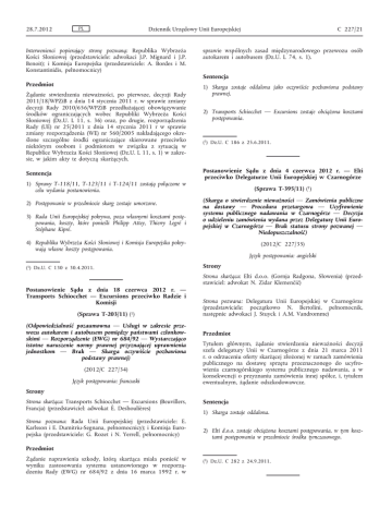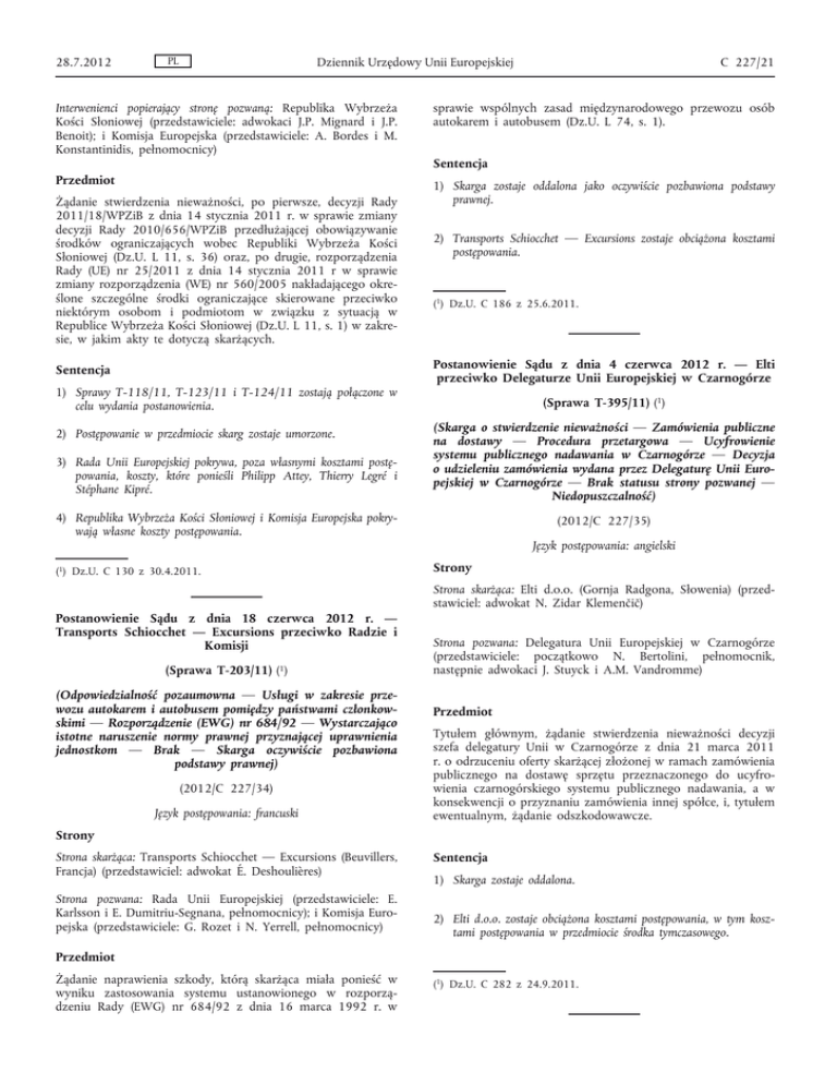 28.7.2012 PL Dziennik Urzędowy Unii Europejskiej Interwenienci popierający stronę pozwaną: Republika Wybrzeża Kości Słoniowej (przedstawiciele: adwokaci J.P. Mignard i J.P. Benoit); i Komisja Europejska (przedstawiciele: A. Bordes i M. Konstantinidis, pełnomocnicy) Przedmiot Żądanie stwierdzenia nieważności, po pierwsze, decyzji Rady 2011/18/WPZiB z dnia 14 stycznia 2011 r. w sprawie zmiany decyzji Rady 2010/656/WPZiB przedłużającej obowiązywanie środków ograniczających wobec Republiki Wybrzeża Kości Słoniowej (Dz.U. L 11, s. 36) oraz, po drugie, rozporządzenia Rady (UE) nr 25/2011 z dnia 14 stycznia 2011 r w sprawie zmiany rozporządzenia (WE) nr 560/2005 nakładającego okre ślone szczególne środki ograniczające skierowane przeciwko niektórym osobom i podmiotom w związku z sytuacją w Republice Wybrzeża Kości Słoniowej (Dz.U. L 11, s. 1) w zakre sie, w jakim akty te dotyczą skarżących. Sentencja 1) Sprawy T-118/11, T-123/11 i T-124/11 zostają połączone w celu wydania postanowienia. 2) Postępowanie w przedmiocie skarg zostaje umorzone. 3) Rada Unii Europejskiej pokrywa, poza własnymi kosztami postę powania, koszty, które ponieśli Philipp Attey, Thierry Legré i Stéphane Kipré. sprawie wspólnych zasad międzynarodowego przewozu osób autokarem i autobusem (Dz.U. L 74, s. 1). Sentencja 1) Skarga zostaje oddalona jako oczywiście pozbawiona podstawy prawnej. 2) Transports Schiocchet — Excursions zostaje obciążona kosztami postępowania. (1) Dz.U. C 186 z 25.6.2011. Postanowienie Sądu z dnia 4 czerwca 2012 r. — Elti przeciwko Delegaturze Unii Europejskiej w Czarnogórze (Sprawa T-395/11) (1) (Skarga o stwierdzenie nieważności — Zamówienia publiczne na dostawy — Procedura przetargowa — Ucyfrowienie systemu publicznego nadawania w Czarnogórze — Decyzja o udzieleniu zamówienia wydana przez Delegaturę Unii Euro pejskiej w Czarnogórze — Brak statusu strony pozwanej — Niedopuszczalność) 4) Republika Wybrzeża Kości Słoniowej i Komisja Europejska pokry wają własne koszty postępowania. (1) Dz.U. C 130 z 30.4.2011. C 227/21 (2012/C 227/35) Język postępowania: angielski Strony Strona skarżąca: Elti d.o.o. (Gornja Radgona, Słowenia) (przed stawiciel: adwokat N. Zidar Klemenčič) Postanowienie Sądu z dnia 18 czerwca 2012 r. — Transports Schiocchet — Excursions przeciwko Radzie i Komisji (Sprawa T-203/11) (1) (Odpowiedzialność pozaumowna — Usługi w zakresie prze wozu autokarem i autobusem pomiędzy państwami członkow skimi — Rozporządzenie (EWG) nr 684/92 — Wystarczająco istotne naruszenie normy prawnej przyznającej uprawnienia jednostkom — Brak — Skarga oczywiście pozbawiona podstawy prawnej) (2012/C 227/34) Język postępowania: francuski Strona pozwana: Delegatura Unii Europejskiej w Czarnogórze (przedstawiciele: początkowo N. Bertolini, pełnomocnik, następnie adwokaci J. Stuyck i A.M. Vandromme) Przedmiot Tytułem głównym, żądanie stwierdzenia nieważności decyzji szefa delegatury Unii w Czarnogórze z dnia 21 marca 2011 r. o odrzuceniu oferty skarżącej złożonej w ramach zamówienia publicznego na dostawę sprzętu przeznaczonego do ucyfro wienia czarnogórskiego systemu publicznego nadawania, a w konsekwencji o przyznaniu zamówienia innej spółce, i, tytułem ewentualnym, żądanie odszkodowawcze. Strony Strona skarżąca: Transports Schiocchet — Excursions (Beuvillers, Francja) (przedstawiciel: adwokat É. Deshoulières) Strona pozwana: Rada Unii Europejskiej (przedstawiciele: E. Karlsson i E. Dumitriu-Segnana, pełnomocnicy); i Komisja Euro pejska (przedstawiciele: G. Rozet i N. Yerrell, pełnomocnicy) Sentencja 1) Skarga zostaje oddalona. 2) Elti d.o.o. zostaje obciążona kosztami postępowania, w tym kosz tami postępowania w przedmiocie środka tymczasowego. Przedmiot Żądanie naprawienia szkody, którą skarżąca miała ponieść w wyniku zastosowania systemu ustanowionego w rozporzą dzeniu Rady (EWG) nr 684/92 z dnia 16 marca 1992 r. w (1) Dz.U. C 282 z 24.9.2011.
