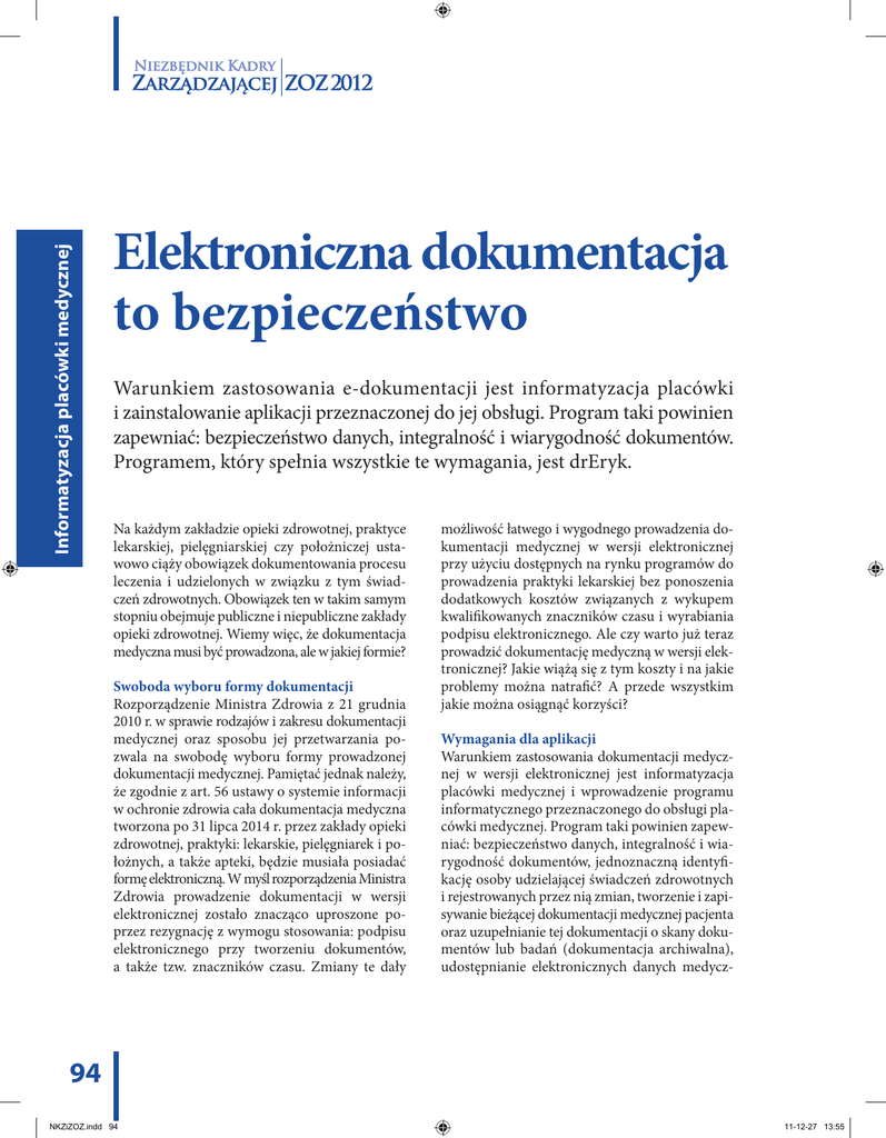 Informatyzacja placówki medycznej Elektroniczna dokumentacja to bezpieczeństwo Warunkiem zastosowania e-dokumentacji jest informatyzacja placówki i zainstalowanie aplikacji przeznaczonej do jej obsługi. Program taki powinien zapewniać: bezpieczeństwo danych, integralność i wiarygodność dokumentów. Programem, który spełnia wszystkie te wymagania, jest drEryk. Na każdym zakładzie opieki zdrowotnej, praktyce lekarskiej, pielęgniarskiej czy położniczej ustawowo ciąży obowiązek dokumentowania procesu leczenia i udzielonych w związku z tym świadczeń zdrowotnych. Obowiązek ten w takim samym stopniu obejmuje publiczne i niepubliczne zakłady opieki zdrowotnej. Wiemy więc, że dokumentacja medyczna musi być prowadzona, ale w jakiej formie? Swoboda wyboru formy dokumentacji Rozporządzenie Ministra Zdrowia z 21 grudnia 2010 r. w sprawie rodzajów i zakresu dokumentacji medycznej oraz sposobu jej przetwarzania pozwala na swobodę wyboru formy prowadzonej dokumentacji medycznej. Pamiętać jednak należy, że zgodnie z art. 56 ustawy o systemie informacji w ochronie zdrowia cała dokumentacja medyczna tworzona po 31 lipca 2014 r. przez zakłady opieki zdrowotnej, praktyki: lekarskie, pielęgniarek i położnych, a także apteki, będzie musiała posiadać formę elektroniczną. W myśl rozporządzenia Ministra Zdrowia prowadzenie dokumentacji w wersji elektronicznej zostało znacząco uproszone poprzez rezygnację z wymogu stosowania: podpisu elektronicznego przy tworzeniu dokumentów, a także tzw. znaczników czasu. Zmiany te dały możliwość łatwego i wygodnego prowadzenia dokumentacji medycznej w wersji elektronicznej przy użyciu dostępnych na rynku programów do prowadzenia praktyki lekarskiej bez ponoszenia dodatkowych kosztów związanych z wykupem kwalifikowanych znaczników czasu i wyrabiania podpisu elektronicznego. Ale czy warto już teraz prowadzić dokumentację medyczną w wersji elektronicznej? Jakie wiążą się z tym koszty i na jakie problemy można natrafić? A przede wszystkim jakie można osiągnąć korzyści? Wymagania dla aplikacji Warunkiem zastosowania dokumentacji medycznej w wersji elektronicznej jest informatyzacja placówki medycznej i wprowadzenie programu informatycznego przeznaczonego do obsługi placówki medycznej. Program taki powinien zapewniać: bezpieczeństwo danych, integralność i wiarygodność dokumentów, jednoznaczną identyfikację osoby udzielającej świadczeń zdrowotnych i rejestrowanych przez nią zmian, tworzenie i zapisywanie bieżącej dokumentacji medycznej pacjenta oraz uzupełnianie tej dokumentacji o skany dokumentów lub badań (dokumentacja archiwalna), udostępnianie elektronicznych danych medycz- 94 NKZiZOZ.indd 94 11-12-27 13:55 nych w formacie XML i PDF, możliwość drukowania kopii dokumentacji oraz eksport w postaci elektronicznej części lub całości danych w formacie XML. Programem, który spełnia wszystkie te wymagania, jest drEryk. Do wprowadzenia elektronicznej wersji dokumentacji medycznej konieczne będzie opracowanie procedur zabezpieczenia dokumentacji i systemów ich przetwarzania, a w szczególności procedury dostępu do dokumentacji medycznej. W przepisach regulujących kwestie związane z prowadzeniem e-dokumentacji szczególny nacisk położono na kwestie zachowania bezpieczeństwa zgromadzonych informacji i zabezpieczenia posiadanych danych przed utratą, kradzieżą lub dostępem osób nieuprawnionych. Niezbędne będzie również przygotowanie planu przechowywania dokumentacji w długim czasie, co jest szczególnie istotne ze względu na wydłużenie czasu archiwizowania dokumentacji medycznej do 20 lat. Wprowadzenie dokumentacji medycznej w wersji elektronicznej dotyczy praktycznie wszystkich procesów zachodzących w placówce medycznej: od rejestracji pacjenta, poprzez obsługę podczas wizyty, skończywszy na rozliczeniu z ubezpieczycielem. Wymaga to reorganizacji dotychczasowego systemu pracy. W początkowym etapie wprowadzania dokumentacji w formie elektronicznej należy liczyć się ze wydłużeniem czasu obsługi pacjentów i spowolnieniem tempa pracy. Program nie pozwoli na uchybienia proceduralne Wprowadzenie dokumentacji medycznej w formie elektronicznej pociąga za sobą wiele kosztów: zarówno typowo inwestycyjnych związanych z zakupem sprzętu komputerowego, licencji na oprogramowanie, usług wdrożeniowo-szkoleniowych, jak i organizacyjnych: związanych z zaangażowaniem osób w szkolenie i wdrożenie w nowy system pracy. Rozważmy teraz korzyści płynące z wprowadzenia dokumentacji medycznej w wersji elektronicznej. Naturalną konsekwencją wprowadzenia do placówki dobrego programu informatycznego i elektronicznej dokumentacji medycznej będzie stworzenie swoistego reżimu organizacyjnego (program nie pozwoli na uchybienia proceduralne), który wpłynie znacząco na ułatwienie przepływu informacji. Elektroniczna forma historii wizyty pacjenta sprawia, że informacje w niej zawarte są bardziej przejrzyste, czytelne i usystematyzowane – dzięki temu łatwiejsze do odczytania przez innego lekarza lub specjalistę. Elektroniczna forma dokumentów ułatwia przepływ informacji pomiędzy konsultującymi się specjalistami, pozwala także na błyskawiczny dostęp do pełnej historii medycznej pacjenta za dotknięciem klawisza, bez konieczności chodzenia do rejestracji czy archiwum. Kolejne zalety to możliwość generowania wydruków wszelkiego rodzaju skierowań (na badania, do specjalisty, szpitala), orzeczeń, zaświadczeń lekarskich na drukach ZUS ZLA i recept. Niektóre programy do prowadzenia praktyki lekarskiej, jak drEryk, posiadają dostępne w systemie aktualne informacje, czy dany lek jest refundowany i w jakiej wysokości przy konkretnym schorzeniu. Wbudowane w program słowniki kodów ICD-10, procedur medycznych ICD-9, kodów terytorialnych TERYT oraz bazy leków i szablony wizyt o typowym przebiegu pomagają personelowi medycznemu w codziennej 