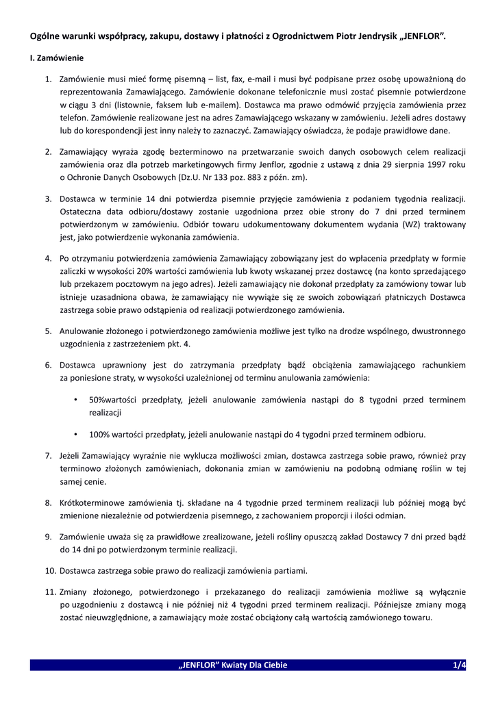Ogólne warunki współpracy, zakupu, dostawy i płatności z Ogrodnictwem Piotr Jendrysik „JENFLOR”. I. Zamówienie 1. Zamówienie musi mieć formę pisemną – list, fax, e-mail i musi być podpisane przez osobę upoważnioną do reprezentowania Zamawiającego. Zamówienie dokonane telefonicznie musi zostać pisemnie potwierdzone w ciągu 3 dni (listownie, faksem lub e-mailem). Dostawca ma prawo odmówić przyjęcia zamówienia przez telefon. Zamówienie realizowane jest na adres Zamawiającego wskazany w zamówieniu. Jeżeli adres dostawy lub do korespondencji jest inny należy to zaznaczyć. Zamawiający oświadcza, że podaje prawidłowe dane. 2. Zamawiający wyraża zgodę bezterminowo na przetwarzanie swoich danych osobowych celem realizacji zamówienia oraz dla potrzeb marketingowych firmy Jenflor, zgodnie z ustawą z dnia 29 sierpnia 1997 roku o Ochronie Danych Osobowych (Dz.U. Nr 133 poz. 883 z późn. zm). 3. Dostawca w terminie 14 dni potwierdza pisemnie przyjęcie zamówienia z podaniem tygodnia realizacji. Ostateczna data odbioru/dostawy zostanie uzgodniona przez obie strony do 7 dni przed terminem potwierdzonym w zamówieniu. Odbiór towaru udokumentowany dokumentem wydania (WZ) traktowany jest, jako potwierdzenie wykonania zamówienia. 4. Po otrzymaniu potwierdzenia zamówienia Zamawiający zobowiązany jest do wpłacenia przedpłaty w formie zaliczki w wysokości 20% wartości zamówienia lub kwoty wskazanej przez dostawcę (na konto sprzedającego lub przekazem pocztowym na jego adres). Jeżeli zamawiający nie dokonał przedpłaty za zamówiony towar lub istnieje uzasadniona obawa, że zamawiający nie wywiąże się ze swoich zobowiązań płatniczych Dostawca zastrzega sobie prawo odstąpienia od realizacji potwierdzonego zamówienia. 5. Anulowanie złożonego i potwierdzonego zamówienia możliwe jest tylko na drodze wspólnego, dwustronnego uzgodnienia z zastrzeżeniem pkt. 4. 6. Dostawca uprawniony jest do zatrzymania przedpłaty bądź obciążenia zamawiającego rachunkiem za poniesione straty, w wysokości uzależnionej od terminu anulowania zamówienia: • 50%wartości przedpłaty, jeżeli anulowanie zamówienia nastąpi do 8 tygodni przed terminem realizacji • 100% wartości przedpłaty, jeżeli anulowanie nastąpi do 4 tygodni przed terminem odbioru. 7. Jeżeli Zamawiający wyraźnie nie wyklucza możliwości zmian, dostawca zastrzega sobie prawo, również przy terminowo złożonych zamówieniach, dokonania zmian w zamówieniu na podobną odmianę roślin w tej samej cenie. 8. Krótkoterminowe zamówienia tj. składane na 4 tygodnie przed terminem realizacji lub później mogą być zmienione niezależnie od potwierdzenia pisemnego, z zachowaniem proporcji i ilości odmian. 9. Zamówienie uważa się za prawidłowe zrealizowane, jeżeli rośliny opuszczą zakład Dostawcy 7 dni przed bądź do 14 dni po potwierdzonym terminie realizacji. 10. Dostawca zastrzega sobie prawo do realizacji zamówienia partiami. 11. Zmiany złożonego, potwierdzonego i przekazanego do realizacji zamówienia możliwe są wyłącznie po uzgodnieniu z dostawcą i nie później niż 4 tygodni przed terminem realizacji. Późniejsze zmiany mogą zostać nieuwzględnione, a zamawiający może zostać obciążony całą wartością zamówionego towaru. „JENFLOR” Kwiaty Dla Ciebie 1/4 II. Zawarcie umowy 1. Prawnie wiążąca umowa zawarta zostaje dopiero wówczas, gdy dostawca umowę tę pisemnie potwierdzi. 2. Zamawiający związany jest umową przez złożone zamówienie do czasu potwierdzenia zamówienia przez dostawcę lub do upływu terminu 14 dni od dnia złożenia zamówienia. III. Termin Dostawy 1. Przy potwierdzonych przez dostawcę terminach dostawy chodzi o terminy w przybliżeniu. Ostateczny termin dostawy zostanie ustalony przez Strony na 7 dni przed upływem terminu wskazanego w potwierdzonym zamówieniu. 2. Dostawą we właściwym terminie jest również dostawa, która nastąpiła 7 dni przed do 14 dni po terminie dostawy wskazanym w potwierdzonym zamówieniu. Siła wyższa, nieurodzaj i zakłócenia w procesie rozwoju roślin, zakłócenia w ruchu, strajki i lokauty oraz zakłócenia nie dające się przewidzieć przez dostawcę – zwalniają z obowiązku dotrzymania potwierdzonego terminu dostawy lub zobowiązania do dostawy. W takim przypadku ustalają nowy termin dostawy. IV. Prawo odstąpienia. 1. Zamawiający uprawniony jest do odstąpienia od umowy z powodu niedotrzymania terminu dostawy określonego w pkt. III po uprzednim pisemnym wyznaczeniu dostawcy stosownego dodatkowego terminu dostawy z zagrożeniem odstąpienia. Jako stosowny termin rozumie się przynajmniej czterotygodniowy termin dostawy. 2. Dostawca jest uprawniony do odstąpienia od umowy, jeżeli kupujący zalega z odbiorem w terminie ustalonym przez Strony lub płatnością przedpłaty lub należności. Przez należności rozumie się również inne zobowiązania Zamawiającego wobec dostawcy. 3. Dostawca jest uprawniony do odstąpienia od umowy, jeżeli dostawa zamówionych przez zamawiającego wielkości czy gatunku roślin, lub też w uzgodnionym czy potwierdzonym terminie – rzeczywiście nie jest możliwa. V. Zastrzeżenie zmian. Jeżeli dostawa zamówionej wielkości lub gatunku jest rzeczywiście niemożliwa w uzgodnionym terminie mimo starań dostawcy, wówczas dostawca jest uprawniony do wysłania w miejsce zamówionego towaru w całości lub częściowo zastępczą lub mniejszą ilość, lub dokonać dostaw częściowych. VI. Ograniczenie odpowiedzialności. 1. Jeżeli zamawiający nie odbierze towaru w całości lub w części, lub odbierze w niewłaściwym czasie, albo, jeżeli życzy sobie późniejszej wysyłki niż to potwierdzono, wówczas ponosi on bez względu na winę wszystkie powstające z tego powodu szkody i koszty, także ponosi ryzyko zniszczenia lub uszkodzenia towaru. 2. Wszelkie informacje dotyczące kultury hodowli roślin, także te udzielane przez pracowni