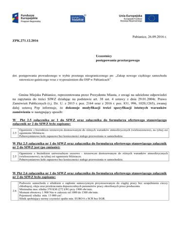 Pabianice, 26.09.2016 r. ZPK.271.12.2016 Uczestnicy postępowania przetargowego dot. postępowania prowadzonego w trybie przetargu nieograniczonego pn: „Zakup nowego ciężkiego samochodu ratowniczo-gaśniczego wraz z wyposażeniem dla OSP w Pabianicach” Gmina Miejska Pabianice, reprezentowana przez Prezydenta Miasta, z uwagi na udzielone odpowiedzi na zapytania do treści SIWZ działając na podstawie art. 38 ust. 4 ustawy z dnia 29.01.2004r. Prawo Zamówień Publicznych (t.j. Dz. U. z 2015 r. poz. 2164 oraz z 2016 r. poz. 831, 996, 1020,1265), zwanej dalej ustawą Pzp informuje, że dokonuje modyfikacji treści specyfikacji istotnych warunków zamówienia w następujący sposób: W Pkt 2.5 załącznika nr 1 do SIWZ oraz załącznika do formularza ofertowego stanowiącego załącznik nr 2 do SIWZ było zapisane: Ogumienie z bieżnikiem terenowym dostosowanym do różnych warunków atmosferycznych (wielosezonowe), na tylnej osi 2.5 ogumienie bliźniacze. Pełnowymiarowe koło zapasowe bez konieczności stałego przewożenia w samochodzie. W Pkt 2.5 załącznika nr 1 do SIWZ oraz załącznika do formularza ofertowego stanowiącego załącznik nr 2 do SIWZ jest (po zmianie): Ogumienie z bieżnikiem uniwersalnym szosowo - terenowym dostosowanym do różnych warunków atmosferycznych 2.5 (wielosezonowe), na tylnej osi ogumienie bliźniacze. Pełnowymiarowe koło zapasowe bez konieczności stałego przewożenia w samochodzie. W Pkt 2.6 załącznika nr 1 do SIWZ oraz załącznika do formularza ofertowego stanowiącego załącznik nr 2 do SIWZ było zapisane: Podwozie samochodu z silnikiem o zapłonie samoczynnym przystosowanym do ciągłej pracy bez uzupełniania cieczy chłodzącej, oleju oraz przekraczania dopuszczalnych parametrów pracy określonych przez producenta. Minimalna moc silnika 370 KM (272 kW) przy 1900 obr/min. 2.6 Moment obrotowy 1 900 Nm w zakresie od 1000 do 1300 obr/min. Pojemność silnika min. 13 000 cm3. Silnik spełniający normy czystości spalin min. EURO 6 z SCR bez EGR. W Pkt 2.6 załącznika nr 1 do SIWZ oraz załącznika do formularza ofertowego stanowiącego załącznik nr 2 do SIWZ jest (po zmianie): Podwozie samochodu z silnikiem o zapłonie samoczynnym przystosowanym do ciągłej pracy bez uzupełniania cieczy chłodzącej, oleju oraz przekraczania dopuszczalnych parametrów pracy określonych przez producenta. Minimalna moc silnika 370 KM (272 kW) przy 1900 obr/min. 2.6 Moment obrotowy 1 900 Nm w zakresie od 1000 do 1300 obr/min. Pojemność silnika min. 12 700 cm3. Silnik spełniający normy czystości spalin min. EURO 6 z SCR bez EGR. W Pkt 2.9 załącznika nr 1 do SIWZ oraz załącznika do formularza ofertowego stanowiącego załącznik nr 2 do SIWZ było zapisane: Kabina czterodrzwiowa, jednomodułowa, ze szkieletem z blachy cynkowanej galwanicznie i zabezpieczanej antykorozyjnie metodą kataforezy, zapewniająca dostęp do silnika z podwójnym systemem zabezpieczającym przed jej przypadkowym odchyleniem w czasie jazdy, o układzie miejsc 1 + 1 + 4 (siedzenia przodem do kierunku jazdy). Kabina posiada przednią szybę klejoną, pozostałe ze szkła bez odpryskowego. Podłoga kabiny musi mieć powierzchnię antypoślizgową. Wyklucza się możliwość zastosowania kabiny załogowej osiągniętej poprzez skręcenie kabiny dziennej z modułem kabiny brygadowej. Kabina wyposażona minimum w: • indywidualne oświetlenie do czytania mapy dla pozycji dowódcy; • uchwyty do trzymania dla załogi w tylnej części kabiny; • elektrycznie sterowane szyby przednie; • elektrycznie sterowane i ogrzewane lusterka zewnętrzne (główne i szerokokątne); • lusterko rampowe – krawężnikowe z prawej strony; • lusterko rampowe – dojazdowe, przednie; • główny wyłącznik oświetlenia skrytek; • reflektor pogorzeliskowy LED (szperacz) z mocowaniem na zewnątrz kabiny; • zewnętrzną osłonę przeciwsłoneczną z przodu dachu kabiny; 2.9 • informację o włączonym/wyłączonym ogrzewaniu przedziału autopompy; • radio z odtwarzaczem cd; • mocowanie 4 szt. aparatów ochrony dróg oddechowych umożliwiającym samodzielne zakładanie aparatu bez zdejmowania ze stelaża; • siedzenia pokryte materiałem łatwym w utrzymaniu czystości; • wszystkie fotele wyposażone w pasy bezpieczeństwa bezwładnościowe i zagłówki; • schowek pod siedziskami w tylnej części kabiny; • klimatyzację; • radiotelefon przewoźny analogowo-cyfrowy pracujący w zakresie częstotliwość VHF 136 – 174MHz, moc 1÷25W, min. 225 kanałowy, odstęp międzykanałowy 12,5 kHz z dodatkowym, wyłączanym zewnętrznym głośnikiem w przedziale autopompy lub manipulatorem radiostacji. Radiotelefon podłączony do instalacji antenowej zakończonej anteną radiową przystosowaną do pracy w sieci MSWiA; • podest z zasilaniem do ładowarek radiotelefonów przenośnych, latarek itd. z wyprowadzonym niezależnym zasilaniem 12V min. 10 A, z układem zabezpieczającym, automatycznie odłączającym zasilanie ładowarek przy napięciu na zaciskach akumulatora poniżej 22,5 V, wraz z układem pomiarowym wskazującym aktualne napięcie na zaciskach akumulatora. W Pkt 2.9 załącznika nr 1 do SIWZ oraz załącznika do formularza ofertowego stanowiącego załącznik nr 2 do SIWZ jest (po zmianie): Kabina czterodrzwiowa, jednomodułowa, ze szkieletem z blachy cynkowanej galwanicznie i zabezpieczanej antykorozyjnie metodą kataforezy, zapewniająca dostęp do silnika z podwójnym systemem zabezpieczającym przed jej przypadkowym odchyleniem w czasie jazdy, o układzie miejsc 1 + 1 + 4 (siedzenia przodem do kierunku jazdy). Kabina posiada przednią szybę klejoną, pozostałe ze szkła bez odpryskowego. Podłoga kabiny musi mieć powierzchnię antypoślizgową. Wyklucza się możliwość zastosowania kabiny załogowej osiągniętej poprzez skręcenie kabiny dziennej z modułem kabiny brygadowej. Kabina wyposażona minimum w: 2.9 • indywidualne oświetlenie do czytania mapy 
