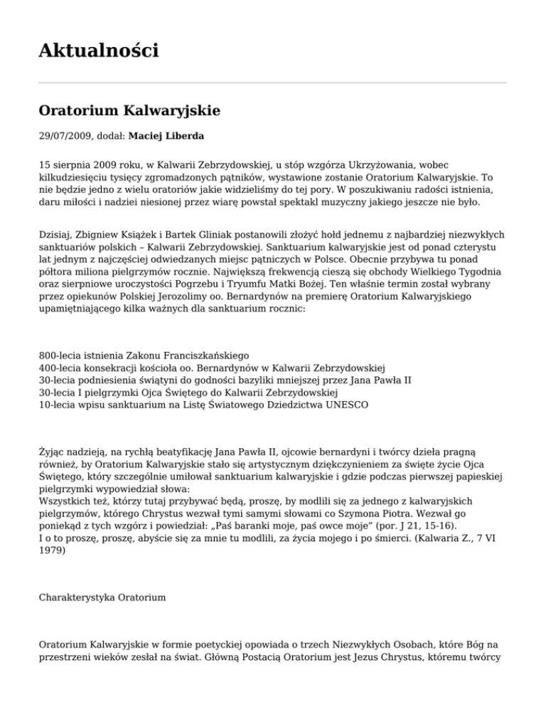 Aktualności Oratorium Kalwaryjskie 29/07/2009, dodał: Maciej Liberda 15 sierpnia 2009 roku, w Kalwarii Zebrzydowskiej, u stóp wzgórza Ukrzyżowania, wobec kilkudziesięciu tysięcy zgromadzonych pątników, wystawione zostanie Oratorium Kalwaryjskie. To nie będzie jedno z wielu oratoriów jakie widzieliśmy do tej pory. W poszukiwaniu radości istnienia, daru miłości i nadziei niesionej przez wiarę powstał spektakl muzyczny jakiego jeszcze nie było. Dzisiaj, Zbigniew Książek i Bartek Gliniak postanowili złożyć hołd jednemu z najbardziej niezwykłych sanktuariów polskich – Kalwarii Zebrzydowskiej. Sanktuarium kalwaryjskie jest od ponad czterystu lat jednym z najczęściej odwiedzanych miejsc pątniczych w Polsce. Obecnie przybywa tu ponad półtora miliona pielgrzymów rocznie. Największą frekwencją cieszą się obchody Wielkiego Tygodnia oraz sierpniowe uroczystości Pogrzebu i Tryumfu Matki Bożej. Ten właśnie termin został wybrany przez opiekunów Polskiej Jerozolimy oo. Bernardynów na premierę Oratorium Kalwaryjskiego upamiętniającego kilka ważnych dla sanktuarium rocznic: 800-lecia istnienia Zakonu Franciszkańskiego 400-lecia konsekracji kościoła oo. Bernardynów w Kalwarii Zebrzydowskiej 30-lecia podniesienia świątyni do godności bazyliki mniejszej przez Jana Pawła II 30-lecia I pielgrzymki Ojca Świętego do Kalwarii Zebrzydowskiej 10-lecia wpisu sanktuarium na Listę Światowego Dziedzictwa UNESCO Żyjąc nadzieją, na rychłą beatyfikację Jana Pawła II, ojcowie bernardyni i twórcy dzieła pragną również, by Oratorium Kalwaryjskie stało się artystycznym dziękczynieniem za święte życie Ojca Świętego, który szczególnie umiłował sanktuarium kalwaryjskie i gdzie podczas pierwszej papieskiej pielgrzymki wypowiedział słowa: Wszystkich też, którzy tutaj przybywać będą, proszę, by modlili się za jednego z kalwaryjskich pielgrzymów, którego Chrystus wezwał tymi samymi słowami co Szymona Piotra. Wezwał go poniekąd z tych wzgórz i powiedział: „Paś baranki moje, paś owce moje” (por. J 21, 15-16). I o to proszę, proszę, abyście się za mnie tu modlili, za życia mojego i po śmierci. (Kalwaria Z., 7 VI 1979) Charakterystyka Oratorium Oratorium Kalwaryjskie w formie poetyckiej opowiada o trzech Niezwykłych Osobach, które Bóg na przestrzeni wieków zesłał na świat. Główną Postacią Oratorium jest Jezus Chrystus, któremu twórcy poświęcili pierwszą część utworu. Dwie następne części dedykowane są wiernym naśladowcom Chrystusa: św. Franciszkowi z Asyżu i Janowi Pawłowi II, którzy krocząc śladami Mistrza, swoim życiem i nauczaniem dokonali swoistej „rewolucji”, przyczyniając się przede wszystkim do duchowej przemiany świata. Wierzyli Oni, że miłością naprawią świat, że dobrem pokonają zło, że swoim cierpieniem zdejmą z naszych ramion ból, że modlitwą wybłagają przebaczenie dla ludzkości. Potrafili oni cieszyć się, śmiać i radować światem i ludźmi. Jezus Chrystus z bezgranicznej miłości do ludzi oddał swoje życie za nasze życie wieczne. Przesłanie odpłacania dobrem za zło i miłowania nieprzyjaciół zrewolucjonizowało wszystko to, co było przed Nim. Około tysiąca lat później świat ujrzał „drugiego Chrystusa” w osobie św. Franciszka z Asyżu, którego całe życie było przepojone Zbawicielem. W dowód najwyższej przyjaźni i miłości Jezus wycisnął na jego ciele stygmaty swych najświętszych ran. Idąc Chrystusową drogą pokorny i ubogi Franciszek, dokonał rewolucji, która odmieniła Kościół i świat. I wreszcie na przełomie drugiego i trzeciego tysiąclecia Bóg dał ludzkości Jana Pawła II, który dokonał kolejnego przewrotu otwierając ramiona Kościoła w kierunku wszystkich ludzi i wszystkich religii. Stygmatami stały się kule zamachowca rozrywające jego ciało. Ani przez chwilę nie zapomniał o miłości swego życia - Maryi, Matce Zbawiciela, której zawierzył całe swoje życie mówiąc w sanktuarium kalwaryjskim: Tobie oddaję wszystkie owoce mego życia i posługi; Tobie zawierzam losy Kościoła; Tobie polecam mój naród; Tobie ufam i Tobie raz jeszcze wyznaję: Totus Tuus, Maria! Totus Tuus. (Kalwaria Z. 19 VIII 2002) Twórcy Oratorium Zbigniew Książek - poeta, scenarzysta, dramaturg. Jest twórcą bestselleru wydawniczego, który sprzedał się w milionie egzemplarzy – trzech oratoriów z muzyką Piotra Rubika znanych jako Tryptyk Świętokrzyski – tj. Świętokrzyska Golgota, Tu es Petrus oraz Psałterz wrześniowy. Jest laureatem prestiżowych nagród na festiwalach piosenki polskiej w Opolu i Sopocie. Ostatnim dokonaniem artysty jest oratorium z muzyką Bartłomieja Gliniaka pt. Siedem pieśni Marii. Po miesiącu płyta, będąca zapisem premiery oratorium, osiągnęła status złotej płyty. Bartłomiej Gliniak – kompozytor, absolwent Akademii Muzycznej w Krakowie, laureat konkursu kompozytorskiego we Francji w 1994. Był nominowany do „Orłów” (polskiej nagrody filmowej) w kategorii najlepsza muzyka. Jest autorem muzyki m.in. do takich filmów jak: Mój Nikifor, Komornik, oraz seriali Na dobre i na złe, Oficerowie. Skomponował muzykę do oratorium Siedem pieśni Marii, do którego słowa napisał Z. Książek. Wykonawcy W projekcie artystycznym udział weźmie ok. 160 wykonawców. Wybitnym solistom, chórom, orkiestrze symfonicznej towarzyszyć będzie sekcja rytmiczna z Krzysztofem Ścierańskim na gitarze basowej, Bartek Gliniak zagra na fortepianach elektrycznych i syntezatorach, zagrają czterej gitarzyści klasyczni m.in. Jacek Królik i Paweł Kwaśny oraz perkusista Robert Luty. Ola Bieńkowska, występująca na co dzień w „The Pink Floyd Schow” w Australii, koncertująca na wielkich scenach świata zaśpiewa w Oratorium Kalwaryjskim obok Joanny Słowińskiej, głównej solistki wszystkich poprzednich oratoriów. Solistami zaś będą panowie Przemek Branny, aktor teatru Bag