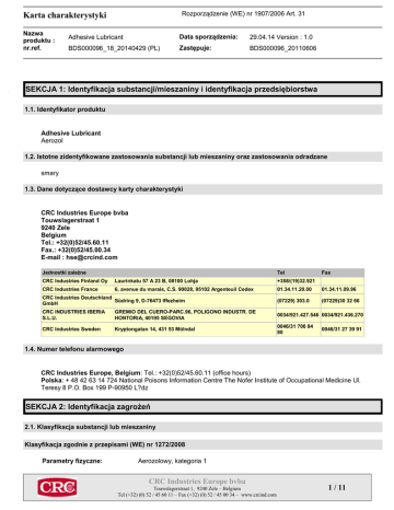 Rozporządzenie (WE) nr 1907/2006 Art. 31 Karta charakterystyki Nazwa produktu : nr.ref. Adhesive Lubricant Data sporządzenia: 29.04.14 Version : 1.0 BDS000096_18_20140429 (PL) Zastępuje: BDS000096_20110606 SEKCJA 1: Identyfikacja substancji/mieszaniny i identyfikacja przedsiębiorstwa 1.1. Identyfikator produktu Adhesive Lubricant Aerozol 1.2. Istotne zidentyfikowane zastosowania substancji lub mieszaniny oraz zastosowania odradzane smary 1.3. Dane dotyczące dostawcy karty charakterystyki CRC Industries Europe bvba Touwslagerstraat 1 9240 Zele Belgium Tel.: +32(0)52/45.60.11 Fax.: +32(0)52/45.00.34 E-mail : [email protected] Jednostki zależne Tel CRC Industries Finland Oy Laurinkatu 57 A 23 B, 08100 Lohja +358/(19)32.921 CRC Industries France 6, avenue du marais, C.S. 90028, 95102 Argenteuil Cedex Fax 01.34.11.20.00 01.34.11.09.96 CRC Industries Deutschland Südring 9, D-76473 Iffezheim GmbH (07229) 303.0 (07229)30 32 66 CRC INDUSTRIES IBERIA S.L.U. GREMIO DEL CUERO-PARC.96, POLIGONO INDUSTR. DE HONTORIA, 40195 SEGOVIA 0034/921.427.546 0034/921.436.270 CRC Industries Sweden Kryptongatan 14, 431 53 Mölndal 0046/31 706 84 80 0046/31 27 39 91 1.4. Numer telefonu alarmowego CRC Industries Europe, Belgium: Tel.: +32(0)52/45.60.11 (office hours) Polska: + 48 42 63 14 724 National Poisons Information Centre The Nofer Institute of Occupational Medicine Ul. Teresy 8 P.O. Box 199 P-90950 L?dz SEKCJA 2: Identyfikacja zagrożeń 2.1. Klasyfikacja substancji lub mieszaniny Klasyfikacja zgodnie z przepisami (WE) nr 1272/2008 Parametry fizyczne: Aerozolowy, kategoria 1 CRC Industries Europe bvba Touwslagerstraat 1, 9240 Zele – Belgium Tel (+32) (0) 52 / 45 60 11 – Fax (+32) (0) 52 / 45 00 34 – www.crcind.com 1 / 11 Rozporządzenie (WE) nr 1907/2006 Art. 31 Karta charakterystyki Nazwa produktu : nr.ref. Adhesive Lubricant Data sporządzenia: 29.04.14 Version : 1.0 BDS000096_18_20140429 (PL) Zastępuje: BDS000096_20110606 Skrajnie łatwopalny aerozol. Pojemnik pod ciśnieniem: Ogrzanie grozi wybuchem. Drażniące na skórę, kategoria 2 Działa drażniąco na skórę. Stwarzające zagrożenie dla środowiska wodnego, przewlekłe kategoria 3 Działa szkodliwie na organizmy wodne, powodując długotrwałe skutki. brak Zdrowie: Środowisko Naturalne : Inne zagrożenia : Klasyfikacja zgodnie z przepisami 67/548/EWG lub 1999/45/WE: SKRAJNIE ŁATWOPALNY Zdrowie: Parametry fizyczne: Środowisko Naturalne : Nie sklasyfikowany SKRAJNIE ŁATWOPALNY R52/53: Działa szkodliwie na organizmy wodne; może powodować długotrwałe niekorzystne zmiany w środowisku. 2.2. Elementy oznakowania Etykietowanie zgodnie z przepisami (WE) nr 1272/2008 Piktogram(y) zagrożeń: Zwroty hasłowe: Zwrot(y) wskazujące rodzaj zagrożenia: Zwrot(y) ostrzegawcze: Dodatkowe informacje dotyczące zagrożeń: Niebezpieczeństwo H222 : Skrajnie łatwopalny aerozol. H229 : Pojemnik pod ciśnieniem: Ogrzanie grozi wybuchem. H315 : Działa drażniąco na skórę. H412 : Działa szkodliwie na organizmy wodne, powodując długotrwałe skutki. P102 : Chronić przed dziećmi. P210 : Przechowywać z dala od źródeł ciepła, gorących powierzchni, źródeł iskrzenia, otwartego ognia i innych źródeł zapłonu. Nie palić. P211 : Nie rozpylać nad otwartym ogniem lub innym źródłem zapłonu. P251 : Nie przekłuwać ani nie spalać, nawet po zużyciu. P280 : Stosować rękawice ochronne/odzież ochronną/ochronę oczu/ochronę twarzy. P410/412 : Chronić przed światłem słonecznym. Nie wystawiać na działanie temperatury przekraczającej 50°C/122°F. P501-2 : Zawartość/pojemniki muszą być przekazywane do odpowiedniego punktu zbiórki odpadów. brak 2.3. Inne zagrożenia brak SEKCJA 3: Skład/informacja o składnikach CRC Industries Europe bvba Touwslagerstraat 1, 9240 Zele – Belgium Tel (+32) (0) 52 / 45 60 11 – Fax (+32) (0) 52 / 45 00 34 – www.crcind.com 2 / 11 Rozporządzenie (WE) nr 1907/2006 Art. 31 Karta charakterystyki Nazwa produktu : nr.ref. Adhesive Lubricant Data sporządzenia: 29.04.14 Version : 1.0 BDS000096_18_20140429 (PL) Zastępuje: BDS000096_20110606 3.1. Substancje Nie ma zastosowania. 3.2. Mieszaniny w/w % niebezpieczny składnik CAS - nr Węglowodory z destylacji ropy naftowej, bogate w węglowodory C3-4; Gaz z ropy naftowej 68512-91- 2704 990-9 50-75 F+ 12 K,G mineral oil (IP 346 DMSO extract < 3%) - 10-25 - - B Benzyna lekka obrabiana wodorem (ropa naftowa) 64742-49- 9210 024-6 <15 11-38-51/53F,Xn,N 65-67 Phosphoric acid, C8-16-alkyl esters, reaction products with (Z)-N-9-octadecenyl- 90506-47- 2911,3-propanediamine 1 909-3 1-5 Xi 36/38 EC-nr - symbol zwroty R* 2,6-di-tert-butyl-p-cresol 128-37-0 204881-4 <1 N 51/53 Phosphoric acid ester, amine salt - - <1 N 51/53 Noty B B Objaśnienie not B : substancja, której używanie jest ograniczone w miejscu pracy, jak ustalono w państwie G : exempted from the obligation to register in accordance with art.2(7)(a)of REACH Regulation No 1907/2006 K : nie klasyfikuje się jako rakotwórcza, mniej niż 0.1% w/w 1,3-butadienu (Einecs-nr 203-450-8) Numer rejestracyjny CAS nr Węglowodory z destylacji ropy naftowej, bogate w węglowodory C3-4; Gaz z ropy naftowej - 68512- 270- 5091-4 990-9 75 mineral oil (IP 346 DMSO extract < 3%) - ECnr w/w Klasa zagrożenia i % kategoria niebezpieczny składnik - 1025 Zwrot wskazujący rodzaj zagrożenia Noty Press. Gas, Flam. Gas 1 H280,H220 K,G - - B H225,H315,H336,H304,H411 B H400,H410 B Flam. Liq. 2, Skin Irrit. 2, Benzyna lekka obrabiana wodorem 0164742- 921<15 STOT SE 3, Asp. Tox. 1, (ropa naftowa) 2119475514-35 49-0 024-6 Aquatic Chronic 2 2,6-di-tert-butyl-p-cresol 01128-37- 204<1 2119555270-46 0 881-4 Aquatic Acute 1, Aquatic Chronic 1 Objaśnienie not B : substancja, której używanie jest ograniczone w miejscu pracy, jak ustalono w państwie G : exempted from the obligation to register in accordance with art.2(7)(a)of REACH Regulation No 1907/2006 K : nie klasyfikuje się jako rakotwórcza, mniej niż 0.1% w/w 1,3-b