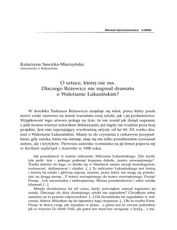 Katarzyna Sawicka-Mierzyńska Uniwersytet w Białymstoku O sztuce, której nie ma. Dlaczego Różewicz nie napisał dramatu o Walerianie Łukasińskim? W dorobku Tadeusza Różewicza znajduje się tekst, przez który poeta mówi wiele zarówno na temat warsztatu swej sztuki, jak i jej posłannictwa. Wyjątkowość tego utworu polega na tym, że nie został jak dotąd napisany i, jeśli można wierzyć autorskim deklaracjom, już nigdy nie wyjdzie poza fazę projektu. Jest nim zaprzątający wyobraźnię artysty od lat 60. XX wieku dramat o Walerianie Łukasińskim. Mamy tu do czynienia z ciekawym przypadkiem, gdy sztuka, która nie istnieje, staje się nie tylko przedmiotem rozważań autora, ale i krytyków. Pierwsza autorska wzmianka na jej temat pojawia się w Kartkach wydartych z dziennika w 1980 roku: Jak przedstawić w teatrze milczenie. Milczenie Łukasińskiego. Tyle myśli, tyle prób, tyle – pełnego potknięć krążenia dokoła „teatru wewnętrznego”. Trzeba dotrzeć do tego, co działo się w Hamlecie zanim zaczął monologować, rozmawiać, deklamować i działać. [...] To milczenie Łukasińskiego jest formą i treścią tej sztuki i główną zaporą, murem, przez który nie mogę się przedostać na drugą stronę... Z teatru zewnętrznego do teatru wewnętrznego. Poezja! Poezja... Lek uniwersalny i niebezpieczny. Można przedawkować i zabić sztukę (dramat) [...] Minęło dwadzieścia lat od czasu, kiedy powziąłem zamysł napisania tej sztuki. Dlaczego do dnia dzisiejszego sztuki nie napisałem? Chciałbym sobie samemu na to pytanie odpowiedzieć. [...] Od dwudziestu lat zapadałem w milczenie, ilekroć zbliżałem się do tajemnicy tego cierpienia. [...] Bo tu trzeba Poety. Pisząc te słowa czuję, jak wpadam w patos... a patos jest tu równie potrzebny jak w wierszu Do Matki Polki, ale patos ten musi być związany z liryką... z nie- 240 Katarzyna Sawicka-Mierzyńska zwykłą liryką... Jak napisać sztukę o czterdziestoletnim milczeniu? Można to tylko pisać w myślach i pisać milczeniem 1. Problem Łukasińskiego powraca podczas wywiadu-rzeki z Kazimierzem Braunem w 1987 roku w obrębie rozdziału Sztuki nienapisane, przedstawienia niezrealizowane. Opowiadając o nieistniejącym dramacie, Różewicz uruchamia jeszcze jeden aspekt swego obcowania z historią dręczonego patrioty – to już nie jest wspomniany patos poetycki, tylko najwyższy wymiar sacrum: T. R. [...] Trzydzieści lat milczał. To była ściana. To jest jakaś wielka tajemnica. I ja jej nie mogłem zgłębić. [...] To mnie nurtuje. Bardzo głęboko. Może nawet dziesięciu autorów to napisać... Ja myślę o moich trudnościach. To drążę. [...] Przez Łukasińskiego dotknąłem rzeczywiście największej tajemnicy. Przez jego milczenie i cierpienie. Sacrum. Sacrum. Dotknijmy tej sprawy... To msza, w kościele... nie mówię o kazaniach [...] Mówię o tym, co istotne we mszy. Mówię o Eucharystii. Tam nie ma miejsca na improwizację. Są jednak obszary absolutnej powagi [...] 2. Niezwykle istotna wydaje się wypowiedź Różewicza o nienapisanym utworze z 1991 roku. Poeta zawarł ją w referacie wygłoszonym na Uniwersytecie w Ottawie w trakcie sesji dotyczącej nowych tendencji w dramacie słowiańskim. Treść tych rozważań jest parafrazą tekstu zamieszczonego w Kartkach wydartych z dziennika – zmiany są efektem przystosowania dawnych zapisków do poetyki konferencyjnego odczytu, a rozwinięcie o szereg detali stanowi wyraźny ukłon w stronę obcokrajowców, dla których bez pewnych uzupełnień byłaby to wypowiedź niekomunikatywna. W słowach stanowiących rodzaj wstępu Różewicz, wskazując na specyfikę „Polskiego Życia”, polegającą na tym, że „największe wydarzenia w naszej historii od czasów Konstytucji 3 Maja [...] zaczynały się od Słowa, Tego słowa, które przemieniało się w czyn”, a wielka sztuka rodziła się w czasach największego ucisku, podkreśla jednocześnie, że: Nowa sztuka powstaje przez wynalezienie nowej formy, nowego wyrazu, nowego języka i składni [...]. Twórca zaangażowany to twórca zaangażowany w walkę o nową formę... treści są dane wszystkim; [...] jednak tylko artyści są skazani na rozwiązywanie problemów formy, dlatego epigon nie jest twórcą, bowiem problemy rozwiązują za niego prawdziwi Twórcy 3. 1 T. Różewicz, Kartki wydarte z dziennika, w: tegoż, Proza, t. 2, Kraków 1990, s. 514–516. K. Braun, T. Różewicz, Języki teatru, Wrocław 1989, s. 169–170. 3 T. Różewicz, Sztuka nienapisana, „Dialog” 1991, nr 10, s. 70. Ten sam pogląd wyrazi poeta także w rozmowie nagranej w 1996 roku dla „Dialogu”: „Twórczość to szukanie formy. Jak nie znajduję formy, nie piszę. Treść jest «d a n a». Słowami nie wypełni się rzeczywistości”; Zgubiony klucz. Z Tadeuszem Różewiczem rozmawia M. Dębicz, „Dialog” 1996, nr 10, s. 126. 2 O sztuce, której nie ma. Dlaczego Różewicz nie napisał dramatu o Walerianie Łukasińskim? 241 W referacie poeta podaje też kolejne wersje potencjalnego tytułu sztuki: Gdybym napisał tę sztukę – dałbym jej tytuł Ta mała dziura od Boga zapomniana Schlüsselburg – a może skróciłbym tytuł do jednego słowa Klucz – po niemiecku Schlüssel... 4, który w zapiskach z 1980 roku brzmiał po francusku: Ce petit trou nommé Schlüsselburg. Interpretacja tytułu przez autora jeszcze bardziej podnosi rangę przedstawianego dramatu, gdyż ma on być poszukiwanym przez Różewicza „kluczem” do „nowego rozdziału” jego dramaturgii, po którego odnalezieniu będzie mógł na zawsze porzucić teatr, ponieważ, jak można się domyślać, nie będzie miał w nim już nic nowego do powiedzenia. Warto zwrócić uwagę na fakt, że w zaledwie czterostronicowym referacie o nienapisanej sztuce zostają wykorzystane inne teksty, własne i cudze, przywoływane przez tytuły, cytaty czy imiona bohaterów: wiersz Różewicza Przyszli żeby zobacz