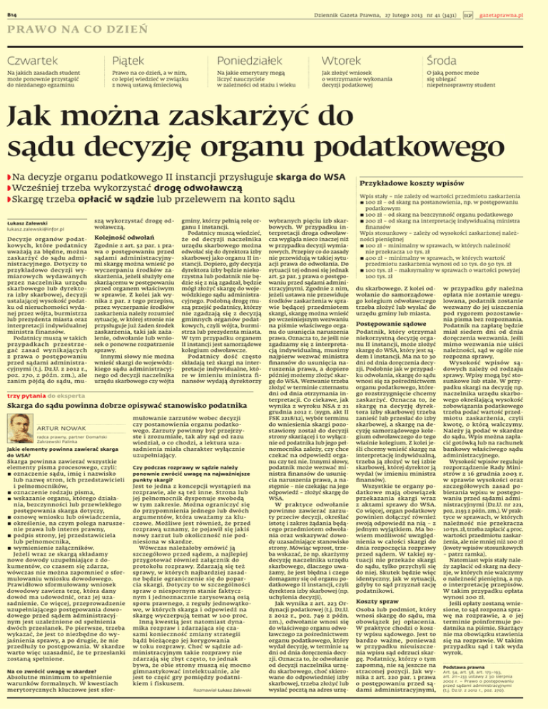 B14 Dziennik Gazeta Prawna, 27 lutego 2013 nr 41 (3431) gazetaprawna.pl P r aw o n a c o d z i e ń Czwartek Piątek Poniedziałek Wtorek Środa Na jakich zasadach student może ponownie przystąpić do niezdanego egzaminu Prawo na co dzień, a w nim, co lepiej wiedzieć w związku z nową ustawą śmieciową Na jakie emerytury mogą liczyć nauczyciele w zależności od stażu i wieku Jak złożyć wniosek o wstrzymanie wykonania decyzji podatkowej O jaką pomoc może się ubiegać niepełnosprawny student Jak można zaskarżyć do sądu decyzję organu podatkowego wN a decyzje organu podatkowego II instancji przysługuje skarga do WSA wW cześniej trzeba wykorzystać drogę odwoławczą wS kargę trzeba opłacić w sądzie lub przelewem na konto sądu Łukasz Zalewski [email protected] Decyzje organów podatkowych, które podatnicy uważają za błędne, można zaskarżyć do sądu administracyjnego. Dotyczy to przykładowo decyzji wymiarowych wydawanych przez naczelnika urzędu skarbowego lub dyrektora izby skarbowej, decyzji ustalającej wysokość podatku od nieruchomości wydanej przez wójta, burmistrza lub prezydenta miasta oraz interpretacji indywidualnej ministra finansów. Podatnicy muszą w takich przypadkach przestrzegać zasad wynikających z prawa o postępowaniu przed sądami administracyjnymi (t.j. Dz.U. z 2012 r., poz. 270, z późn. zm.), ale zanim pójdą do sądu, mu- szą wykorzystać drogę odwoławczą. Kolejność odwołań Zgodnie z art. 52 par. 1 prawa o postępowaniu przed sądami administracyjnymi skargę można wnieść po wyczerpaniu środków zaskarżenia, jeżeli służyły one skarżącemu w postępowaniu przed organem właściwym w sprawie. Z kolei jak wynika z par. 2 tego przepisu, przez wyczerpanie środków zaskarżenia należy rozumieć sytuację, w której stronie nie przysługuje już żaden środek zaskarżenia, taki jak zażalenie, odwołanie lub wniosek o ponowne rozpatrzenie sprawy. Innymi słowy nie można wnieść skargi do wojewódzkiego sądu administracyjnego od decyzji naczelnika urzędu skarbowego czy wójta gminy, którzy pełnią rolę organu I instancji. Podatnicy muszą wiedzieć, że od decyzji naczelnika urzędu skarbowego można odwołać się do dyrektora izby skarbowej jako organu II instancji. Dopiero, gdy decyzja dyrektora izby będzie niekorzystna lub podatnik nie będzie się z nią zgadzał, będzie mógł złożyć skargę do wojewódzkiego sądu administracyjnego. Podobną drogę muszą przejść podatnicy, którzy nie zgadzają się z decyzją gminnych organów podatkowych, czyli wójta, burmistrza lub prezydenta miasta. W tym przypadku organem II instancji jest samorządowe kolegium odwoławcze. Podatnicy dość często składają też skargi na interpretacje indywidualne, które w imieniu ministra finansów wydają dyrektorzy trzy pytania do eksperta Skarga do sądu powinna dobrze opisywać stanowisko podatnika ARtUR NowAk radca prawny, partner Domański Zakrzewski Palinka Jakie elementy powinna zawierać skarga do WSA? Skarga powinna zawierać wszystkie elementy pisma procesowego, czyli: ▪ oznaczenie sądu, imię i nazwisko lub nazwę stron, ich przedstawicieli i pełnomocników, ▪ oznaczenie rodzaju pisma, ▪ wskazanie organu, którego działania, bezczynności lub przewlekłego postępowania skarga dotyczy, ▪ osnowę wniosku lub oświadczenia, ▪ określenie, na czym polega naruszenie prawa lub interes prawny, ▪ podpis strony, jej przedstawiciela lub pełnomocnika, ▪ wymienienie załączników. Jeżeli wraz ze skargą składamy nowe dowody uzupełniające z dokumentów, co czasem się zdarza, wówczas nie można zapomnieć o sformułowaniu wniosku dowodowego. Prawidłowo sformułowany wniosek dowodowy zawiera tezę, która dany dowód ma udowodnić, oraz jej uzasadnienie. Co więcej, przeprowadzenie uzupełniającego postępowania dowodowego przed sądem administracyjnym jest uzależnione od spełnienia dwóch przesłanek. Po pierwsze, trzeba wykazać, że jest to niezbędne do wyjaśnienia sprawy, a po drugie, że nie przedłuży to postępowania. W skardze warto więc uzasadnić, że te przesłanki zostaną spełnione. Na co zwrócić uwagę w skardze? Absolutne minimum to spełnienie warunków formalnych. W kwestiach merytorycznych kluczowe jest sfor- mułowanie zarzutów wobec decyzji czy postanowienia organu podatkowego. Zarzuty powinny być przejrzyste i zrozumiałe, tak aby sąd od razu wiedział, o co chodzi, a lektura uzasadnienia miała charakter wyłącznie uzupełniający. Czy podczas rozprawy w sądzie należy ponownie zwrócić uwagę na najważniejsze punkty skargi? Jest to jedna z koncepcji wystąpień na rozprawie, ale są też inne. Strona lub jej pełnomocnik dysponuje swobodą w tym zakresie. Można ograniczyć się do przypomnienia jednego lub dwóch argumentów, która uważamy za kluczowe. Możliwe jest również, że przed rozprawą uznamy, że pojawił się jakiś nowy zarzut lub okoliczność nie podniesiona w skardze. Wówczas należałoby omówić ją szczegółowo przed sądem, a najlepiej przygotować również załącznik do protokołu rozprawy. Zdarzają się też sprawy, w których najbardziej zasadne będzie ograniczenie się do poparcia skargi. Dotyczy to w szczególności spraw o niespornym stanie faktycznym i jednoznacznie zarysowaną osią sporu prawnego, z reguły jednowątkowe, w których skarga i odpowiedź na skargę wyczerpują temat w 100 proc. Inną kwestią jest natomiast dynamika rozpraw i zdarzająca się czasami konieczność zmiany strategii bądź bieżącego jej korygowania w toku rozprawy. Choć w sądzie administracyjnym takie rozprawy nie zdarzają się zbyt często, to jednak bywa, że obie strony muszą się mocno gimnastykować intelektualnie, ale jest to część gry pomiędzy podatnikiem i fiskusem. Rozmawiał Łukasz Zalewski wybranych pięciu izb skarbowych. W przypadku interpretacji droga odwoławcza wygląda nieco inaczej niż w przypadku d