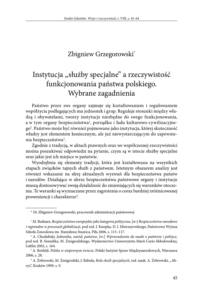 Studia Gdańskie. Wizje i rzeczywistość, t. VIII, s. 45–64 Zbigniew Grzegorowski* Instytucja „służby specjalne” a rzeczywistość funkcjonowania państwa polskiego. Wybrane zagadnienia Państwo przez swe organy zajmuje się kształtowaniem i regulowaniem współżycia podlegających mu jednostek i grup. Reguluje stosunki między władzą i obywatelami, tworzy instytucje niezbędne do swego funkcjonowania, a w tym organy bezpieczeństwa, porządku i ładu kulturowo-cywilizacyjnego. Państwo może być również pojmowane jako instytucja, której skuteczność władzy jest elementem koniecznym, ale już niewystarczającym do zapewnienia bezpieczeństwa. Zgodnie z tradycją, w aktach prawnych oraz we współczesnej rzeczywistości można poszukiwać odpowiedzi na pytanie, czym są w istocie służby specjalne oraz jakie jest ich miejsce w państwie. Wyodrębnia się elementy tradycji, która jest kształtowana na wszystkich etapach związków tajnych służb z państwem. Istotnym obszarem analizy jest również wskazanie na sferę aktualnych wyzwań dla bezpieczeństwa państw i narodów. Działające w sferze bezpieczeństwa państwowe organy i instytucje muszą dostosowywać swoją działalność do zmieniających się warunków otoczenia. Te warunki są wyznaczane przez zagrożenia o coraz bardziej zróżnicowanej proweniencji i charakterze. * Dr Zbigniew Grzegorowski, pracownik administracji państwowej. M. Bednarz, Bezpieczeństwo europejskie jako kategoria polityczna, [w:] Bezpieczeństwo narodowe i regionalne w procesach globalizacji, pod red. J. Knopka, D. J. Mierzejewskiego, Państwowa Wyższa Szkoła Zawodowa im. Stanisława Staszica, Piła 2006, s. 115–117. A. Chodubski, Jednostka, naród, państwo, [w:] Wprowadzenie do nauki o państwie i polityce, pod red. B. Szmulika, M. Żmigrodzkiego, Wydawnictwo Uniwersytetu Marii Curie-Skłodowskiej, Lublin 2002, s. 164. A. Rotfeld, Polska w niepewnym świecie, Polski Instytut Spraw Międzynarodowych, Warszawa 2006, s. 28. A. Żebrowski, M. Żmigrodzki, J. Babula, Rola służb specjalnych, red. nauk. A. Żebrowski, „Abrys”, Kraków 1999, s. 9. 45 Zbigniew Grzegorowski Proces rozszerzania funkcjonalnego zakresu pojęcia bezpieczeństwa państwa skutkuje, w wymiarze organizacyjnym, rozszerzeniem zakresu upoważnień do podejmowania tajnych działań wobec większej grupy instytucji państwa. Jednocześnie każde działanie organów państwa wobec jednostek i podmiotów prawnych niepaństwowych powinno być zgodne z obowiązującymi przepisami prawa. Stosunki między państwem i jego organami a obywatelami powinny być poddane określonym zasadom. Pierwszą z tych zasad jest zagwarantowanie obywatelom (podmiotom prawnym) ładu prawnego stanowionego przez organy państwowe. Zasada państwa prawnego zawiera się w adekwatności ingerencji prawnej w życie społeczne, zwłaszcza w sferę wolności obywateli. Reguła obowiązująca w państwie polega na ochronie praw legalnie nabytych. Jedną z istotnych cech państwa jest konstytucjonalizacja relacji pomiędzy państwem a jednostką, pozostająca w zasięgu bezpośredniego gwarantowania wolności i praw człowieka i obywatela na terytorium danego państwa. Kształtowanie się nowego ładu społecznego w Polsce jest związane z wyłanianiem się nowego ładu normatywnego, na który składają się: wartości i interesy rozumiane jako cele oraz przyjęte i stosowane środki, to znaczy reguły postępowania. Organy państwowe w ładzie polityczno-społecznym realizują przede wszystkim funkcje: ochronną, regulacyjną, innowacyjną i adaptacyjną, kulturalno-wychowawczą, socjalną i ekonomiczną. Jednocześnie współtworzą obraz narodu, umacniają więzi narodowe, kształtują świadomość i kulturę polityczną. Służby specjalne należy usytuować w strukturze państwa jako organu pełniącego przede wszystkim funkcję bezpieczeństwa wewnętrznego. W każdym państwie na system instytucjonalny bezpieczeństwa wewnętrznego składają się organy i urzędy o właściwości ogólnej, dla których zadania dotyczące tego rodzaju bezpieczeństwa stanowią jedną z wielu ról pełnionych w państwie, a także instytucje i organy wyspecjalizowane, dla których bezpieczeństwo wewnętrzne oznacza główny zakres zadań. Służby specjalne umiejscowione są w drugiej grupie instytucji i organów, obok innych służb mundurowych, takich jak policja, straż graniczna czy Biuro Ochrony Rządu. Służby specjalne pełnią w państwie przede wszystkim funkcję ochronną, w ramach której, między innymi, zapewniają bezpieczeństwo i porządek publiczny, ochronę mienia i zdrowia ludzi oraz trwałość systemu własności w weM. Grzybowski, Państwo prawa, [w:] Wprowadzenie do nauki o państwie…, dz. cyt., s. 111. Tamże, s. 111–112. M. Ziółkowski, Pragmatyzacja świadomości społeczeństwa polskiego, „Kultura i Społeczeństwo” 1994, nr 4, s. 23. A. Chodubski, Jednostka, naród, państwo..., dz. cyt., s. 165. G. Rydlewski, Kształt systemu instytucjonalnego bezpieczeństwa wewnętrznego w Polsce, [w:] Bezpieczeństwo wewnętrzne państwa. Wybrane zagadnienia, pod red. S. Sulowskiego, M. Brzezińskiego, Dom Wydawniczy Elipsa, Warszawa 2009, s. 134. 46 Instytucja „służby specjalne” a rzeczywistość funkcjonowania państwa polskiego... wnętrznej strukturze stosunków społecznych10. Każda z istniejących w Polsce służb specjalnych, takich jak ABW, AW, CBA, SWW czy SKW, wyodrębniona została instytucjonalnie i prawnie. Podstawową funkcją służb specjalnych w organizacji państwowej jest gwarantowanie bezpieczeństwa wewnętrznego i zewnętrznego państwa jako całości oraz obywateli11. Poszczególnym służbom przypisano, na podstawie aktów prawnych, określone funkcje i zadania, które sprowadzają się ogólnie do ochrony państwa przed zagrożeniami wewnętrznymi i zewnętrznymi. Funkcję ochronną przed zagrożeniami wewnętrznymi pełni przede wszystkim Agen