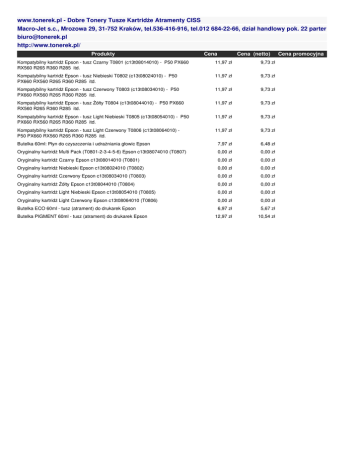 www.tonerek.pl - Dobre Tonery Tusze Kartridże Atramenty CISS Macro-Jet s.c., Mrozowa 29, 31-752 Kraków, tel.536-416-916, tel.012 684-22-66, dział handlowy pok. 22 parter [email protected] http://www.tonerek.pl/ Produkty Cena Cena (netto) Kompatybilny kartridż Epson - tusz Czarny T0801 (c13t08014010) - P50 PX660 RX560 R265 R360 R285 itd. 11,97 zł 9,73 zł Kompatybilny kartridż Epson - tusz Niebieski T0802 (c13t08024010) - P50 PX660 RX560 R265 R360 R285 itd. 11,97 zł 9,73 zł Kompatybilny kartridż Epson - tusz Czerwony T0803 (c13t08034010) - P50 PX660 RX560 R265 R360 R285 itd. 11,97 zł 9,73 zł Kompatybilny kartridż Epson - tusz Żółty T0804 (c13t08044010) - P50 PX660 RX560 R265 R360 R285 itd. 11,97 zł 9,73 zł Kompatybilny kartridż Epson - tusz Light Niebieski T0805 (c13t08054010) - P50 PX660 RX560 R265 R360 R285 itd. 11,97 zł 9,73 zł Kompatybilny kartridż Epson - tusz Light Czerwony T0806 (c13t08064010) P50 PX660 RX560 R265 R360 R285 itd. 11,97 zł 9,73 zł Butelka 60ml: Płyn do czyszczenia i udrażniania głowic Epson 7,97 zł 6,48 zł Oryginalny kartridż Multi Pack (T0801-2-3-4-5-6) Epson c13t08074010 (T0807) 0,00 zł 0,00 zł Oryginalny kartridż Czarny Epson c13t08014010 (T0801) 0,00 zł 0,00 zł Oryginalny kartridż Niebieski Epson c13t08024010 (T0802) 0,00 zł 0,00 zł Oryginalny kartridż Czerwony Epson c13t08034010 (T0803) 0,00 zł 0,00 zł Oryginalny kartridż Żółty Epson c13t08044010 (T0804) 0,00 zł 0,00 zł Oryginalny kartridż Light Niebieski Epson c13t08054010 (T0805) 0,00 zł 0,00 zł Oryginalny kartridż Light Czerwony Epson c13t08064010 (T0806) 0,00 zł 0,00 zł Butelka ECO 60ml - tusz (atrament) do drukarek Epson 6,97 zł 5,67 zł 12,97 zł 10,54 zł Butelka PIGMENT 60ml - tusz (atrament) do drukarek Epson Cena promocyjna