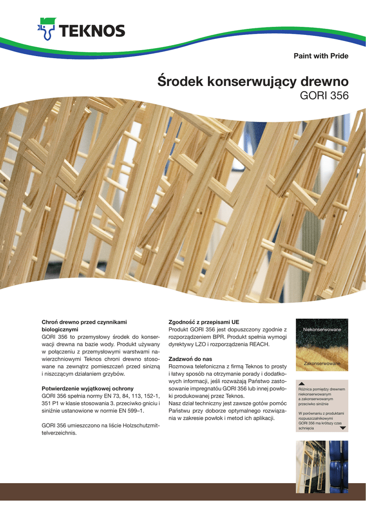 Środek konserwujący drewno GORI 356 Chroń drewno przed czynnikami biologicznymi GORI 356 to przemysłowy środek do konserwacji drewna na bazie wody. Produkt używany w połączeniu z przemysłowymi warstwami nawierzchniowymi Teknos chroni drewno stosowane na zewnątrz pomieszczeń przed sinizną i niszczącym działaniem grzybów. Potwierdzenie wyjątkowej ochrony GORI 356 spełnia normy EN 73, 84, 113, 152-1, 351 P1 w klasie stosowania 3. przeciwko gniciu i siniźnie ustanowione w normie EN 599–1. GORI 356 umieszczono na liście Holzschutzmittelverzeichnis. Zgodność z przepisami UE Produkt GORI 356 jest dopuszczony zgodnie z rozporządzeniem BPR. Produkt spełnia wymogi dyrektywy LZO i rozporządzenia REACH. Zadzwoń do nas Rozmowa telefoniczna z firmą Teknos to prosty i łatwy sposób na otrzymanie porady i dodatkowych informacji, jeśli rozważają Państwo zastosowanie impregnatóu GORI 356 lub innej powłoki produkowanej przez Teknos. Nasz dział techniczny jest zawsze gotów pomóc Państwu przy doborze optymalnego rozwiązania w zakresie powłok i metod ich aplikacji. Niekonserwowane Zakonserwowane Różnica pomiędzy drewnem niekonserwowanym a zakonserwowanym przeciwko siniźnie W porównaniu z produktami rozpuszczalnikowymi GORI 356 ma krótszy czas schnięcia Cechy i korzyści Cechy Korzyści Zoptymalizowana mieszanka środków grzybobójczych Zwiększona wytrzymałość zabezpieczanego drewna dzięki efektywnej ochronie przed grzybami niszczącymi drewno i sinizną (1) Zmniejszenie różnic w absorpcji podczas gruntowania Lepsze wyrównywanie kolorów transparentnych (2) Zmniejszona absorpcja wilgoci dzięki wysokogatunkowym, zmodyfikowanym spoiwom alkidowym Redukcja zmian wymiarowych drewna oraz zmniejszone ryzyko rozszczepień i wypaczeń (3) Nie zawiera pigmentów Głębsza penetracja drewna 1. 2. Płyn odparowywuje, lecz aktywne cząsteczki nadal chronią drewno Po lewej: Podkład 3. Bez środka konserwującego drewno Po prawej: Środek konserwujący drewno + podkład Ze środkiem konserwującym drewno GORI 356* Produkt GORI 356 Zawartość Substancje grzybobójcze, żywice syntetyczne, woda Opakowanie 20, 120 i 1000 l Zalecane systemy powłok Miękkie gatunki drewna 3-powłokowy Transparentny / Kryjący Wszystkie gatunki drewna 4-powłokowy Transparentny / Kryjący Środek konserwujący drewno* GORI 356 GORI 356 Podkład AQUAPRIMER 2900-22 (transparentny) / ANTISTAIN AQUA 2901-52 (biały, kryjące) AQUAPRIMER 2900-22 (transparentny) / ANTISTAIN AQUA 2901-52 (biały, kryjące) Warstwa pośrednia Warstwa nawierzchniowa AQUAFILLER 6500 / AQUAPRIMER 3130 GORI 660 GORI 660 * Produkt biobójczy – należy stosować z zachowaniem szczególnych środków ostrożności. Przed użyciem należy przeczytać etykietę i ulotkę informacyjną. www.teknos.com B092 2017-01 PL G Teknos Sp. z o.o. ul. Księcia Ziemowita 59 03-885 WARSZAWA Polska Tel. +48 22 678 70 04 [email protected] Teknos Oy Takkatie 3, P.O.Box 107 FI–00371 HELSINKI Finlandia Tel. +358 9 506 091 [email protected]