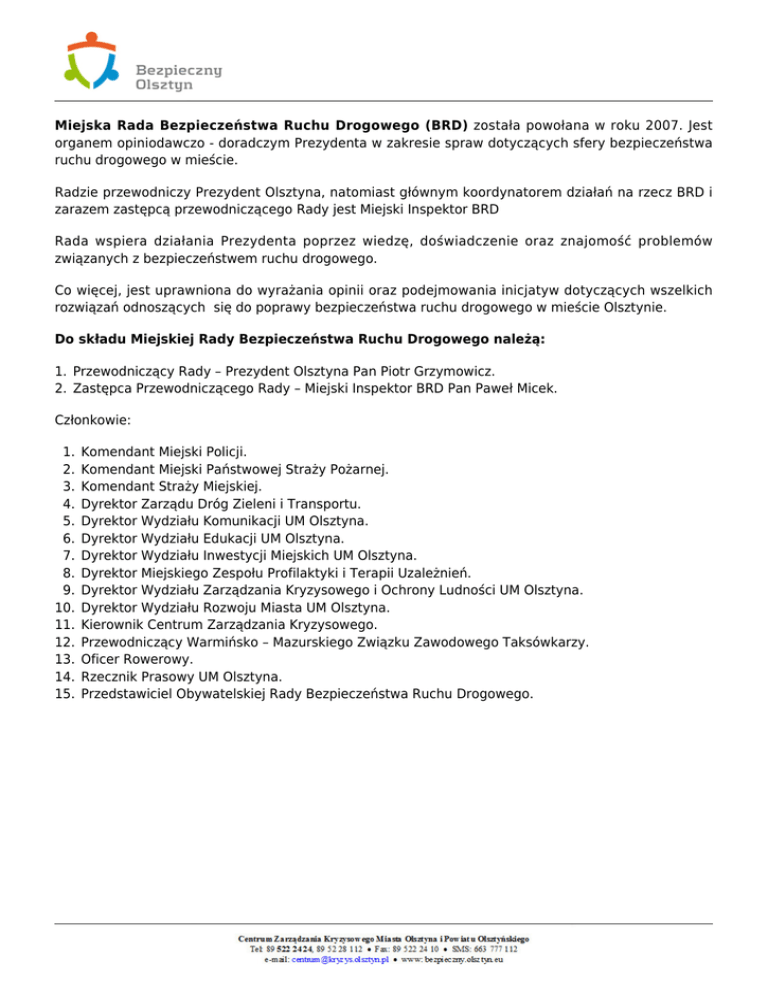 Miejska Rada Bezpieczeństwa Ruchu Drogowego (BRD) została powołana w roku 2007. Jest organem opiniodawczo - doradczym Prezydenta w zakresie spraw dotyczących sfery bezpieczeństwa ruchu drogowego w mieście. Radzie przewodniczy Prezydent Olsztyna, natomiast głównym koordynatorem działań na rzecz BRD i zarazem zastępcą przewodniczącego Rady jest Miejski Inspektor BRD Rada wspiera działania Prezydenta poprzez wiedzę, doświadczenie oraz znajomość problemów związanych z bezpieczeństwem ruchu drogowego. Co więcej, jest uprawniona do wyrażania opinii oraz podejmowania inicjatyw dotyczących wszelkich rozwiązań odnoszących się do poprawy bezpieczeństwa ruchu drogowego w mieście Olsztynie. Do składu Miejskiej Rady Bezpieczeństwa Ruchu Drogowego należą: 1. Przewodniczący Rady – Prezydent Olsztyna Pan Piotr Grzymowicz. 2. Zastępca Przewodniczącego Rady – Miejski Inspektor BRD Pan Paweł Micek. Członkowie: 1. 2. 3. 4. 5. 6. 7. 8. 9. 10. 11. 12. 13. 14. 15. Komendant Miejski Policji. Komendant Miejski Państwowej Straży Pożarnej. Komendant Straży Miejskiej. Dyrektor Zarządu Dróg Zieleni i Transportu. Dyrektor Wydziału Komunikacji UM Olsztyna. Dyrektor Wydziału Edukacji UM Olsztyna. Dyrektor Wydziału Inwestycji Miejskich UM Olsztyna. Dyrektor Miejskiego Zespołu Profilaktyki i Terapii Uzależnień. Dyrektor Wydziału Zarządzania Kryzysowego i Ochrony Ludności UM Olsztyna. Dyrektor Wydziału Rozwoju Miasta UM Olsztyna. Kierownik Centrum Zarządzania Kryzysowego. Przewodniczący Warmińsko – Mazurskiego Związku Zawodowego Taksówkarzy. Oficer Rowerowy. Rzecznik Prasowy UM Olsztyna. Przedstawiciel Obywatelskiej Rady Bezpieczeństwa Ruchu Drogowego.