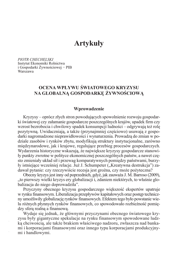 Artykuły Piotr CheChelski Instytut Ekonomiki Rolnictwa i Gospodarki Żywnościowej − PIB Warszawa OcenA wpływu świAtOwegO kryzysu nA glObAlną gOspOdArkę żywnOściOwą - - - - - wprowadzenie Kryzysy – oprócz złych stron powodujących spowolnienie rozwoju gospodarki światowej czy załamanie gospodarcze poszczególnych krajów, upadek firm czy wzrost bezrobocia i chwilowy spadek konsumpcji ludności – odgrywają też rolę pozytywną. Uwidaczniają, a także (przynajmniej częściowo) usuwają z gospodarki nagromadzone nieprawidłowości i wynaturzenia. Prowadzą do zmian w podziale zasobów i rynków zbytu, modyfikują struktury instytucjonalne, zarówno międzynarodowe, jak i krajowe, regulujące przebieg procesów gospodarczych. Wydarzenia historyczne wskazują, że największe kryzysy gospodarcze stanowiły punkty zwrotne w polityce ekonomicznej poszczególnych państw, a nawet często zmieniały układ sił i przewag komparatywnych pomiędzy państwami, burzyły istniejące wcześniej relacje. Już J. Schumpeter („Kreatywna destrukcja”) zadawał pytanie: czy rzeczywiście recesja jest groźna, czy może pożyteczna? Obecny kryzys jest inny od poprzednich, gdyż, jak zauważa J. M. Barroso (2009), „to pierwszy wielki kryzys ery globalizacji i, zdaniem niektórych, to właśnie globalizacja do niego doprowadziła”. Przyczyny obecnego kryzysu gospodarczego większość ekspertów upatruje w rynku finansowym. Liberalizacja przepływów kapitałowych oraz postęp techniczny umożliwiły globalizację rynków finansowych. Efektem tego było powstanie wielu różnych płynnych rynków finansowych, co spowodowało rozbieżność pomiędzy sferą realną a finansową. Wydaje się jednak, że głównymi przyczynami obecnego światowego kryzysu były gigantyczne spekulacje na rynku finansowym spowodowane ludzką chciwością, ale także brakiem właściwego nadzoru, zwłaszcza nad bankami i korporacjami finansowymi oraz innego typu korporacjami produkcyjnymi i handlowymi. 15 W obecnym kryzysie może budzić obawy szybki i nieograniczony wzrost korporacji transnarodowych oraz rosnąca ich przewaga nad pozostałymi podmiotami globalnej gospodarki. Dlatego też pozytywną stroną obecnego kryzysu może być uświadomienie społeczności świata, a zwłaszcza zarządzającym nim, jak wielkie znaczenie w globalnej gospodarce odgrywają KTN, a szczególnie korporacje finansowe. Świadczy o tym wypowiedź prezesa FED Bena Bernanke (Rzeczpospolita, 23.03.2010): „to niedorzeczne, że los światowej gospodarki jest tak bardzo zależny od kondycji kilku gigantów finansowych. Kryzys powinien nas nauczyć przynajmniej tego, że taka sytuacja nie może się powtórzyć”. Aktualnie jednym z najważniejszych problemów globalnych staje się wyżywienie rosnącej liczby ludności świata. Jednakże i tutaj dominuje partykularyzm interesów, reprezentowanych zarówno przez państwa, organizacje państw, jak i korporacje transnarodowe. Dostatek żywności na rynkach światowych nie powinien przesłaniać problemów i zagrożeń, jakie mogą wystąpić w nieodległej przyszłości. Z jednej strony szybko wzrasta popyt na żywność, a z drugiej pojawiają się istotne zagrożenia podażowe związane przede wszystkim z nasilającymi się ograniczeniami środowiskowymi, lecz także barierami ekonomicznymi, o których mówi się zdecydowanie mniej. W obliczu wyczerpywania się tradycyjnych możliwości rozwoju w produkcji żywności poprzez zwiększenie powierzchni gruntów pod uprawy, braku wody, istotne znaczenie będzie miała likwidacja barier ekonomicznych oraz rozwój nauki, szczególnie w zakresie inżynierii genetycznej i biologicznej. Spowoduje to, że ograniczone zasoby ziemi może nie będą przeszkodą w wyżywieniu ludności, ale mogą w jeszcze większym stopniu, niż ma to miejsce obecnie, uzależnić świat od działalności KTN ze wszystkimi tego skutkami, także negatywnymi, jak na przykład wzrost cen żywności, spekulacja na rynkach surowców rolnych, ograniczony dostęp do najnowszych technologii. Obecny kryzys dowiódł, że brak jest na świecie równowagi pomiędzy globalizacją polityczną a gospodarczą1. Noblista J. Stiglitz [27] słusznie zauważa, że „brak globalnego podejścia do globalnych karteli i monopoli jest jeszcze jednym przykładem tego, że globalizacja ekonomiczna wyprzedza globalizację polityczną”. Podobnego zdania jest W. Szymański [29], stwierdzając, że na obecnym etapie globalizacji głównym problemem staje się „narastanie nierównowagi między rosnącymi siłami kierującymi się interesem mikroekonomicznym a niedostatecznymi i coraz bardziej słabnącymi siłami kierującymi się interesem makroekonomicznym i makrospołecznym. Zaradzenie tym narastającym sprzecznościom jest jednym z głównych wyzwań XXI wieku.” Między innymi dlatego też obecną globalizację nazywa „globalizacją niekompletną”, a obecny kryzys „wyrazem nie radzenia sobie z funkcjonowaniem gospodarki globalnej”, bowiem „współczesny, niekompletny proces globalizacji przypomina grę bez reguł i bez arbitra” [29]. - - - - ocena wpływu światowego kryzysu na globalną gospodarkę żywnościową Procesy globalizacji realizowane są głównie poprzez działania korporacji transnarodowych (KTN), kierujących się interesem mikroekonomicznym (w sensie globalnym). Natomiast państwa, instytucje/ organizacje międzynarodowe oraz organizacje pozarządowe reprezentują i jednocześnie odpowiadają za globalizację polityczną (makroekonomiczną). - 1 16 Piotr Chechelski Niekompletna globalizacja sprawia, że powstaje możliwość wykorzystania tej sytuacji dla własnych partykularnych interesów. Czy obecny kryzys, który jest jej skutkiem, będzie w stanie zmienić ten układ? W obliczu szybko zachodzących zmian politycznych i gospodarczych również globalna gospodarka żywnościowa napotyka na szereg problemów związanych z jej rozwojem. Dotychcza