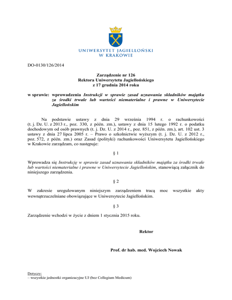 zarządzenie nr 126 Rektora UJ z 17 grudnia 2014 roku