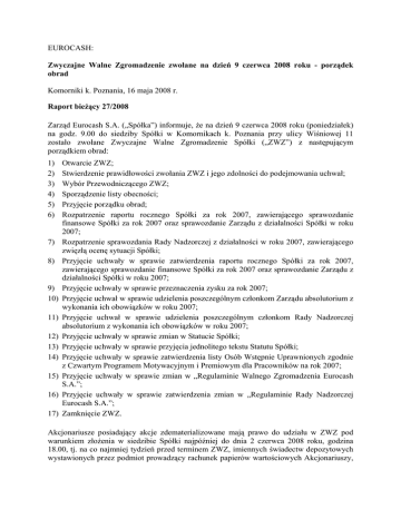 EUROCASH: Zwyczajne Walne Zgromadzenie zwołane na dzień 9 czerwca 2008 roku - porządek obrad Komorniki k. Poznania, 16 maja 2008 r. Raport bieżący 27/2008 Zarząd Eurocash S.A. („Spółka”) informuje, że na dzień 9 czerwca 2008 roku (poniedziałek) na godz. 9.00 do siedziby Spółki w Komornikach k. Poznania przy ulicy Wiśniowej 11 zostało zwołane Zwyczajne Walne Zgromadzenie Spółki („ZWZ”) z następującym porządkiem obrad: 1) 2) 3) 4) 5) 6) 7) 8) 9) 10) 11) 12) 13) 14) 15) 16) 17) Otwarcie ZWZ; Stwierdzenie prawidłowości zwołania ZWZ i jego zdolności do podejmowania uchwał; Wybór Przewodniczącego ZWZ; Sporządzenie listy obecności; Przyjęcie porządku obrad; Rozpatrzenie raportu rocznego Spółki za rok 2007, zawierającego sprawozdanie finansowe Spółki za rok 2007 oraz sprawozdanie Zarządu z działalności Spółki w roku 2007; Rozpatrzenie sprawozdania Rady Nadzorczej z działalności w roku 2007, zawierającego zwięzłą ocenę sytuacji Spółki; Przyjęcie uchwały w sprawie zatwierdzenia raportu rocznego Spółki za rok 2007, zawierającego sprawozdanie finansowe Spółki za rok 2007 oraz sprawozdanie Zarządu z działalności Spółki w roku 2007; Przyjęcie uchwały w sprawie przeznaczenia zysku za rok 2007; Przyjęcie uchwał w sprawie udzielenia poszczególnym członkom Zarządu absolutorium z wykonania ich obowiązków w roku 2007; Przyjęcie uchwał w sprawie udzielenia poszczególnym członkom Rady Nadzorczej absolutorium z wykonania ich obowiązków w roku 2007; Przyjęcie uchwały w sprawie zmian w Statucie Spółki; Przyjęcie uchwały w sprawie przyjęcia jednolitego tekstu Statutu Spółki; Przyjęcie uchwały w sprawie zatwierdzenia listy Osób Wstępnie Uprawnionych zgodnie z Czwartym Programem Motywacyjnym i Premiowym dla Pracowników na rok 2007; Przyjęcie uchwały w sprawie zmian w „Regulaminie Walnego Zgromadzenia Eurocash S.A.”; Przyjęcie uchwały w sprawie zatwierdzenia zmian w „Regulaminie Rady Nadzorczej Eurocash S.A.”; Zamknięcie ZWZ. Akcjonariusze posiadający akcje zdematerializowane mają prawo do udziału w ZWZ pod warunkiem złożenia w siedzibie Spółki najpóźniej do dnia 2 czerwca 2008 roku, godzina 18.00, tj. na co najmniej tydzień przed terminem ZWZ, imiennych świadectw depozytowych wystawionych przez podmiot prowadzący rachunek papierów wartościowych Akcjonariuszy, potwierdzających zdeponowanie na tym rachunku określonej liczby akcji Spółki, wraz z potwierdzeniem zablokowania tych akcji do zakończenia ZWZ. Akcjonariusze mogą uczestniczyć w ZWZ oraz wykonywać prawo głosu osobiście lub przez pełnomocników. Pełnomocnictwo do udziału w ZWZ musi być udzielone w formie pisemnej pod rygorem nieważności. Przedstawiciele osób prawnych powinni okazać aktualne odpisy z właściwych rejestrów, wymieniające osoby uprawnione do reprezentowania tych podmiotów. Osoba nie wymieniona w odpisie powinna posiadać pisemne pełnomocnictwo. Lista Akcjonariuszy uprawnionych do udziału w ZWZ będzie wyłożona w siedzibie Spółki od dnia 4 czerwca 2008 roku, tj. w terminie trzech dni powszednich przed terminem ZWZ. Wymagane przez przepisy prawa odpisy pozostałych dokumentów związanych ze ZWZ będą dostępne w siedzibie Spółki w terminach określonych przepisami. Rejestracja Akcjonariuszy i wydawanie kart do głosowania rozpocznie się w dniu odbycia ZWZ przed salą obrad o godz. 8.30. Jednocześnie zwracamy uwagę na zasadę IV.3 „Dobrych Praktyk Spółek Notowanych na GPW”, która stanowi, że akcjonariusz zgłaszający wniosek do porządku obrad walnego zgromadzenia, w tym wniosek o zaniechanie rozpatrywania sprawy umieszczonej w porządku obrad, powinien przedstawić uzasadnienie umożliwiające podjęcie uchwały z należytym rozeznaniem. W związku z zamierzoną zmianą Statutu, Zarząd Spółki przedstawia obowiązujące postanowienia § 2 ust. 1 i § 13 ust. 4 wraz z treścią projektowanych zmian, a także propozycje dodania nowego punktu (ix) w § 14 ust. 2 Statutu, dodania nowego punktu (viii) w § 14 ust. 3 Statutu oraz skreślenia punktu (ii) w § 14 ust. 4 Statutu: 1. § 2 ust. 1 Statutu Spółki jest: „1. Przedmiot działalności Spółki, z uwzględnieniem Polskiej Klasyfikacji Działalności (PKD) obejmuje: (1) (2) (3) (4) (5) (6) (7) (8) (9) (10) (11) 15.81.A – produkcję pieczywa, 15.81.B – produkcję wyrobów ciastkarskich świeżych, 15.82.Z – produkcję pieczywa cukierniczego trwałego, 50.30.A – sprzedaż hurtową części i akcesoriów do pojazdów mechanicznych, 50.30.B – sprzedaż detaliczną części i akcesoriów do pojazdów mechanicznych, 51.17.Z – działalność agentów zajmujących się sprzedażą żywności, napojów i wyrobów tytoniowych, 51.l8.Z – działalność agentów specjalizujących się w sprzedaży określonego towaru lub określonej grupy towarów, gdzie indziej nie sklasyfikowana, 51.19.Z – działalność agentów zajmujących się sprzedażą towarów różnego rodzaju 51.31.Z – sprzedaż hurtową owoców i warzyw; 51.32.Z – sprzedaż hurtową mięsa i wyrobów mięsnych, 51.33.Z – sprzedaż hurtową wyrobów mleczarskich, jaj, olejów i tłuszczów jadalnych (12) (13) (14) (15) (16) (17) (18) (19) (20) (21) (22) (23) (24) (25) (26) (27) (28) (29) (30) (31) (32) (33) (34) (35) (36) (37) (38) (39) (40) (41) (42) (43) (44) (45) (46) (47) (48) 51.34.A – sprzedaż hurtową napojów alkoholowych, 51.34.B – sprzedaż hurtową napojów bezalkoholowych, 51.35.Z – sprzedaż hurtową wyrobów tytoniowych 51.36.Z – sprzedaż hurtową cukru, czekolady i wyrobów cukierniczych 51.37.Z – sprzedaż hurtową herbaty, kawy , kakao i przypraw, 51.38.A – sprzedaż hurtową ryb, skorupiaków i mięczaków, 51.38.B – sprzedaż hurtową pozostałej żywności, 51.39.Z – nie wyspecjalizowaną sprzedaż hurtowa żywności, napojów i wyrobów tytoniowych 51.44.Z – sprzedaż hurtową wyrobów metalowych, porcelanowych, cera