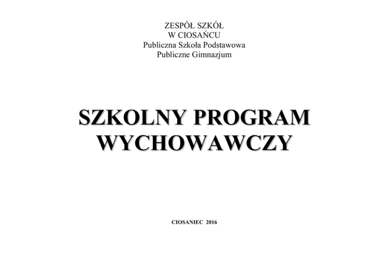 ZESPÓŁ SZKÓŁ W CIOSAŃCU Publiczna Szkoła Podstawowa Publiczne Gimnazjum SZKOLNY PROGRAM WYCHOWAWCZY CIOSANIEC 2016 Wychowanie jest uczeniem się szczególnego rodzaju - uczeniem się postaw, rozwijaniem wrażliwości, a także odkrywaniem własnych możliwości, talentów, mocnych stron i budowaniem na nich własnej tożsamości i siły. Jest też uczeniem się konstruktywnego radzenia sobie z własnymi brakami, trudnościami i negatywnymi emocjami. Jest więc i budowaniem człowieczeństwa. H.Rylke 2 Szkolny Program Wychowawczy opracowany został na podstawie: Konstytucji Rzeczypospolitej Polskiej, Konwencji o Prawach Dziecka przyjętej przez Zgromadzenie Ogólne Narodów Zjednoczonych dnia 20 listopada 1989, Ustawy o systemie oświaty, Ustawy Karta Nauczyciela, Rozporządzenie Ministra Edukacji Narodowej w sprawie podstawy programowej wychowania przedszkolnego oraz kształcenia ogólnego w poszczególnych typach szkół, Rządowego programu „Bezpieczna i przyjazna szkoła”, Statutów szkoły podstawowej i gimnazjum. Podstawa prawna: Konstytucja Rzeczypospolitej Polskiej Art. 48 ust.1 Rodzice mają prawo do wychowania dzieci zgodnie z własnymi przekonaniami. stopień dojrzałości dziecka, a także wolność sumienia i wyznania oraz jego przekonania. Wychowanie to powinno uwzględniać Art.53ust.3 Rodzice mają prawo do zapewnienia dzieciom wychowania i nauczania moralnego i religijnego zgodnie ze swoimi przekonaniami. Przepis art. 48 ust.1 stosuje się odpowiednio. Art.53ust.4 Religia kościoła lub innego związku wyznaniowego o uregulowanej sytuacji w szkole, przy czym nie może być naruszona wolność sumienia i religii innych osób. prawnej może być przedmiotem nauczania Art.70ust.1 Każdy ma prawo do nauki. Nauka do osiemnastego roku życia jest obowiązkowa. Sposób wykonania szkolnego obowiązku określa ustawa. Art.70ust.4 Władze publiczne zapewniają powszechny i równy dostęp do wykształcenia. W tym celu tworzą i wspierają system indywidualnej pomocy finansowej i organizacyjnej dla uczniów i studentów. Warunki udzielania pomocy określa ustawa. Art.72ust.1 Rzeczypospolita Polska zapewnia ochronę dziecka. Każdy ma prawo wymagać od organów władzy publicznej ochrony dziecka przed przemocą, okrucieństwem, wyzyskiem i demoralizacją. 3 Konwencja o Prawach Dziecka Art.3 1. We wszystkich działaniach dotyczących dzieci, podejmowanych przez publiczne lub prywatne instytucje opieki społecznej, sądy, władze administracyjne lub ciała ustawodawcze, sprawą nadrzędną będzie najlepsze zabezpieczenie interesów dziecka. 2. Państwa-Strony działają na rzecz zapewnienia dziecku ochrony i opieki w takim stopniu, w jakim jest to niezbędne dla jego dobra, biorąc pod uwagę prawa i obowiązki jego rodziców, opiekunów prawnych lub innych osób prawnie za nie odpowiedzialnych, i w tym celu będą podejmowały wszelkie właściwe kroki ustawodawcze oraz administracyjne. 3. Państwa-Strony czuwają, aby instytucje, służby oraz inne jednostki odpowiedzialne za opiekę lub ochronę dzieci dostosowały się do norm ustanowionych przez kompetentne władze, w szczególności w dziedzinach bezpieczeństwa, zdrowia Art. 4 Państwa - Strony podejmą wszelkie właściwe działania ustawodawczo-administracyjne oraz inne dla realizacji praw uznanych w konwencji. Ustawa o systemie oświaty z dnia 7 września 1991 z późniejszymi zmianami Oświata w Rzeczypospolitej Polskiej stanowi wspólne dobro całego społeczeństwa; kieruje się zasadami zawartymi w Konstytucji Rzeczypospolitej Polskiej, a także wskazaniami zawartymi w Powszechnej Deklaracji Praw Człowieka, Międzynarodowym Pakcie Praw Obywatelskich i Politycznych oraz Konwencji o Prawach Dziecka. Nauczanie i wychowanie - respektując chrześcijański system wartości - za podstawę przyjmuje uniwersalne zasady etyki. Kształcenie i wychowanie służy rozwijaniu u młodzieży poczucia odpowiedzialności, miłości ojczyzny oraz poszanowania dla polskiego dziedzictwa kulturowego, przy jednoczesnym otwarciu się na wartości kultur Europy i świata. Szkoła winna zapewnić każdemu uczniowi warunki niezbędne do jego rozwoju, przygotować go do wypełniania obowiązków rodzinnych i obywatelskich w oparciu o zasady solidarności, demokracji, tolerancji, sprawiedliwości i wolności. Art. 1 System oświaty zapewnia w szczególności pkt. 1,2,4, 5a i 6. 1. Realizację prawa każdego obywatela Rzeczypospolitej Polskiej do kształcenia się oraz prawa dzieci i młodzieży do wychowania i opieki, odpowiednich do wieku i osiągniętego rozwoju. 2. Wspomaganie przez szkołę wychowawczej roli rodziny. 4. Dostosowanie treści, metod i organizacji nauczania do możliwości psychofizycznych uczniów, a także możliwości korzystania z opieki psychologicznej i specjalnych form pracy dydaktycznej. 5a. Opiekę nad uczniami niepełnosprawnymi przez umożliwianie realizowania zindywidualizowanego procesu kształcenia, form i programów nauczania 6. Opiekę nad uczniami szczególnie zdolnymi poprzez umożliwianie realizowania indywidualnych form i programów nauczania, 4 Art. 4 Nauczyciel w swoich działaniach dydaktycznych, wychowawczych i opiekuńczych ma obowiązek kierowania się dobrem uczniów, troską o ich zdrowie, postawę moralną i obywatelską z poszanowaniem godności osobistej ucznia. Ustawa Karta Nauczyciela z dnia 26 stycznia 1982 z późniejszymi zmianami Art. 6 Nauczyciel obowiązany jest: 1) rzetelnie realizować zadania związane z powierzonym mu stanowiskiem oraz podstawowymi funkcjami szkoły: dydaktyczną, wychowawczą i opiekuńczą, w tym zadania związane z zapewnieniem bezpieczeństwa uczniom w czasie zajęć organizowanych przez szkołę; 2) wspierać każdego ucznia w jego rozwoju; 4) kształcić i wychowywać młodzież w umiłowaniu Ojczyzny, w poszanowaniu Konstytucji Rzeczypospolitej Polskiej, w atmosferze wolności sumienia i szacunku dla każdego człowieka; 5) dbać o kształtowanie u ucznió