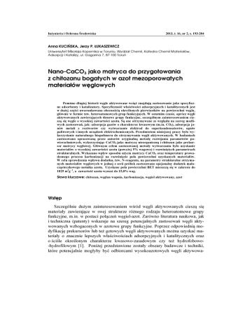 Inżynieria i Ochrona Środowiska 2013, t. 16, nr 2, s. 193-204 Anna KUCIŃSKA, Jerzy P. ŁUKASZEWICZ Uniwersytet Mikołaja Kopernika w Toruniu, Wydział Chemii, Katedra Chemii Materiałów, Adsorpcji i Katalizy, ul. Gagarina 7, 87-100 Toruń Nano-CaCO3 jako matryca do przygotowania z chitozanu bogatych w azot mezoporowatych materiałów węglowych Pomimo długiej historii węgle aktywowane wciąż znajdują zastosowanie jako specyficzne adsorbenty i katalizatory. Specyficzność właściwości adsorpcyjnych i katalitycznych jest w dużej części uwarunkowana obecnością określonych pierwiastków na powierzchni węgla, głównie w formie tzw. heteroatomowych grup funkcyjnych. W ostatnim czasie, oprócz węgli aktywowanych zawierających tlenowe grupy funkcyjne, szczególnym zainteresowaniem cieszą się węgle o wysokiej zawartości azotu. Są one otrzymywane ze względu na szereg możliwych zastosowań, jak: adsorpcja gazów o charakterze kwasowym (m.in. CO2), adsorpcja jonów metali z roztworów czy wytwarzanie elektrod do superkondensatorów, ogniw paliwowych i innych urządzeń elektrochemicznych. Przedmiotem niniejszej pracy było wykorzystanie naturalnego biopolimeru do otrzymywania węgli aktywowanych. W badaniach zastosowano opracowaną przez autorów oryginalną metodę rozwijania parametrów powierzchniowych, wykorzystując CaCO3 jako matrycę nieorganiczną i chitozan jako prekursor matrycy węglowej. Głównym celem zastosowanej metody wytwarzania było uzyskanie materiałów o wysokiej zawartości azotu (powyżej 5% wagowo) i rozwiniętych parametrach strukturalnych. Wykazano wpływ sposobu użycia matrycy CaCO3 oraz temperatury prowadzonego procesu karbonizacji na rozwinięcie pola powierzchni uzyskanych materiałów. W celu sprawdzenia wpływu dodatku, tzw. N-reagenta, na parametry strukturalne otrzymanych materiałów węglowych w jednej z serii próbek zastosowano opcjonalny dodatek małocząsteczkowego nośnika azotu. Uzyskane pola powierzchni BET mieszczą się w zakresie do 1025 m2g−1, a zawartość azotu wynosi do 15,0% wag. Słowa kluczowe: chitozan, węglan wapnia, karbonizacja, węgiel aktywowany, azot Wstęp Szczególnie dużym zainteresowaniem wśród węgli aktywowanych cieszą się materiały zawierające w swej strukturze różnego rodzaju heteroatomowe grupy funkcyjne, m.in. w postaci połączeń węgiel-azot. Zarówno literatura naukowa, jak i techniczna (patenty) wskazuje na szereg potencjalnych zastosowań węgli aktywowanych wzbogaconych w azotowe grupy funkcyjne. Poprzez odpowiednią modyfikację prekursorów lub też gotowych węgli aktywowanych można uzyskać materiały o znacznie lepszych właściwościach adsorpcyjnych i katalitycznych oraz o ściśle określonym charakterze kwasowo-zasadowym czy też hydrofobowo-hydrofilowym [1]. Poniżej przedstawione zostały obszary badawcze i techniki, które potencjalnie mogłyby być odbiorcami wysokoazotowych węgli aktywowa- 194 A. Kucińska, J.P. Łukaszewicz nych otrzymanych z chitozanu. Należy podkreślić, że w wymienionych obszarach prowadzone są intensywne prace badawcze dotyczące: − elektrochemicznych generatorów lub akumulatorów energii; − adsorbentów CO2 i innych substancji o charakterze kwasowym; − adsorbentów jonów metali ciężkich; − selektywnych katalizatorów. Szczególnie istotne wydają się zastosowania elektrochemiczne odwołujące się do specyficznych właściwości przypisywanych atomom węgla wbudowanym w matrycę węglową. Modyfikacja węgli aktywowanych przez wprowadzenie azotowych grup funkcyjnych jest obecnie uważana za skuteczną metodę dla zwiększenia przewodności elektrycznej węgli. Ponadto zaobserwowano zwiększenie zdolności do akumulacji (i delokalizacji) ładunku elektrycznego oraz katalizowania reakcji redox. Te właściwości wykorzystywane w superkondensatorach z elektrolitem wodnym umożliwiły wielokrotne zwiększenie pojemności elektrycznej w stosunku do kondensatorów bazujących tylko na ładowaniu warstwy podwójnej. Reakcje redox (na azotowych grupach funkcyjnych) są odpowiedzialne za zjawisko pseudopojemności elektrycznej w elektrolitach wodnych. W elektrolitach niewodnych może funkcjonować inny mechanizm wykorzystujący azotowe grupy funkcyjne [2]: ା −C − NHଶ : + Cଶ Hହ ା ସ ↔ −C − NHଶ : Cଶ Hହ ସ ା ା −C = NH: + Cଶ Hହ ସ ↔ −C = NH: Cଶ Hହ ସ ା −C ≡ N: + Cଶ Hହ ା ସ ↔ −C ≡ N: Cଶ Hହ ସ (1) (2) (3) Mechanizm ten wykorzystuje oddziaływanie z azotowymi grupami funkcyjnymi i powstawanie polaronów analogicznie do zachowania się polimerów przewodzących. Brak ugrupowań azotowych skutkuje zmniejszeniem pojemności elektrycznej superkondensatorów zawierających elektrody wykonane ze „zwykłego” (bez azotu) węgla aktywowanego. W dotychczas stosowanych metodach otrzymywania węgli wzbogaconych w azot wiodącym nurtem jest wygrzewanie prekursora lub węgla aktywowanego w obecności tzw. N-reagenta (np. amoniak, mocznik), czyli związku zawierającego w swej strukturze azotowe grupy funkcyjne. Innym ze sposobów jest karbonizacja i aktywacja (zwykle fizyczna) materiałów zawierających azot. Dotychczas koncentrowano się na wykorzystaniu syntetycznych polimerów, takich jak: poliakrylonitryl, poliamidy, poliimidy, poliwinylpirydyny, żywice melaminowo-formaldehydowe oraz mocznikowo-formaldehydowe. Odmiennym źródłem prekursorów węglowych coraz częściej zaczynają być bogate w azot prekursory pochodzenia roślinnego, takie jak: odpady pochodzące z uprawy i przetwórstwa soi, niskiej jakości węgle brunatne bogate w pochodne kwasów huminowych czy też pestki palmy olejowej. Wykorzystanie tego typu materiałów ma uzasadnienie zarówno z ekonomicznego (prowadzi do obniżenia kosztów produkcji adsorbentów), jak i proekologicznego punktu widzenia (rozwiązuje problem z zagospodarowaniem znacznej ilości odpadów). Znane są także nowatorskie metody syntez