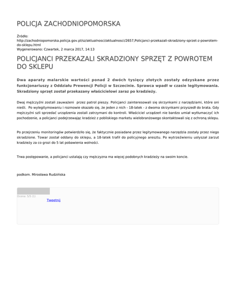 POLICJA ZACHODNIOPOMORSKA Źródło: http://zachodniopomorska.policja.gov.pl/sz/aktualnosci/aktualnosci/2657,Policjanci-przekazali-skradziony-sprzet-z-powrotemdo-sklepu.html Wygenerowano: Czwartek, 2 marca 2017, 14:13 POLICJANCI PRZEKAZALI SKRADZIONY SPRZĘT Z POWROTEM DO SKLEPU Dwa aparaty malarskie wartości ponad 2 dwóch tysięcy złotych zostały odzyskane przez funkcjonariuszy z Oddziału Prewencji Policji w Szczecinie. Sprawca wpadł w czasie legitymowania. Skradziony sprzęt został przekazany właścicielowi zaraz po kradzieży. Dwaj mężczyźni zostali zauważeni przez patrol pieszy. Policjanci zainteresowali się skrzynkami z narzędziami, które oni nieśli. Po wylegitymowaniu i rozmowie okazało się, że jeden z nich - 18-latek - z dwoma skrzynkami przyszedł do brata. Gdy mężczyźni szli sprzedać urządzenia zostali zatrzymani do kontroli. Właściciel urządzeń nie bardzo umiał wytłumaczyć ich pochodzenie, a policjanci podejrzewając kradzież z pobliskiego marketu wielobranżowego skontaktowali się z ochroną sklepu. Po przejrzeniu monitoringów potwierdziło się, że faktycznie posiadane przez legitymowanego narzędzia zostały przez niego skradzione. Towar został oddany do sklepu, a 18-latek trafił do policyjnego aresztu. Po wytrzeźwieniu usłyszał zarzut kradzieży za co grozi do 5 lat pobawienia wolności. Trwa postępowanie, a policjanci ustalają czy mężczyzna ma więcej podobnych kradzieży na swoim koncie. podkom. Mirosława Rudzińska Ocena: 5/5 (1) Tweetnij