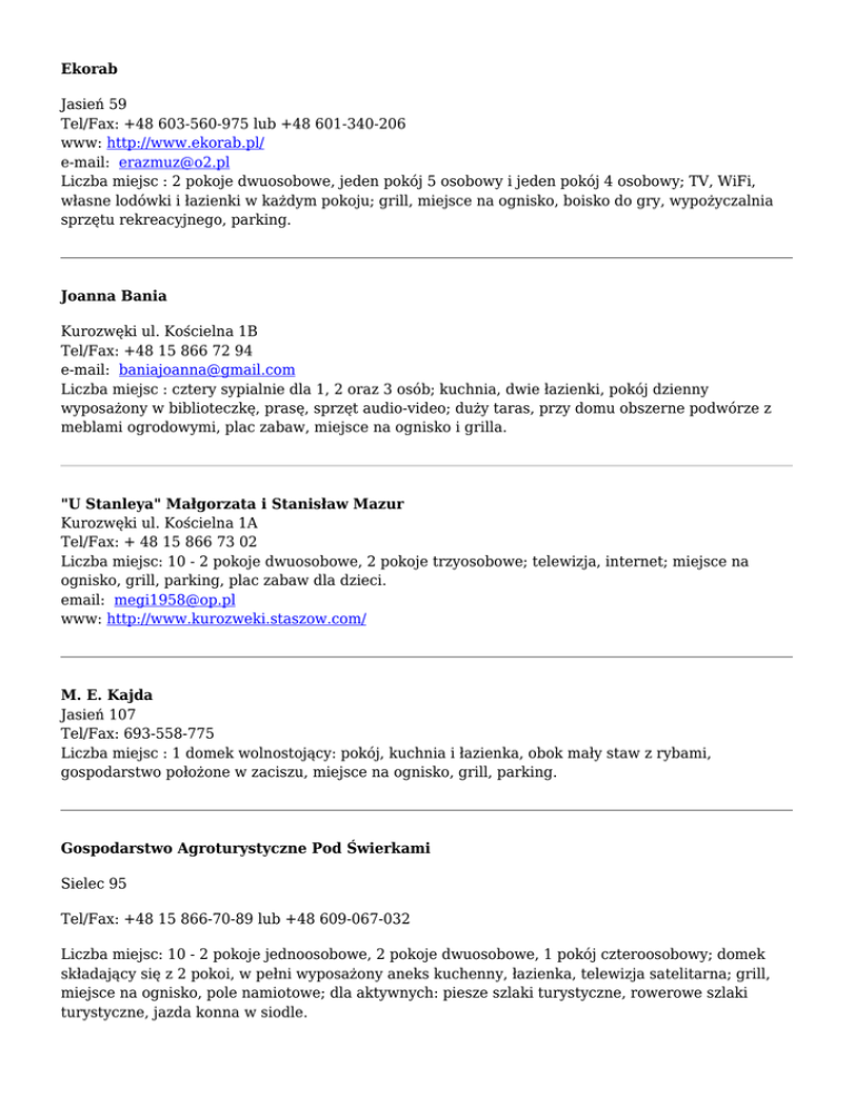 Ekorab Jasień 59 Tel/Fax: +48 603-560-975 lub +48 601-340-206 www: http://www.ekorab.pl/ e-mail: [email protected] Liczba miejsc : 2 pokoje dwuosobowe, jeden pokój 5 osobowy i jeden pokój 4 osobowy; TV, WiFi, własne lodówki i łazienki w każdym pokoju; grill, miejsce na ognisko, boisko do gry, wypożyczalnia sprzętu rekreacyjnego, parking. Joanna Bania Kurozwęki ul. Kościelna 1B Tel/Fax: +48 15 866 72 94 e-mail: [email protected] Liczba miejsc : cztery sypialnie dla 1, 2 oraz 3 osób; kuchnia, dwie łazienki, pokój dzienny wyposażony w biblioteczkę, prasę, sprzęt audio-video; duży taras, przy domu obszerne podwórze z meblami ogrodowymi, plac zabaw, miejsce na ognisko i grilla. "U Stanleya" Małgorzata i Stanisław Mazur Kurozwęki ul. Kościelna 1A Tel/Fax: + 48 15 866 73 02 Liczba miejsc: 10 - 2 pokoje dwuosobowe, 2 pokoje trzyosobowe; telewizja, internet; miejsce na ognisko, grill, parking, plac zabaw dla dzieci. email: [email protected] www: http://www.kurozweki.staszow.com/ M. E. Kajda Jasień 107 Tel/Fax: 693-558-775 Liczba miejsc : 1 domek wolnostojący: pokój, kuchnia i łazienka, obok mały staw z rybami, gospodarstwo położone w zaciszu, miejsce na ognisko, grill, parking. Gospodarstwo Agroturystyczne Pod Świerkami Sielec 95 Tel/Fax: +48 15 866-70-89 lub +48 609-067-032 Liczba miejsc: 10 - 2 pokoje jednoosobowe, 2 pokoje dwuosobowe, 1 pokój czteroosobowy; domek składający się z 2 pokoi, w pełni wyposażony aneks kuchenny, łazienka, telewizja satelitarna; grill, miejsce na ognisko, pole namiotowe; dla aktywnych: piesze szlaki turystyczne, rowerowe szlaki turystyczne, jazda konna w siodle. UWAGA: Niniejsza informacja zawiera tylko podstawowe dane adresowe. Jeśli brakuje tu twojego obiektu, prosimy o kontakt pod adresem: [email protected].