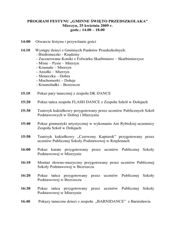 PROGRAM FESTYNU „GMINNE ŚWIĘTO PRZEDSZKOLAKA” Mierzyn, 25 kwietnia 2009 r. godz.: 14.00 – 18.00 14:00 Otwarcie festynu i przywitanie gości 14.10 Występy dzieci z Gminnych Punktów Przedszkolnych: - Biedroneczki - Rzędziny - Zaczarowane Koniki z Folwarku Skarbimierz – Skarbimierzyce - Misie – Pysie – Mierzyn - Krasnale – Mierzyn - Aniołki – Mierzyn - Słoneczka – Dobra - Muchomorki – Dołuje - Krasnoludki – Bezrzecze 15.10 Pokaz pary tanecznej z zespołu DK DANCE 15:20 Pokaz tańca zespołu FLASH DANCE z Zespołu Szkół w Dołujach 15:30 Teatrzyk kukiełkowy przygotowany przez uczniów Publicznych Szkół Podstawowych w Dobrej i Mierzynie 15:40 Pokaz gimnastyki artystycznej w wykonaniu Ani Rybickiej uczennicy Zespołu Szkół w Dołujach 15:50 Teatrzyk kukiełkowy „Czerwony Kapturek” przygotowany przez uczniów Publicznej Szkoły Podstawowej w Rzędzinach 16:00 Pokaz karate przygotowany przez uczniów Publicznej Szkoły Podstawowej w Mierzynie 16:10 MontaŜ słowno-muzyczny przygotowany przez uczniów Publicznej Szkoły Podstawowej w Bezrzeczu 16:20 Pokaz tańca przygotowany przez uczniów Publicznej Szkoły Podstawowej w Bezrzeczu 16:30 Pokaz tańca przygotowany przez uczniów Publicznej Szkoły Podstawowej w Mierzynie 16.40 Pokazy taneczne dzieci z zespołu „BARNIDANCE” z Barnisławia 17.00 Przedstawienie „NIE MA TEGO ZŁEGO” – Zarząd Gminy oraz kadra projektu „JAK DOBRZE BYĆ PRZEDSZKOLAKIEM” 17.20 Wręczenie nagród dla zwycięzców Konkursu w ramach „PIKNIKU ZE SZTUKĄ” 17.30 Gry i konkursy z nagrodami 18.00 Zakończenie festynu DODATKOWE ATRAKCJE: - dmuchany plac zabaw - pokazy szczudlarzy i Ŝąglerów - malowanie twarzy - pokazy działalności Gminnego Ośrodka Kultury, Bibliotek, Centrum Kształcenia, organizacji pozarządowych - promocja projektów STOWARZYSZENIA LOKALNA GRUPA DZIAŁANIA „DOBRE GMINY” - wata cukrowa i popcorn - ciasta - sałatki - kiełbasa z grilla - grochówka - pierogi I WIELE INNYCH SERDECZNIE ZAPRASZAM! Teresa Dera