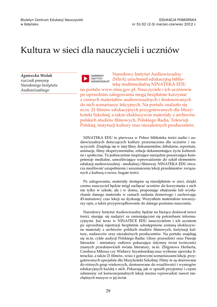 Biuletyn Centrum Edukacji Nauczycieli w Gdańsku EDUKACJA POMORSKA nr 51-52 (2-3) marzec-czerwiec 2012 r. Kultura w sieci dla nauczycieli i uczniów Agnieszka Wolak rzecznik prasowy Narodowego Instytutu Audiowizualnego Narodowy Instytut Audiowizualny (NInA) uruchomił edukacyjną bibliotekę multimedialną NINATEKA EDU na portalu www.nina.gov.pl. Nauczyciele i ich uczniowie po uprzednim zalogowaniu mogą bezpłatnie korzystać z cennych materiałów audiowizualnych i dostosowanych do nich scenariuszy lekcyjnych. Na portalu znalazło się m.in. 21 filmów edukacyjnych przygotowanych dla Muzykoteki Szkolnej, a także ekskluzywne materiały z archiwów polskich studiów filmowych, Polskiego Radia, Telewizji Polskiej, instytucji kultury oraz niezależnych producentów. NINATEKA EDU to pierwsza w Polsce biblioteka treści audio i audiowizualnych dotyczących kultury przeznaczona dla uczniów i nauczycieli. Znajdują się w niej filmy dokumentalne, fabularne, reportaże, animacje, filmy eksperymentalne, relacje dokumentujące życie kulturalne i społeczne. To jednocześnie inspirujące narzędzie poszerzające kompetencje medialne, umożliwiające wprowadzenie do szkół elementów edukacji audiowizualnej - medialnej i filmowej. NINATEKA EDU stwarza możliwość uzupełnienia i urozmaicenia lekcji przedmiotów związanych z kulturą o nowe, bogate treści. Po zalogowaniu, materiały dostępne są nieodpłatnie w sieci, dzięki czemu nauczyciel będzie mógł zachęcać uczniów do korzystania z nich nie tylko w szkole, ale i w domu, proponując obejrzenie lub wysłuchanie danego materiału w ramach zadania domowego i zachowując 45-minutowy czas lekcji na dyskusję. Wszystkim materiałom towarzyszy opis, a także przyporządkowanie do danego poziomu nauczania. Narodowy Instytut Audiowizualny będzie na bieżąco dodawał nowe treści, starając się nadążyć za zmieniającymi się potrzebami informacyjnymi. Już teraz w NINATECE EDU nauczycielom i ich uczniom po uprzedniej rejestracji bezpłatnie udostępnione zostaną ekskluzywne materiały z archiwów polskich studiów filmowych, instytucji kultury, nadawców oraz niezależnych producentów. Na portalu znajdują się m.in. cykle audycji Polskiego Radia: Głosy przeszłości oraz Finezje literackie - miniatury radiowe pokazujące intymny świat twórczości znanych przedstawicieli świata literatury, m.in. Zbigniewa Herberta, Czesława Miłosza czy Wisławy Szymborskiej oraz wybrane zjawiska literackie, a także 21 filmów, wraz z gotowymi scenariuszami lekcji, przygotowanych specjalnie dla Muzykoteki Szkolnej. Filmy te są skierowane do różnych grup wiekowych, dostosowane do wrażliwości i wymogów edukacyjnych każdej z nich. Pokazują, jak w sposób przyjemny i często odmienny od konwencjonalnych lekcji można wprowadzić nawet niechętnych muzyce w jej świat. 29 EDUKACJA POMORSKA nr 51-52 (2-3) marzec-czerwiec 2012 r. Wartość dydaktyczną niosą także filmy dokumentalne, m.in. portrety Gustawa Herlinga-Grudzińskiego, Tadeusza Borowskiego, Sławomira Mrożka, Wojciecha Jerzego Hasa, Jerzego Giedroycia, Józefa Tischnera, Jerzego Kawalerowicza, ale także film Pawła Kędzierskiego o przemianach ustrojowych w Polsce, opowieść Wojciecha Szpaka o zagranicznych podróżach Henryka Sienkiewicza, kronika powstania w getcie warszawskim według Marka Edelmana czy wypowiedzi twórców Polskiej Szkoły Filmowej. Cenne uzupełnienie materiału szkolnego stanowi klasyka polskiej animacji dla dzieci oraz animacji eksperymentalnej z archiwów Studia Miniatur Filmowych. W NINATECE EDU młodzi użytkownicy znajdą m.in. filmy o przygodach słonia Dominika i krasnala Hałabały, o grzebieniu, który nie chciał myć zębów czy dowiedzą się, jak działa jamniczek? Do zawartości NINATEKI EDU dołączył cykl wykładów otwartych Teatru Narodowego wygłaszanych między 1999 a 2007 rokiem przez krytyków literackich, filmowych i teatralnych, historyków sztuki, aktorów, dziennikarzy, reżyserów, eseistów. Już teraz dostępne są referaty Rafała Węgrzyniaka, Jerzego Jarzębskiego, Janusza Deglera, Grzegorza Niziołka i Tadeusza Sobolewskiego z cykli: Wielki teatr świata, Teatr XX wieku, Ciało widzialne oraz Obecność aktora. NINATEKA EDU została zaprojektowana z myślą o nauczycielach, którzy chcą uczyć w oparciu o audiowizualne treści kultury. Znajdą tu ponad 50 scenariuszy lekcyjnych (w tym 21 dedykowanych Muzykotece Szkolnej) opracowanych dla konkretnych materiałów audiowizualnych. Stworzone przez doświadczonych pedagogów i dostosowane do pracy z multimediami scenariusze są dostępne wyłącznie dla nauczycieli zarejestrowanych w NINATECE EDU. Materiałem wyjściowym każdego z nich jest audycja, film lub animacja z zasobów biblioteki. Scenariusz koncentruje się na danym temacie, często jednak ujmuje zagadnienia interdyscyplinarnie, łącząc konteksty z różnych dziedzin i pozwalając na wykorzystanie go na wielu przed- Biuletyn Centrum Edukacji Nauczycieli w Gdańsku miotach humanistycznych, np. wiedzy o kulturze, języku polskim, historii, wiedzy o społeczeństwie czy muzyce. Nauczyciel posiada pełną kontrolę nad wykorzystaniem tego narzędzia: może sam komponować lekcje i zadawać prace domowe w oparciu o zasoby NINATEKI EDU, korzystać z dostępnych scenariuszy, a nawet dodawać własne (po ich weryfikacji przez redaktorów portalu). W przyszłości uczniowie i nauczyciele będą mogli włączać własne materiały filmowe, a nawet wymieniać się nimi. By korzystać z materiałów zamieszczonych na portalu należy zarejestrować się pod adresem: www. nina.gov.pl/edukacja/ninateka-edu. Nauczyciel proszony jest o wypełnienie formularza – wpisanie danych swoich i szkoły. W przeciągu 10 dni nastąpi weryfikacja zgłoszenia i konto nauczycielskie zostanie aktywowane, a pedagog będzie mógł wygenerować indywidualne kody dostępu dla swoich uczniów. Zespół działu badań i edukacji NInA jest gotów 