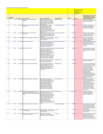 Lista wniosków odrzuconych ze względów formalnych 2. Lp 6. Zadanie kwalifikuje się do poddania pod głosowanie mieszkańców gminy Niepołomice 7. 1. Identyfikator zadania Data zlożenia Nazwa zadania 9 11254 2015-06-22 Wymiana nawierzchni drogi Ścieżka Głogowa Skrócony opis zadania Wymiana nawierzchni drogi ulicy Ścieżka Głodowa od numeru 15 do numeru 19 (wjazd od ul. Okrężnej) oraz utworzenie połączenia drogi Ścieżka Głogowa z drogą Okrężną przy numerze 19. Wniosek dotyczy dokończenia remontu płyty Rynku od sklepu warzywnego wzdłuż ściany wschodniej do kantoru wymiany walut. Dotyczy ułożenia kostki brukowej - takiej samej jak chodnik od kapliczki do kantoru wymiany walut, o szerokości 1,5 m. Wykonanie dróg rowerowych na niżej wymienionych ulicach (Rynek wzdłuż traktu pieszego): ulica wzdłuż Rynku, plac Zwycięstwa, ulica Parkowa, ulica Zamkowa. Utwardzenie placu zabaw. Montaż urządzeń wyposażenia placu zabaw przy ul. Na Błonie. Osiedle/sołectwo Niepołomice-Piaski Wartość Tak/Nie 6000 nie Uzasadnienie oceny końcowej, wymagane jedynie w sytuacji niezakwalifikowania zadania do głosowania mieszkańców Zadanie zrealizowane w roku 2015 w ramach przetargu. Koszty zadania niedoszacowane. 13 11454 2015-06-24 Wykonanie chodnika w Rynku od strony wschodniej 14 11508 2015-06-24 Zaprojektowanie i wykonanie dróg rowerowych 20 11628 2015-06-25 Plac zabaw w Staniątkach, ul. Na Błonie 22 11639 2015-06-26 Wyposażenie placu zabaw Wyposażenie placu zabaw na terenie Niepołomice-Śródmieście żłobka, który będzie dostosowany do wielu potrzeb dzieci. Materiały, z których będzie wykonywany (drewno) są bezpieczne i przyjazne zarówno dla dzieci jak i dla środowiska. 16113 nie 23 11662 2015-06-26 Ogród zabaw "U żubra" Ogród zabaw "U żubra" ma podkreślić Niepołomice-Boryczów naszą bliskość z przyrodą Puszczy Niepołomickiej. Będzie tu tor przeszkód, drewniany szałas, zegar słoneczny, labirynt z żywopłotu, piaskownica, huśtawka z elementów z recyklingu oraz miejsce do przelewania wody. Ma to być miejsce otwarte dla wszystkich, którzy chcą pobyć blisko z naturą i przypomnieć sobie własne zabawy z dzieciństwa. 26495 nie Działka wskazana we wniosku przeznaczona jest na sprzedaż. Konieczność zamiany działki na inną. 25 11684 2015-06-26 2 kosze na śmieci przy ul. Ziołowej Wniosek dotyczy postawienia przy ulicy Ziołowej 2 koszy na śmieci z woreczkami na psie odchody. Niepołomice-Jazy 1000 nie Zadanie już zrealizowane poza budżetem obywatelskim. 26 11686 2015-06-26 Posadowienie 2 progów zwalniających Wniosek dotyczy zainstalowania 2 Niepołomice-Jazy progów zwalniających przy osiedlu Park-Eko. Jeden próg na ulicy Rumiankowej przed skrzyżowaniem z ul. Nagietkową, drugi próg - na ul. Kruczej przed skrzyżowaniem z ul. Lawendową. 11800 nie 29 11697 2015-06-26 Adaptacja pomieszczenia na sołtysówkę Wydzielenie pomieszczenia na zadania statutowe dla sołtysa i rady sołeckiej. Adaptacja pomieszczenia usytuowanego w południowowschodniej części budynku (które posiadają oddzielne wejście). Przedmiotowe pomieszczenie podzielić na dwa pomieszczenia posiadające oddzielne wejścia. Pomieszczenia 1A nie wymaga dodatkowych prac budowlanych. 35 11772 2015-06-29 Poszerzenie początkowego odcinka ulicy Wiśniowej poprawą bezpieczeństwa ruchu kołowego i pieszego mieszkańców przysiółka Kółko 46 11815 2015-06-29 Budowa chodnika przy ul. Daszyńskiego Poprawa bezpieczeństwa ruchu przez Niepołomice-Jazy poszerzenie odcinka 110 m ulicy Wiśniowej (do skrzyżowania z ul. Akacjową). Ulica Wiśniowa stanowi jedyną drogę dojazdową do przysiółka Kółko. Początkowy odcinek jest ograniczony ogrodzeniem i wysoką skarpą. Piesi oraz wymijające się pojazdy narażone są na niebezpieczeństwo. Projekt skierowany jest do mieszkańców oraz wszystkich odwiedzających ten rejon Jazów. Niepołomice-Śródmieście 61 11858 2015-06-29 Wykonanie tablic z nazwami miejscowości i ulic dróg Zakrzowa Wykonanie tablic z nazwami ulic na terenie sołectwa i nazwą przysiółków (części sołectwa). 100 11949 2015-06-30 Projekt rowu przydrożnego przy drogach gminnych w Ochmanowie Wykonanie map do celów Ochmanów projektowych. Wykonanie projektu wykopania rowu przy drodze gminnej. Niepołomice-Śródmieście 37500 nie W zadaniu konieczne jest uzyskanie zgody konserwatora zabytków, rejon objęty jest nadzorem konserwatorskim. Niepołomice-Śródmieście 68300 nie Brak techincznej możliwości wykonania zadania. Brak zgody miejskiego architekta na malowanie kostki porfirowej. Staniątki Wola Zabierzowska Zakrzów 5500 Nie nie 82599,79 nie 75000 nie 7300 nie 12000 nie Niedoszacowanie kosztów urządzeń, za mała działka, odległość od drogi min. 10 mb, stanowisko starostwa. Działka wskazana we wniosku do realizacji zadania nie stanowi własności gminnej. Brak możliwości iwestycji na terenie prywatnym. Na drogach w rejonie EkoParku jest znak ograniczenia prędkości do 30 km na godzinę. Przepisy ruchu drogowego w tym przypadku nie zezwalają na montaż progu w rejonie skrzyżowań i ze zwzględów praktycznych nie stosuje się progów na drogach posiadających gęstą infrastrukturę techniczną typu: sieć wodociągowa, kanalizacja sanitarna, opadowa. Przy ulicach jest wykonany chodnik, co zwiększa bezpieczeństwo pieszych. We wniosku nie uzupełniono rubryki: Szacunkowe koszty zadania. Budynek zlokalizowany na działce 679 w Woli Zabierzowskiej został objęty programem termomodernizacji. W obiekcie przeprowadzone zostaną między innymi takie prace jak: założenie paneli fotowoltaicznych, ocieplenie ścian, stropu, wymiana stolarki okiennej i inne. Projekt przeznaczony do realizacji w roku 2016 poza budżetem obywatelskim, w ramach budżetu miasta. działka nr 2453 stanowi własność skarbu państwa, jest za wąsko istnieje konieczność wykupu gruntów prywatnych i regulacji, nie ma możliwości zrealizowan