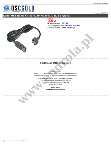 Informacje o produkcie Utworzono 02-03-2017 Kabel USB Nokia CA-53 6230i 6280 N70 N73 oryginał Cena : 15,00 zł ro la .p l Nr katalogowy : 00752 Stan magazynowy : bardzo wysoki Średnia ocena : brak recenzji nd ORYGINALNY KABEL NOKIA CA-53 w .a Kompatybilność: Nokia 3230 3230 3230 3250 3250 3300 5500 Sport 6085 6086 6111 6125 6131 6136 6151 6170 6230 6230i 6233 6234 6260 6270 6282 6288 6630 6650 6670 6680 7270 7370 7373 7610 7710 9300 9300i 9500 E50 E60 E61 E61i E65 E70 N70 N71 N72 N73 N80 N90 N91 N92 N93 N93i w w Stan: Nowy Opakowanie: Bulk (folia) Wygenerowano w programie www.oscGold.com
