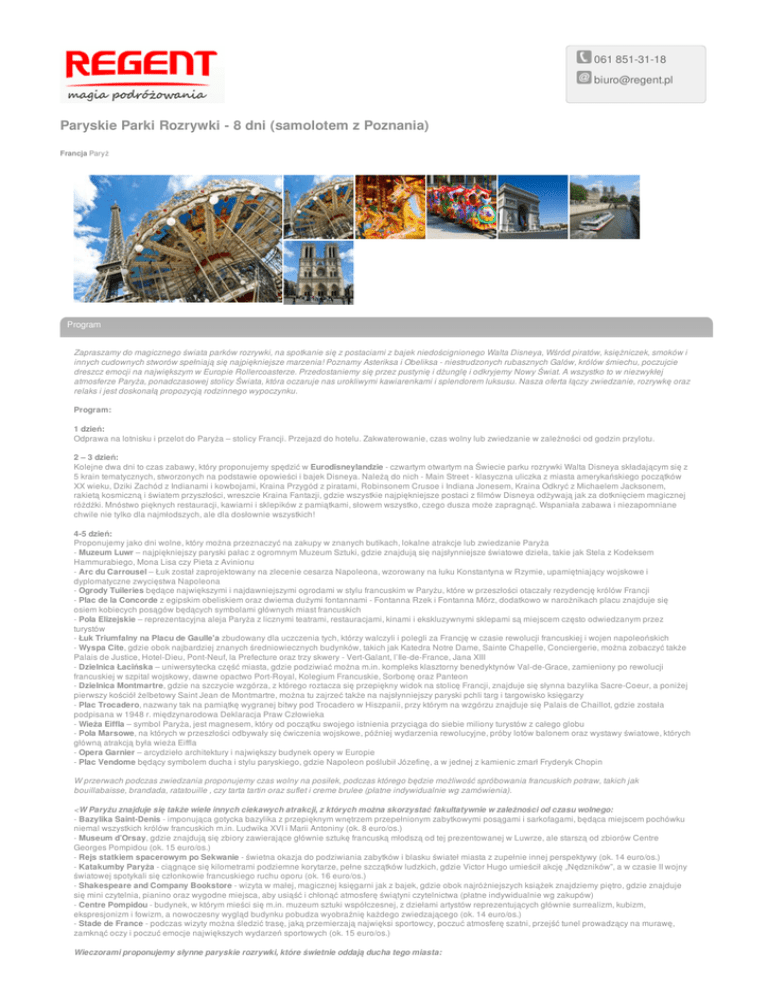 061 851-31-18 [email protected] Paryskie Parki Rozrywki - 8 dni (samolotem z Poznania) Francja Paryż Program Zapraszamy do magicznego świata parków rozrywki, na spotkanie się z postaciami z bajek niedoścignionego Walta Disneya, Wśród piratów, księżniczek, smoków i innych cudownych stworów spełniają się najpiękniejsze marzenia! Poznamy Asteriksa i Obeliksa - niestrudzonych rubasznych Galów, królów śmiechu, poczujcie dreszcz emocji na największym w Europie Rollercoasterze. Przedostaniemy się przez pustynię i dżunglę i odkryjemy Nowy Świat. A wszystko to w niezwykłej atmosferze Paryża, ponadczasowej stolicy Świata, która oczaruje nas urokliwymi kawiarenkami i splendorem luksusu. Nasza oferta łączy zwiedzanie, rozrywkę oraz relaks i jest doskonałą propozycją rodzinnego wypoczynku. Program: 1 dzień: Odprawa na lotnisku i przelot do Paryża – stolicy Francji. Przejazd do hotelu. Zakwaterowanie, czas wolny lub zwiedzanie w zależności od godzin przylotu. 2 – 3 dzień: Kolejne dwa dni to czas zabawy, który proponujemy spędzić w Eurodisneylandzie - czwartym otwartym na Świecie parku rozrywki Walta Disneya składającym się z 5 krain tematycznych, stworzonych na podstawie opowieści i bajek Disneya. Należą do nich - Main Street - klasyczna uliczka z miasta amerykańskiego początków XX wieku, Dziki Zachód z Indianami i kowbojami, Kraina Przygód z piratami, Robinsonem Crusoe i Indiana Jonesem, Kraina Odkryć z Michaelem Jacksonem, rakietą kosmiczną i światem przyszłości, wreszcie Kraina Fantazji, gdzie wszystkie najpiękniejsze postaci z filmów Disneya odżywają jak za dotknięciem magicznej różdżki. Mnóstwo pięknych restauracji, kawiarni i sklepików z pamiątkami, słowem wszystko, czego dusza może zapragnąć. Wspaniała zabawa i niezapomniane chwile nie tylko dla najmłodszych, ale dla dosłownie wszystkich! 4-5 dzień: Proponujemy jako dni wolne, który można przeznaczyć na zakupy w znanych butikach, lokalne atrakcje lub zwiedzanie Paryża - Muzeum Luwr – najpiękniejszy paryski pałac z ogromnym Muzeum Sztuki, gdzie znajdują się najsłynniejsze światowe dzieła, takie jak Stela z Kodeksem Hammurabiego, Mona Lisa czy Pieta z Avinionu - Arc du Carrousel – Łuk został zaprojektowany na zlecenie cesarza Napoleona, wzorowany na łuku Konstantyna w Rzymie, upamiętniający wojskowe i dyplomatyczne zwycięstwa Napoleona - Ogrody Tuileries będące największymi i najdawniejszymi ogrodami w stylu francuskim w Paryżu, które w przeszłości otaczały rezydencję królów Francji - Plac de la Concorde z egipskim obeliskiem oraz dwiema dużymi fontannami - Fontanna Rzek i Fontanna Mórz, dodatkowo w narożnikach placu znajduje się osiem kobiecych posągów będących symbolami głównych miast francuskich - Pola Elizejskie – reprezentacyjna aleja Paryża z licznymi teatrami, restauracjami, kinami i ekskluzywnymi sklepami są miejscem często odwiedzanym przez turystów - Łuk Triumfalny na Placu de Gaulle'a zbudowany dla uczczenia tych, którzy walczyli i polegli za Francję w czasie rewolucji francuskiej i wojen napoleońskich - Wyspa Cite, gdzie obok najbardziej znanych średniowiecznych budynków, takich jak Katedra Notre Dame, Sainte Chapelle, Conciergerie, można zobaczyć także Palais de Justice, Hotel-Dieu, Pont-Neuf, la Prefecture oraz trzy skwery - Vert-Galant, l’Ile-de-France, Jana XIII - Dzielnica Łacińska – uniwersytecka część miasta, gdzie podziwiać można m.in. kompleks klasztorny benedyktynów Val-de-Grace, zamieniony po rewolucji francuskiej w szpital wojskowy, dawne opactwo Port-Royal, Kolegium Francuskie, Sorbonę oraz Panteon - Dzielnica Montmartre, gdzie na szczycie wzgórza, z którego roztacza się przepiękny widok na stolicę Francji, znajduje się słynna bazylika Sacre-Coeur, a poniżej pierwszy kościół żelbetowy Saint Jean de Montmartre, można tu zajrzeć także na najsłynniejszy paryski pchli targ i targowisko księgarzy - Plac Trocadero, nazwany tak na pamiątkę wygranej bitwy pod Trocadero w Hiszpanii, przy którym na wzgórzu znajduje się Palais de Chaillot, gdzie została podpisana w 1948 r. międzynarodowa Deklaracja Praw Człowieka - Wieża Eiffla – symbol Paryża, jest magnesem, który od początku swojego istnienia przyciąga do siebie miliony turystów z całego globu - Pola Marsowe, na których w przeszłości odbywały się ćwiczenia wojskowe, później wydarzenia rewolucyjne, próby lotów balonem oraz wystawy światowe, których główną atrakcją była wieża Eiffla - Opera Garnier – arcydzieło architektury i największy budynek opery w Europie - Plac Vendome będący symbolem ducha i stylu paryskiego, gdzie Napoleon poślubił Józefinę, a w jednej z kamienic zmarł Fryderyk Chopin W przerwach podczas zwiedzania proponujemy czas wolny na posiłek, podczas którego będzie możliwość spróbowania francuskich potraw, takich jak bouillabaisse, brandada, ratatouille , czy tarta tartin oraz suflet i creme brulee (płatne indywidualnie wg zamówienia). <W Paryżu znajduje się także wiele innych ciekawych atrakcji, z których można skorzystać fakultatywnie w zależności od czasu wolnego: - Bazylika Saint-Denis - imponująca gotycka bazylika z przepięknym wnętrzem przepełnionym zabytkowymi posągami i sarkofagami, będąca miejscem pochówku niemal wszystkich królów francuskich m.in. Ludwika XVI i Marii Antoniny (ok. 8 euro/os.) - Museum d’Orsay, gdzie znajdują się zbiory zawierające głównie sztukę francuską młodszą od tej prezentowanej w Luwrze, ale starszą od zbiorów Centre Georges Pompidou (ok. 15 euro/os.) - Rejs statkiem spacerowym po Sekwanie - świetna okazja do podziwiania zabytków i blasku świateł miasta z zupełnie innej perspektywy (ok. 14 euro/os.) - Katakumby Paryża - ciągnące się kilometrami podziemne korytarze, pełne szczątków ludzkich, gdzie Victor Hugo umieścił akcję „Nędzników”, a w czasie II wojny świa