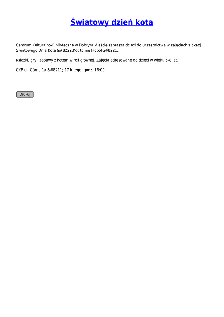 Światowy dzień kota Centrum Kulturalno-Biblioteczne w Dobrym Mieście zaprasza dzieci do uczestnictwa w zajęciach z okazji Światowego Dnia Kota „Kot to nie kłopot”. Książki, gry i zabawy z kotem w roli głównej. Zajęcia adresowane do dzieci w wieku 5-8 lat. CKB ul. Górna 1a – 17 lutego, godz. 16:00. Drukuj