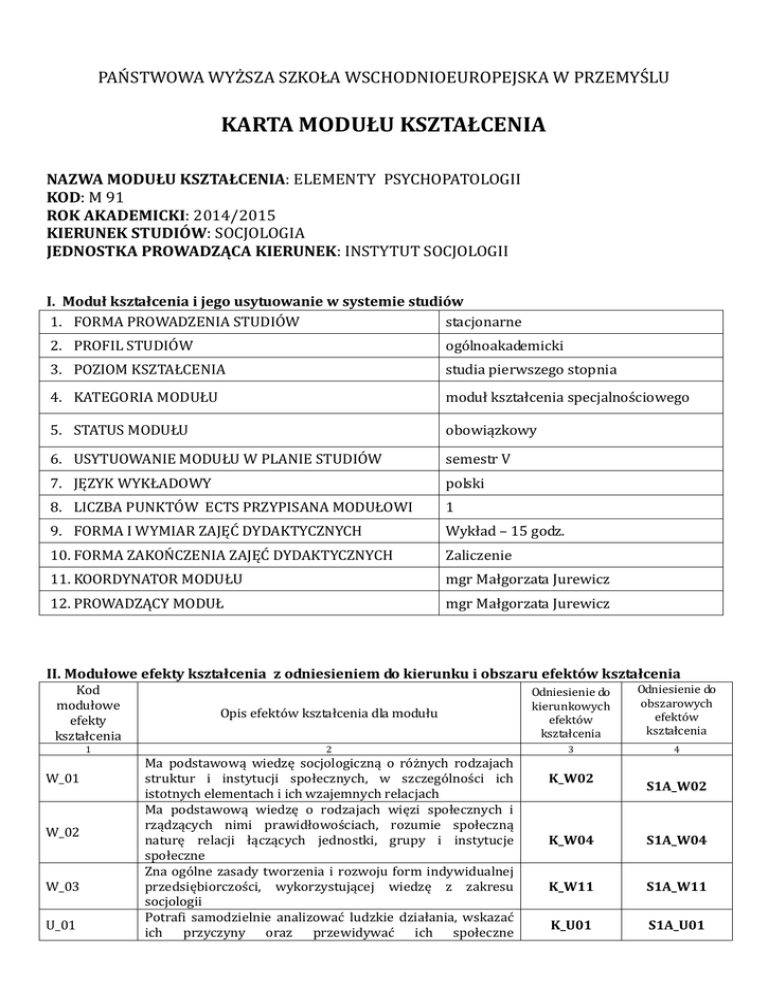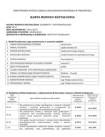 PAŃSTWOWA WYŻSZA SZKOŁA WSCHODNIOEUROPEJSKA W PRZEMYŚLU KARTA MODUŁU KSZTAŁCENIA NAZWA MODUŁU KSZTAŁCENIA: ELEMENTY PSYCHOPATOLOGII KOD: M 91 ROK AKADEMICKI: 2014/2015 KIERUNEK STUDIÓW: SOCJOLOGIA JEDNOSTKA PROWADZĄCA KIERUNEK: INSTYTUT SOCJOLOGII I. Moduł kształcenia i jego usytuowanie w systemie studiów 1. FORMA PROWADZENIA STUDIÓW stacjonarne 2. PROFIL STUDIÓW ogólnoakademicki 3. POZIOM KSZTAŁCENIA studia pierwszego stopnia 4. KATEGORIA MODUŁU moduł kształcenia specjalnościowego 5. STATUS MODUŁU obowiązkowy 6. USYTUOWANIE MODUŁU W PLANIE STUDIÓW semestr V 7. JĘZYK WYKŁADOWY polski 8. LICZBA PUNKTÓW ECTS PRZYPISANA MODUŁOWI 1 9. FORMA I WYMIAR ZAJĘĆ DYDAKTYCZNYCH Wykład – 15 godz. 10. FORMA ZAKOŃCZENIA ZAJĘĆ DYDAKTYCZNYCH Zaliczenie 11. KOORDYNATOR MODUŁU mgr Małgorzata Jurewicz 12. PROWADZĄCY MODUŁ mgr Małgorzata Jurewicz II. Modułowe efekty kształcenia z odniesieniem do kierunku i obszaru efektów kształcenia Kod modułowe efekty kształcenia 1 W_01 W_02 W_03 U_01 Opis efektów kształcenia dla modułu Odniesienie do kierunkowych efektów kształcenia Odniesienie do obszarowych efektów kształcenia 2 3 4 Ma podstawową wiedzę socjologiczną o różnych rodzajach struktur i instytucji społecznych, w szczególności ich istotnych elementach i ich wzajemnych relacjach Ma podstawową wiedzę o rodzajach więzi społecznych i rządzących nimi prawidłowościach, rozumie społeczną naturę relacji łączących jednostki, grupy i instytucje społeczne Zna ogólne zasady tworzenia i rozwoju form indywidualnej przedsiębiorczości, wykorzystującej wiedzę z zakresu socjologii Potrafi samodzielnie analizować ludzkie działania, wskazać ich przyczyny oraz przewidywać ich społeczne K_W02 S1A_W02 K_W04 S1A_W04 K_W11 S1A_W11 K_U01 S1A_U01 konsekwencje. U_02 Wykorzystuje zdobytą wiedzę do formułowania sądów na temat ludzkiego działania oraz przewidywania jego społecznych konsekwencji. K_U06 S1A_U06 K_01 Potrafi myśleć i działać w sposób przedsiębiorczy. K_K07 S1A_K07 III. Treści kształcenia – oddzielnie dla każdej formy zajęć dydaktycznych (W – wykład; C - ćwiczenia; K – konwersatorium; L - laboratorium; PR – projekt, PKZ - praktyka zawodowa; WT – Warsztat) Kod form zajęć dydaktyczny ch Szczegółowy opis treści realizowanych w ramach zajęć wg form zajęć dydaktycznych Liczba godzin 2 3 1 W1 W2 W3 W4 W5 W6 W7 W8 wykład Wprowadzenie do problematyki zajęć. Schizofrenia , psychopatologia rozszczepienna, prymitywne mechanizmy obronne typu identyfikacja projekcyjna, zaprzeczenia, prymitywna idealizacja, projekcja psychotyczna. Psychozy wywołane substancjami psyochoaktywnymi ,zespół uzależnienia , zespoły organiczne Depresja psychotyczna, wielka depresja, depresja dwubiegunowa, objawy ,kliniczne opisy przypadków, współczesne koncepcje przyczyn powstania zaburzenia, koncepcje terapeutyczne,mechanizmy obronne w depresji Zaburzenia osobowości ; psychopatia, perwersja, pedofilia, zaburzenia z pogranicza ,zaburzenia narcystyczne, osobowość histioniczna , ,mechanizmy obronne, kliniczne opisy przypadku Neurotyczność i zaburzenia nerwicowe; nerwica lękowa, obsesyjno kompulsywna, histeryczna,konwersyjna, mechanizmy obronne w nerwicy, kliniczne opisy przypadku Zaburzenia jedzenia; anoreksja i bulimia Objawy pozytywne i negatywne ,objawy zwiastunowe, zespoły obsesyjno kompulsywne ,współczesne koncepcje okien powstania psychoz , koncepcje terapeutyczne Razem IV. Literatura obowiązująca do zaliczenia modułu Literatura podstawowa 1. 2. 3. 4. 5. James J.N., Psychologia Zaburzeń Aleksandrowicz J., Psychoterapia Bilikiewicz A., Landowski J., Radzilowicz P., Psychiatria repetytoriom Bilikiewicz A., Psychopatologia z elementami psychiatrii Namysłowska I., (red.) Psychiatria dla dzieci i młodzieży Literatura uzupełniająca 1. 2. 3. 4. Leiblum S. R., (red.)Terapia zaburzeń seksualnych Preston J., Pokonać depresję Goldstein E. G., Zaburzenia z pogranicza Babikiem G., Autoagresja 5. Herman J., Przemoc 1 2 2 2 2 2 2 2 15