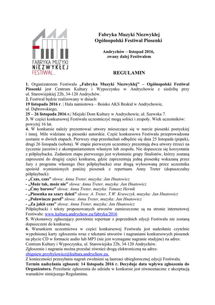 Fabryka Muzyki Niezwykłej Ogólnopolski Festiwal Piosenki Andrychów – listopad 2016, zwany dalej Festiwalem REGULAMIN 1. Organizatorem Festiwalu „Fabryka Muzyki Niezwykłej” – Ogólnopolski Festiwal Piosenki jest Centrum Kultury i Wypoczynku w Andrychowie z siedzibą przy ul. Starowiejskiej 22b, 34-120 Andrychów. 2. Festiwal będzie realizowany w dniach: 19 listopada 2016 r. | Hala namiotowa – Boisko AKS Beskid w Andrychowie, ul. Dąbrowskiego, 25 – 26 listopada 2016 r.| Miejski Dom Kultury w Andrychowie, ul. Szewska 7. 3. W części konkursowej Festiwalu uczestniczyć mogą soliści i zespoły. Wiek uczestników: powyżej 16 lat. 4. W konkursie należy prezentować utwory mieszczące się w nurcie piosenki poetyckiej i innej. Mile widziane są piosenki autorskie. Część konkursowa Festiwalu przeprowadzona zostanie w dwóch etapach. Pierwszy etap przesłuchań odbędzie się dnia 25 listopada (piątek), drugi 26 listopada (sobota). W etapie pierwszym uczestnicy prezentują dwa utwory (trzeci na życzenie jurorów) z akompaniamentem własnym lub zespołu. Nie dopuszcza się korzystania z półplaybacku. Zadaniem etapu pierwszego jest wyłonienie grupy finalistów, którzy zostaną zaproszeni do drugiej części konkursu, gdzie zaprezentują jedną piosenkę wskazaną przez Jury z programu własnego (bez półplaybacku) oraz drugą wylosowaną przez uczestnika spośród wymienionych poniżej piosenek z repertuaru Anny Treter (dopuszczalny półplayback): - „Czas, czas” słowa: Anna Treter, muzyka: Jan Hnatowicz - „Może tak, może nie” słowa: Anna Treter, muzyka: Jan Hnatowicz - „Ćmy barowe” słowa: Anna Treter, muzyka: Tomasz Hernik - „Piosenka na szary dzień” słowa: A. Treter, T.W. Krawczyk, muzyka: Jan Hnatowicz - „Poławiacze pereł” słowa: Anna Treter, muzyka: Jan Hnatowicz - „Za jakiś czas” słowa: Anna Treter, muzyka: Jan Hnatowicz Półplaybacki i teksty proponowanych utworów zamieszczone są na stronie internetowej Festiwalu: www.kultura.andrychow.eu/fabryka/2016 5. Wykonawcy zgłaszający powtórnie repertuar z poprzednich edycji Festiwalu nie zostaną dopuszczeni do konkursu. 6. Warunkiem uczestnictwa w części konkursowej Festiwalu jest nadesłanie czytelnie wypełnionej karty zgłoszenia wraz z tekstami utworów i nagraniami konkursowych piosenek na płycie CD w formacie audio lub MP3 (nie jest wymagane nagranie studyjne) na adres: Centrum Kultury i Wypoczynku, ul. Starowiejska 22b, 34-120 Andrychów. Zgłoszenie i nagrania można przesłać również drogą elektroniczną na adres: [email protected]. Z konieczności przesyłania nagrań zwolnieni są laureaci ubiegłorocznej edycji Festiwalu. Termin nadsyłania zgłoszeń: 14 listopada 2016 r. Decyduje data wpływu zgłoszenia do Organizatora. Przesłanie zgłoszenia do udziału w konkursie jest równoznaczne z akceptacją warunków niniejszego Regulaminu. 7. O wynikach kwalifikacji uczestnicy zostaną powiadomieni drogą elektroniczną lub telefonicznie. Lista wykonawców zakwalifikowanych będzie zamieszczona na stronie internetowej Festiwalu: www.kultura.andrychow.eu/fabryka/2016 8. Uczestnicy zakwalifikowani do udziału w konkursie mają obowiązek do 21 listopada 2016 r. uregulować bezzwrotną opłatę wpisową w wysokości 30 zł/od osoby płatną przelewem na konto Centrum Kultury i Wypoczynku w Andrychowie: ABS Bank Spółdzielczy w Andrychowie, nr konta: 11 8110 0000 2001 0012 3350 0001. W tytule przelewu prosimy wpisać: „Opłata wpisowa – Fabryka Muzyki Niezwykłej 2016” oraz nazwę zespołu lub imię i nazwisko wykonawcy. Oryginał dokumentu przelewu należy przedstawić Organizatorowi w dniu przyjazdu. Koszty wpisowego, przejazdów i ewentualnych noclegów pokrywa instytucja delegująca lub sami uczestnicy. 9. Organizator zapewnia uczestnikom: - profesjonalne nagłośnienie, - pianino, - perkusję (bez talerzy i stopy), - wstęp na koncerty, materiały festiwalowe. 10. Kolejność występów ustala Organizator. 11. Organizator powołuje Jury, które decyduje o przyznaniu nagród. Laureaci głównych nagród zostaną zaproszeni do występu podczas Koncertu Finałowego Festiwalu – recitalu Anny Treter w sobotę 26 listopada 2016 roku. Jury kwalifikuje również do udziału w Studenckim Festiwalu Piosenki – Krakowskim Festiwalu Piosenki w Krakowie w 2017 roku. 12. Uczestnicy konkursu zobowiązani są do zgłoszenia się w Miejskim Domu Kultury w Andrychowie przy ul. Szewskiej 7 w dniu 25 listopada (piątek) w godz. 10.00 – 12.00 w celu wzięcia udziału w próbach akustycznych. 13. Organizator zastrzega sobie prawo do rejestracji występu oraz do wykorzystywania nagrań i zdjęć wykonanych w czasie Festiwalu w celach promocyjnych bez wypłacania wynagrodzeń autorom i wykonawcom. 14. Wszelkich informacji organizacyjnych udziela: Zbigniew Przybyłowicz, tel.: 512 442 916. Zapraszamy: www.kultura.andrychow.eu/fabryka